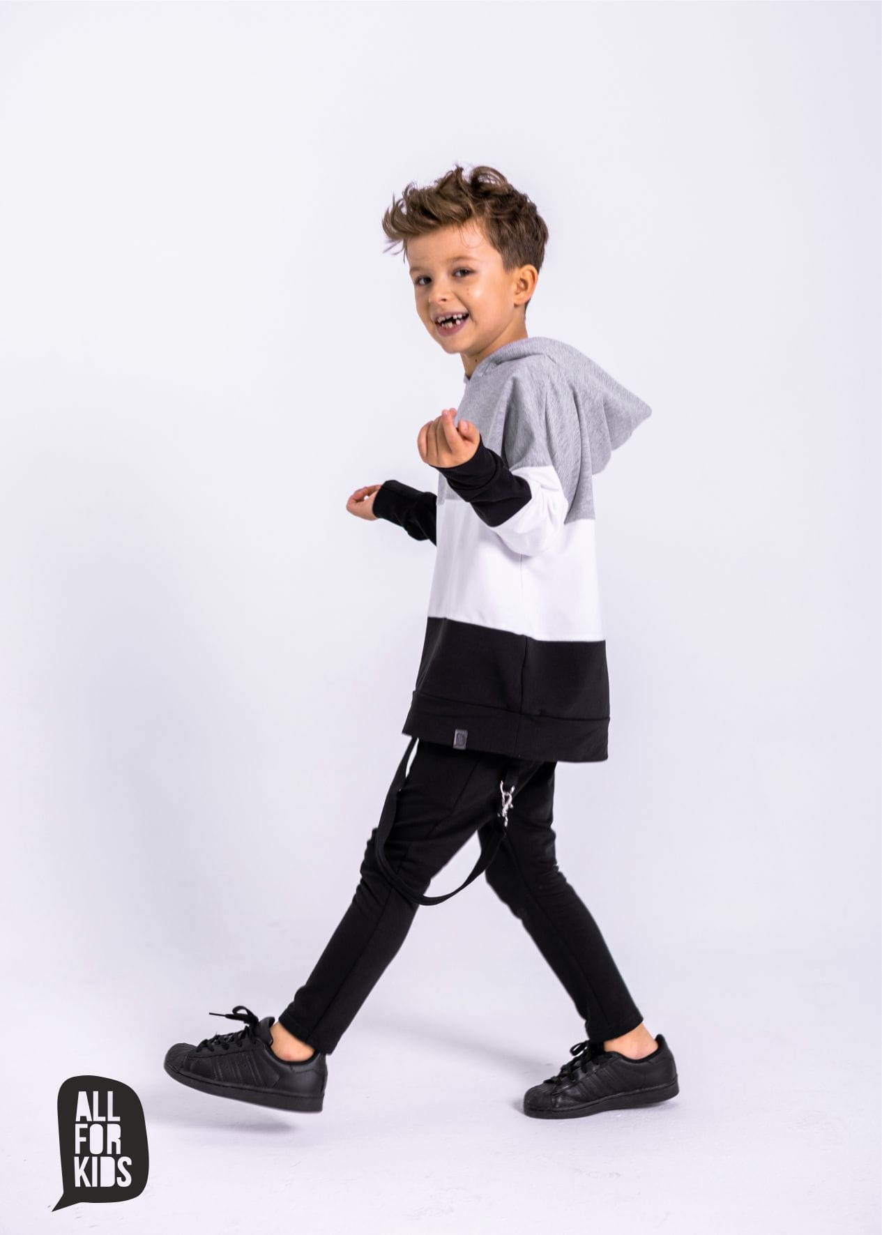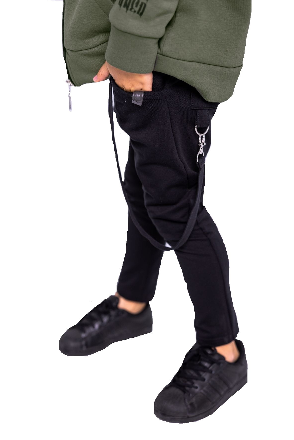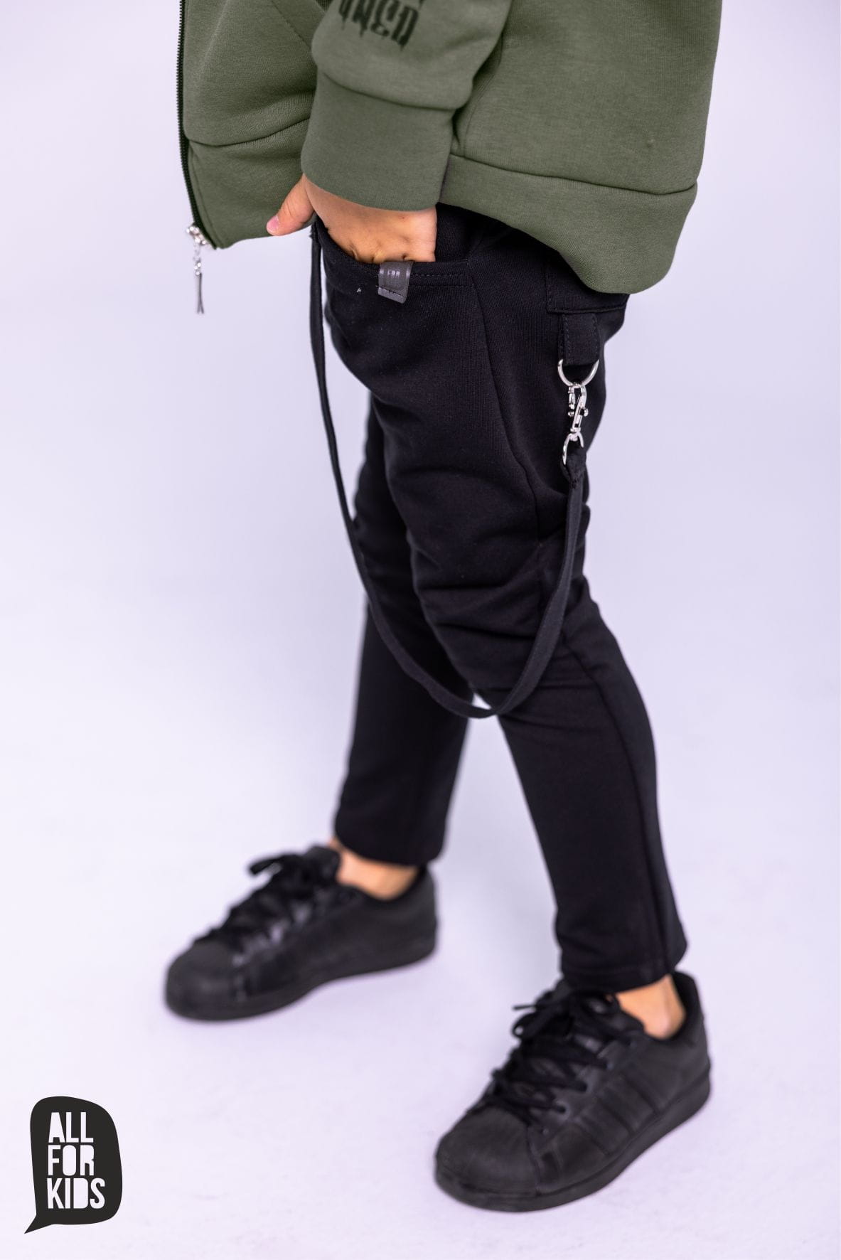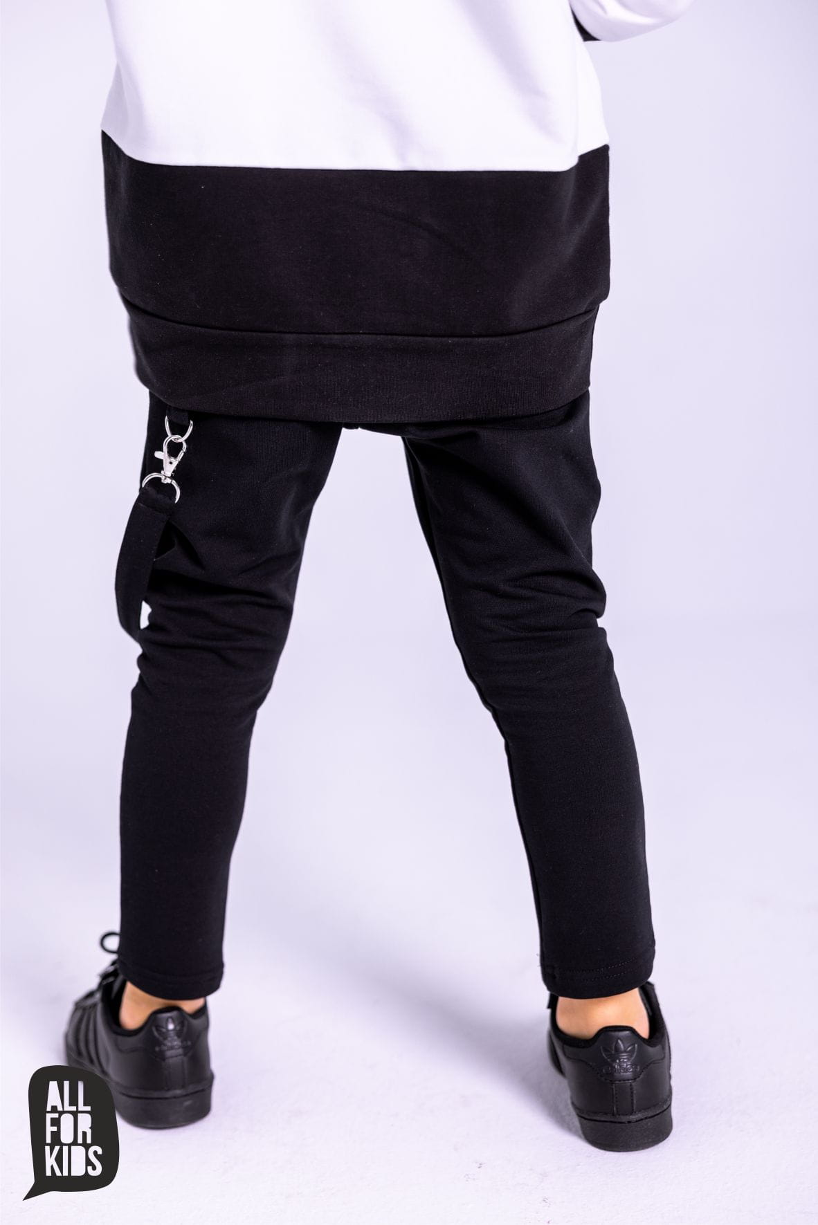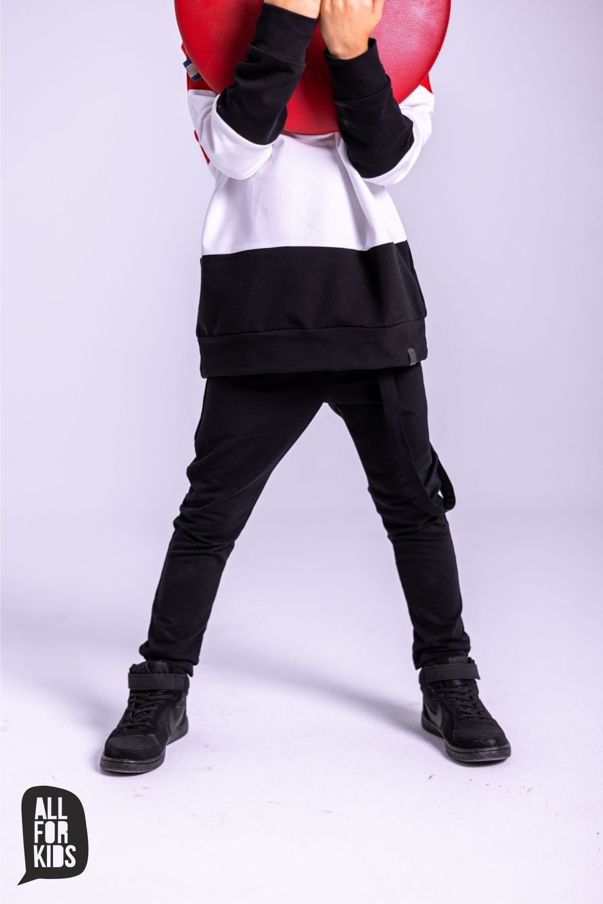 Czarne spodnie z odpinaną szelką powstały w Polsce przez markę All For Kids z dzianiny dresowej, dzięki czemu są komfortowe w noszeniu.