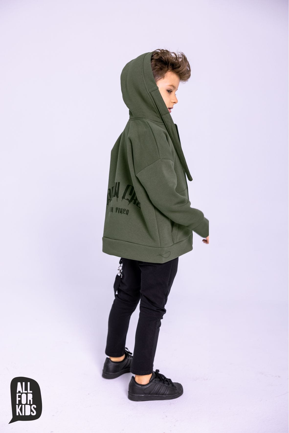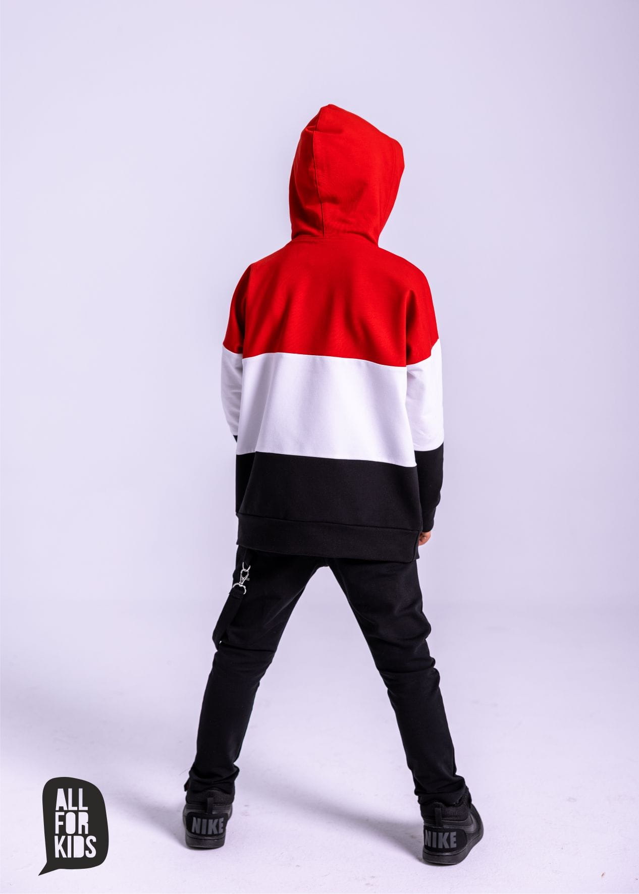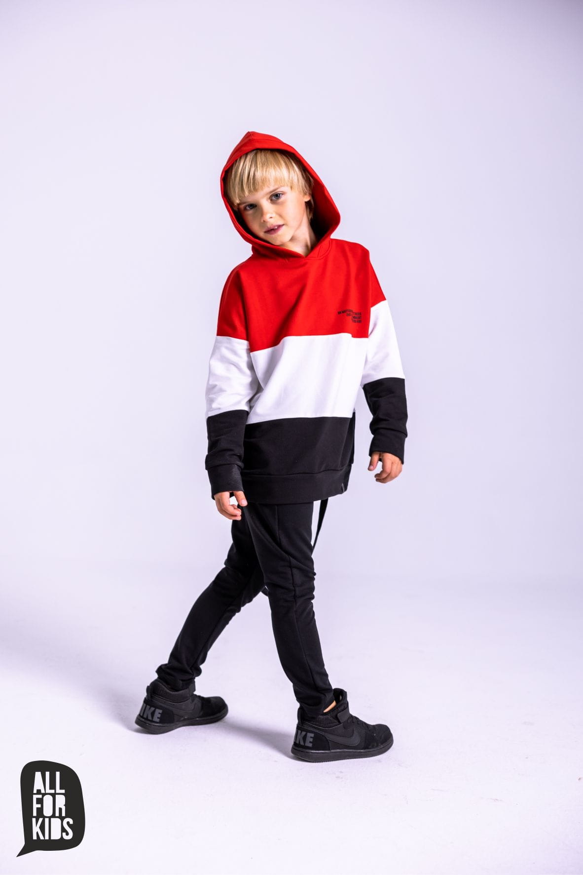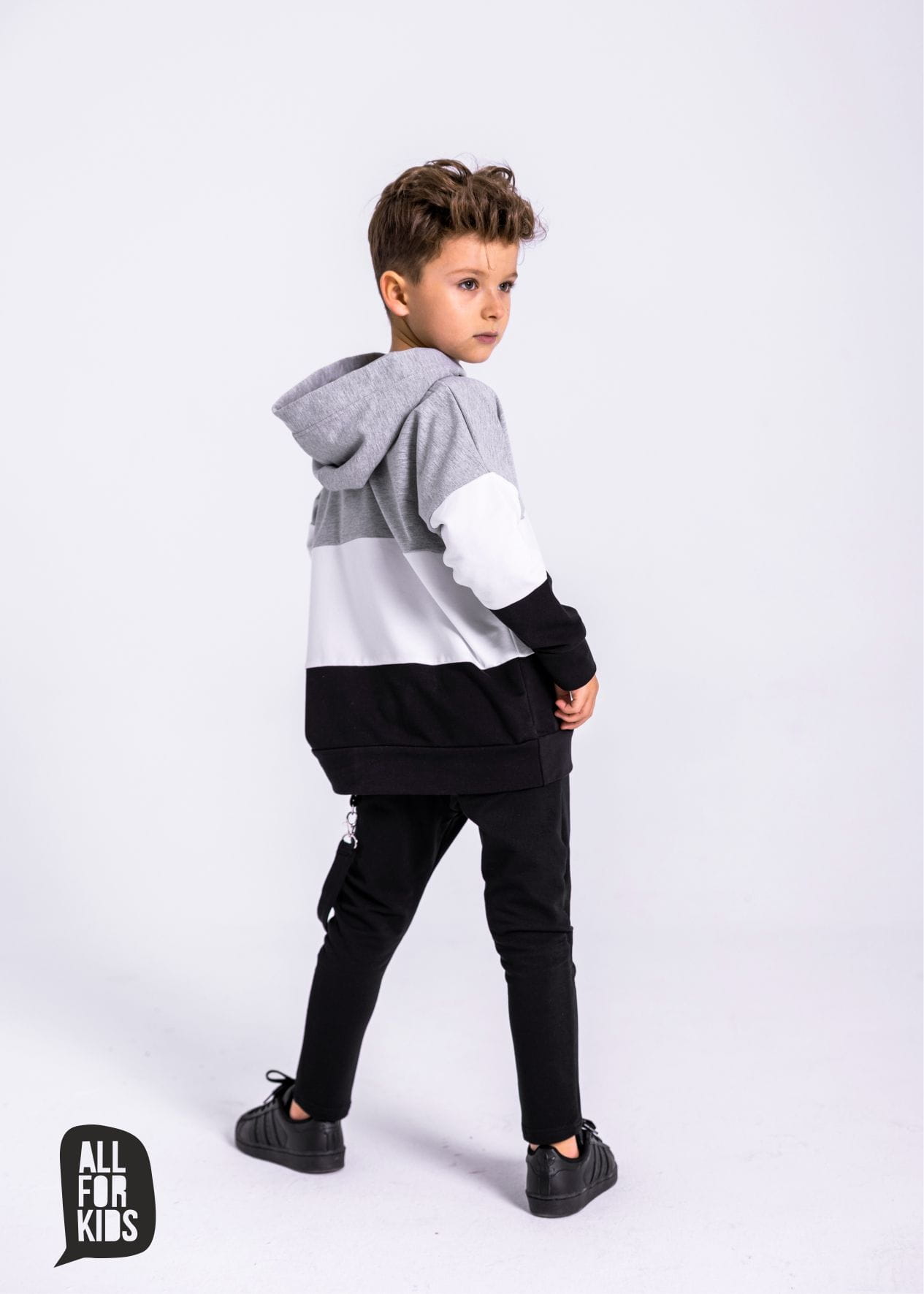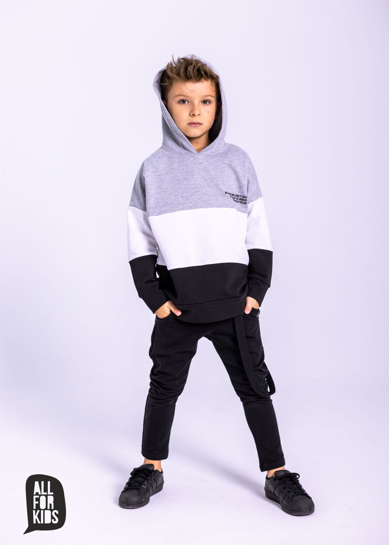 Czarne spodnie z odpinaną szelką powstały w Polsce przez markę All For Kids z dzianiny dresowej, dzięki czemu są komfortowe w noszeniu.