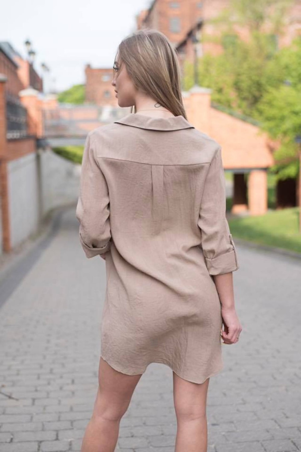 Beżowa sukienka koszulowa świetnie sprawdzi się do wielu różnych stylizacji. Jej odpowiednia długość sprawia, że możesz ją nosić jako sukienkę, długą koszulę lub tunikę. Zarówno noszona luźno jak i z paskiem stworzy wyjątkowy look. Ponadto jej niezobowiązujący charakter sprawia, iż jest idealna na wiele różnych okoliczności.