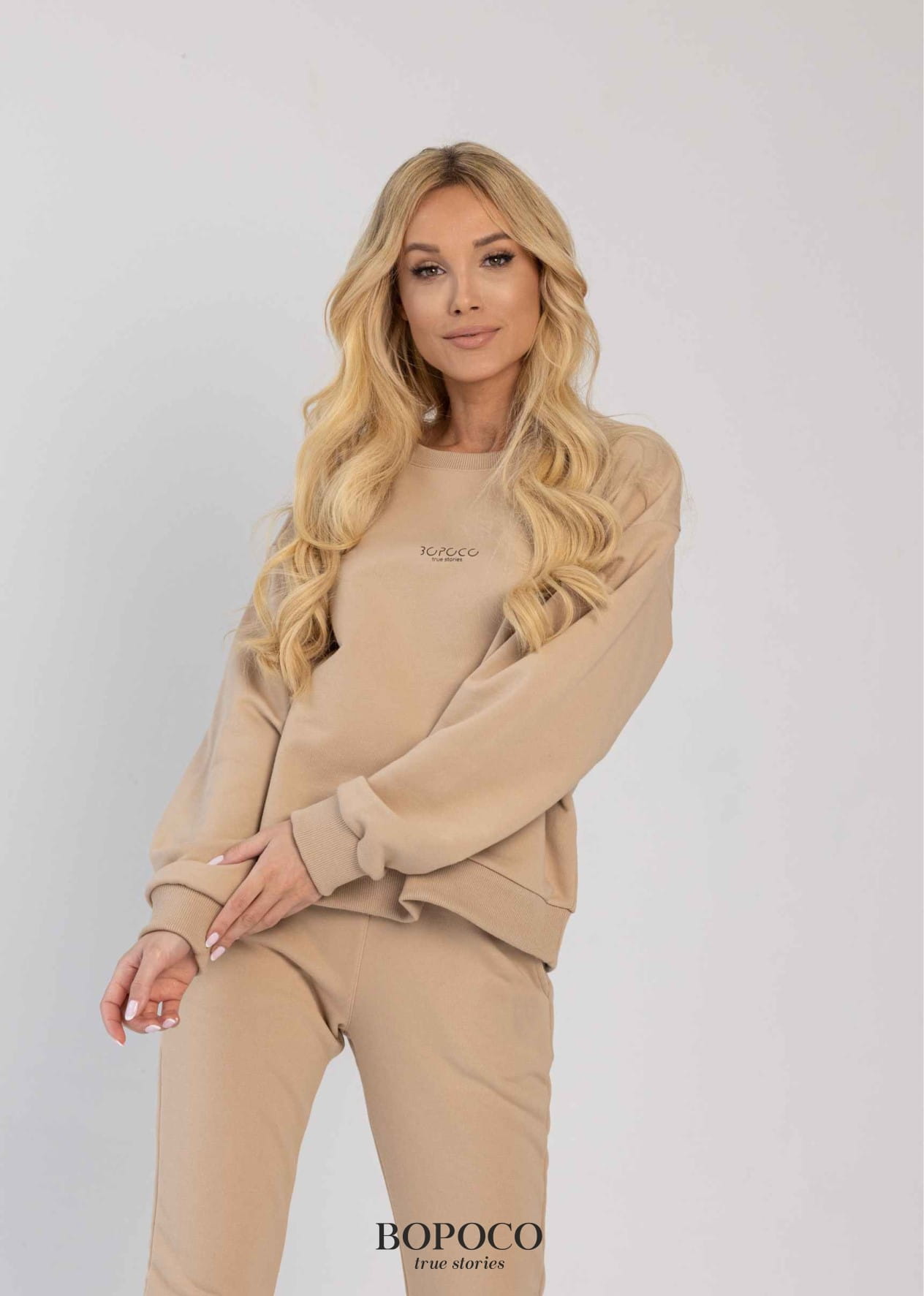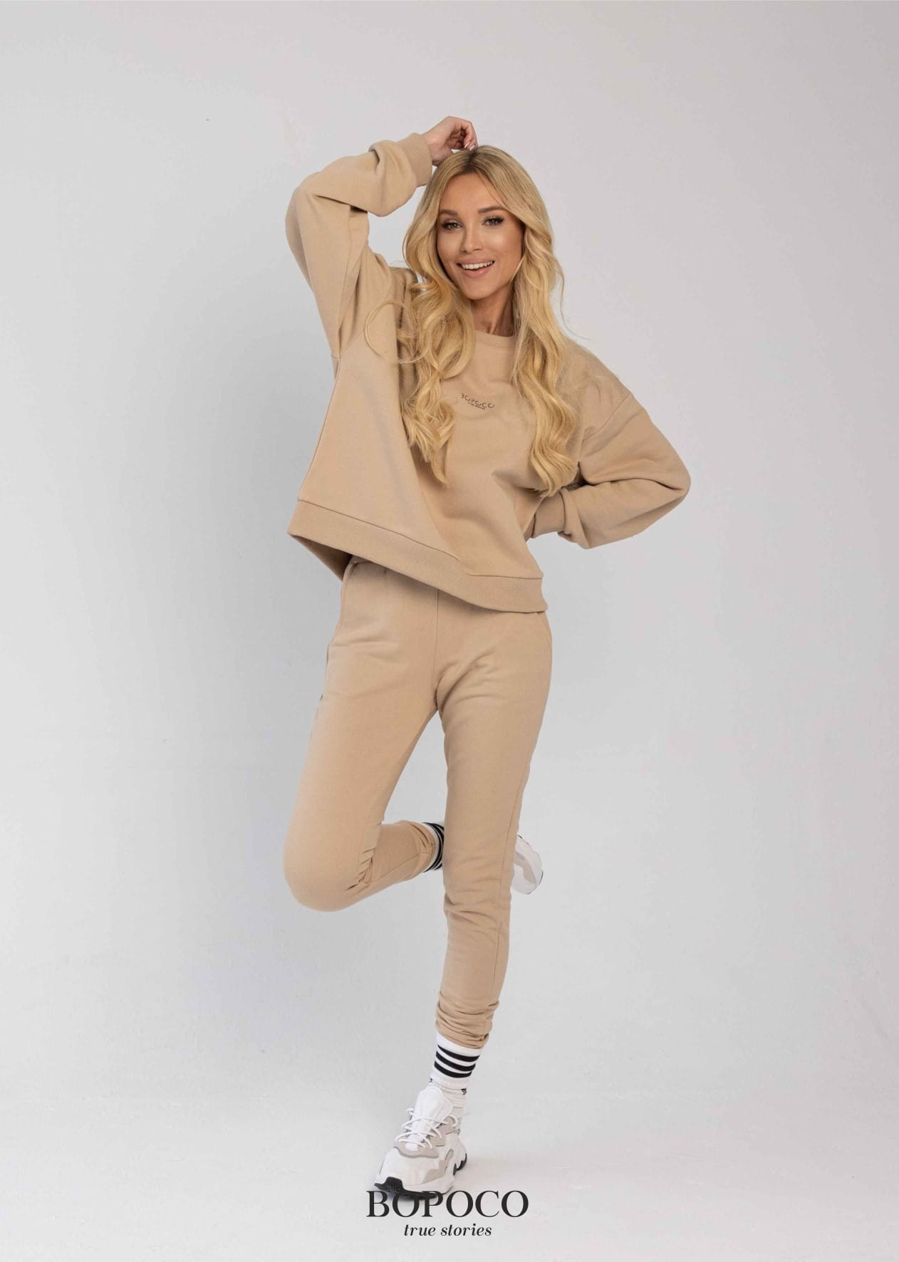 Beżowe spodnie dresowe dla fanek sportowej elegancji od polskiej marki BOPOCO true stories. Modne spodnie damskie wykonane z wysokiej jakości, komfortowej w noszeniu, grubszej dzianiny dresowej.