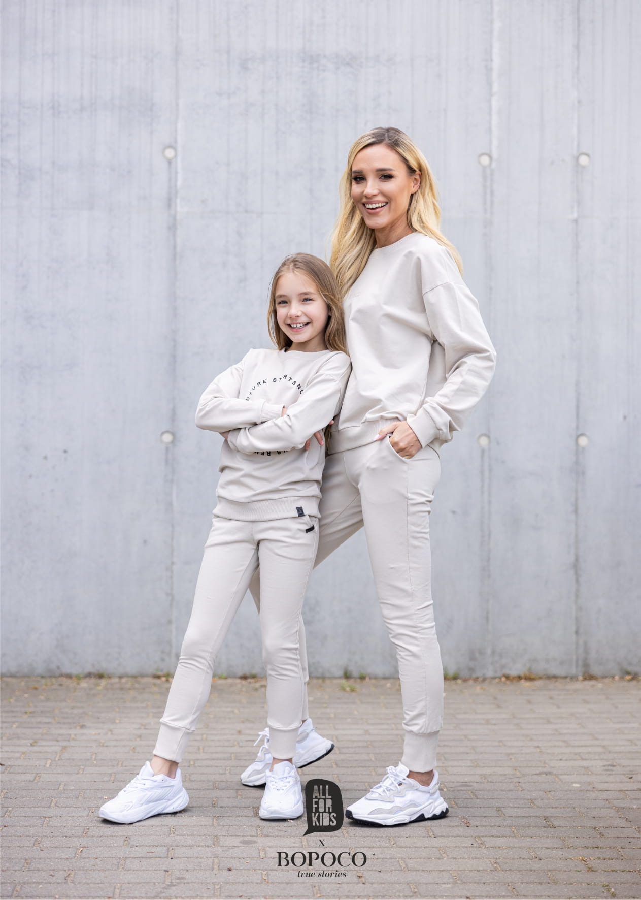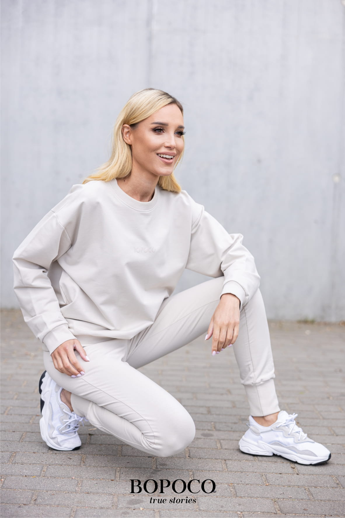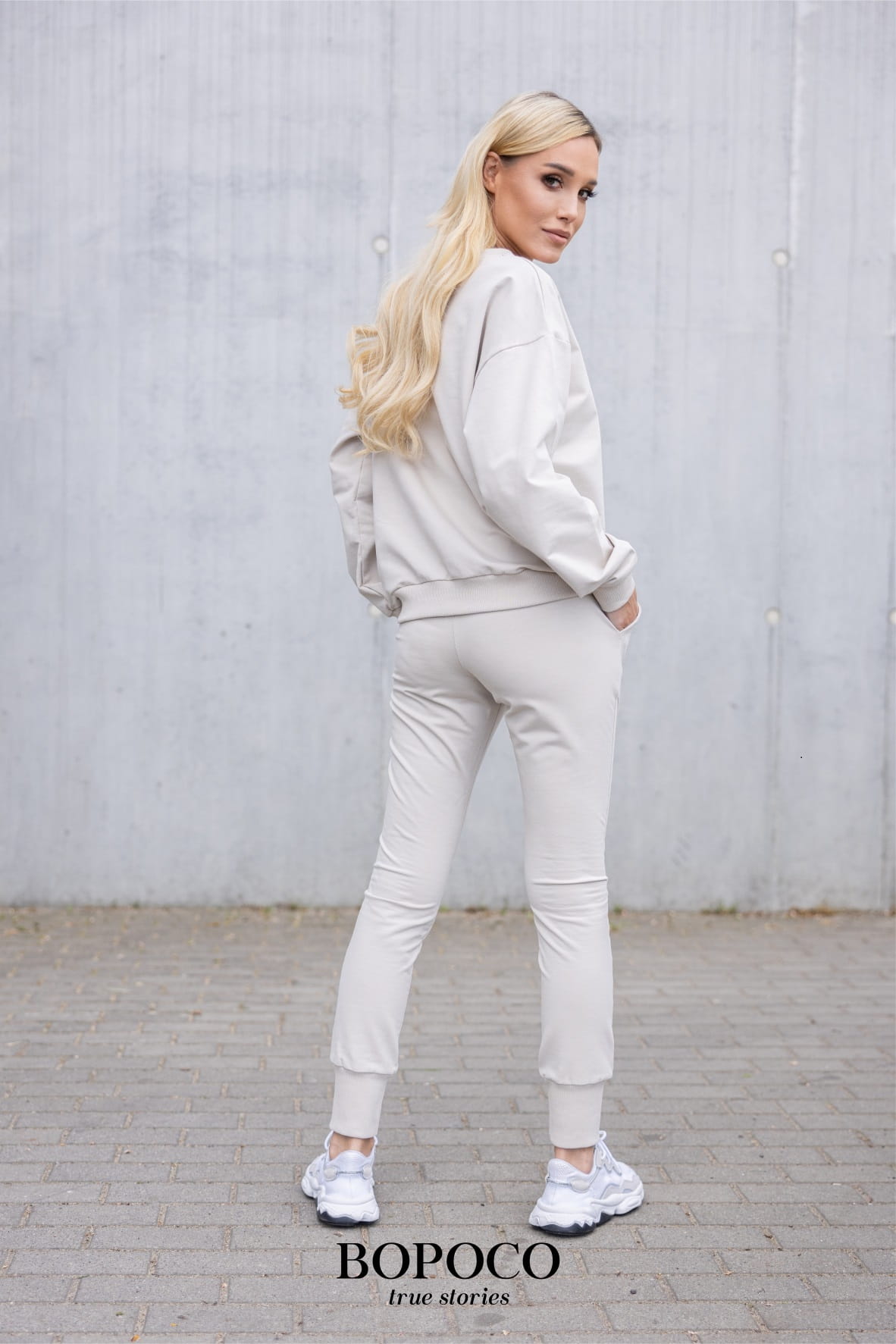 Beżowy komplet damski spodnie i bluza od polskiej marki BOPOCO true stories. Modny komplet dresowy wykonany z wysokiej jakości, komfortowej w noszeniu dzianiny dresowej.