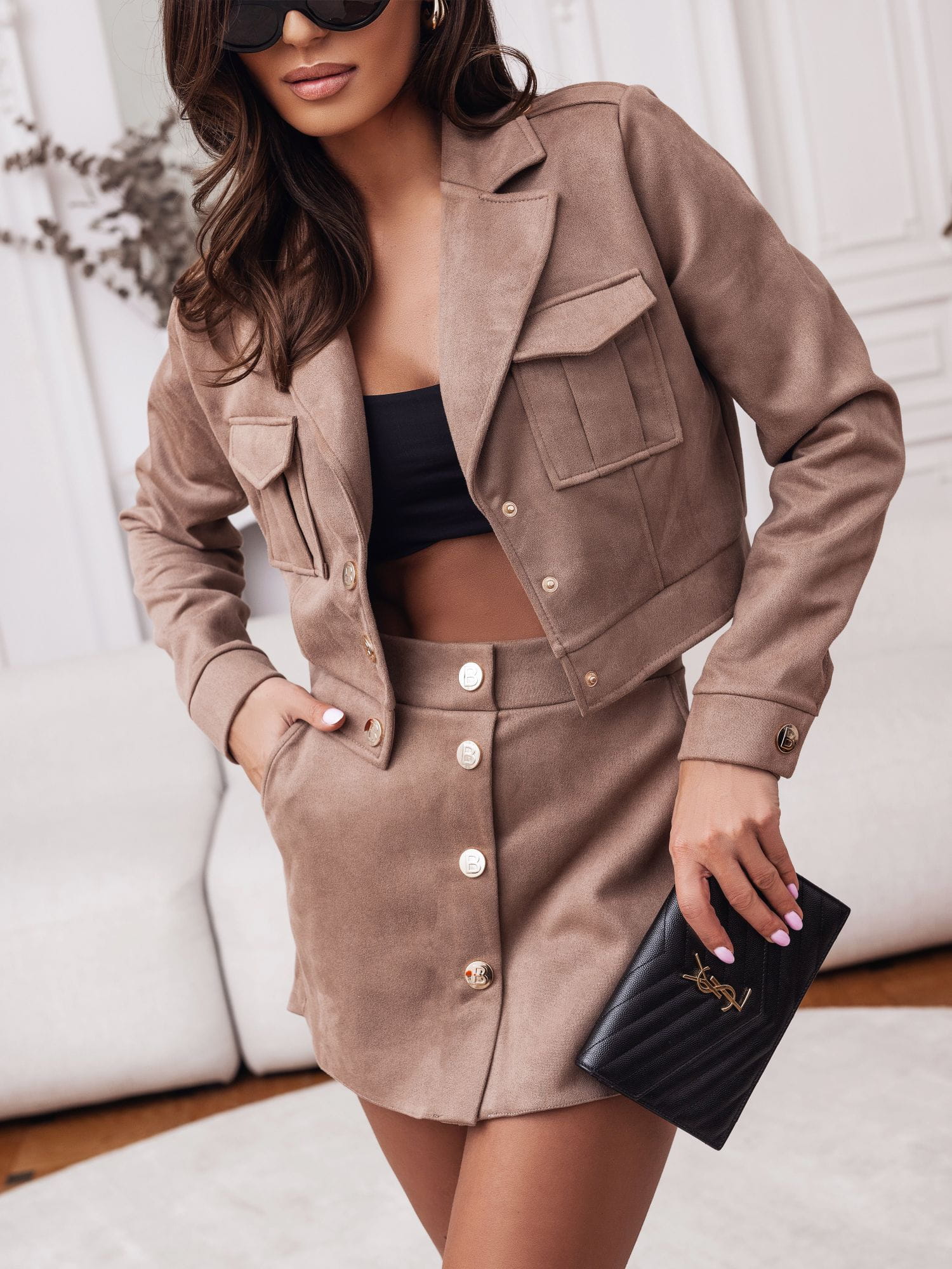 Oto elegancki i stylowy komplet zamszowy spódnico-spodenki i kurtka typu katana, stworzony przez polską markę LaBalancia, co gwarantuje wysoką jakość i dbałość o detale.