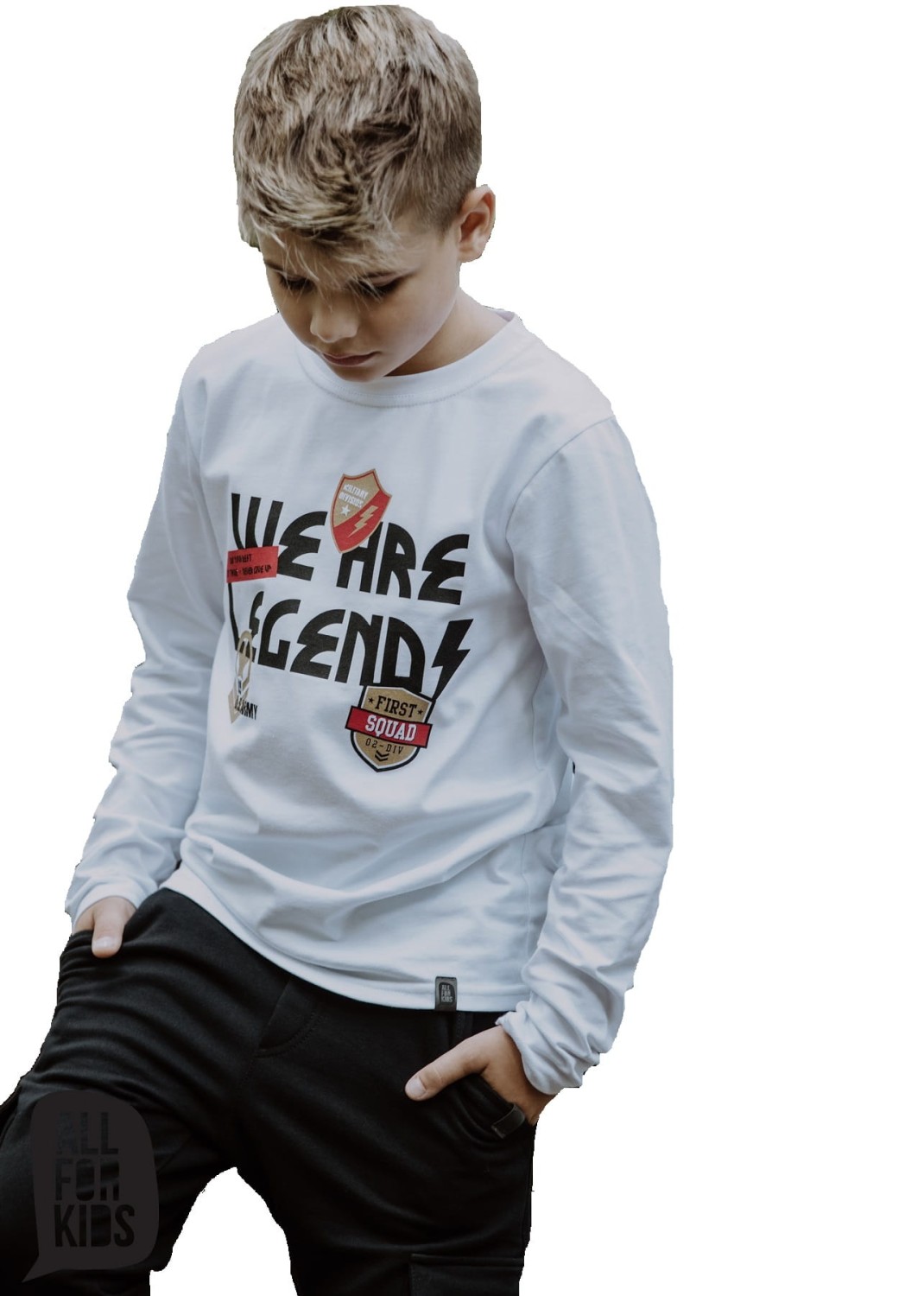 Biała bluzka z nadrukiem w stylu militarnym od polskiego producenta All For Kids. Modna bluzka dziecięca wykonana z wysokiej jakości, komfortowej w noszeniu gładkiej bawełny.