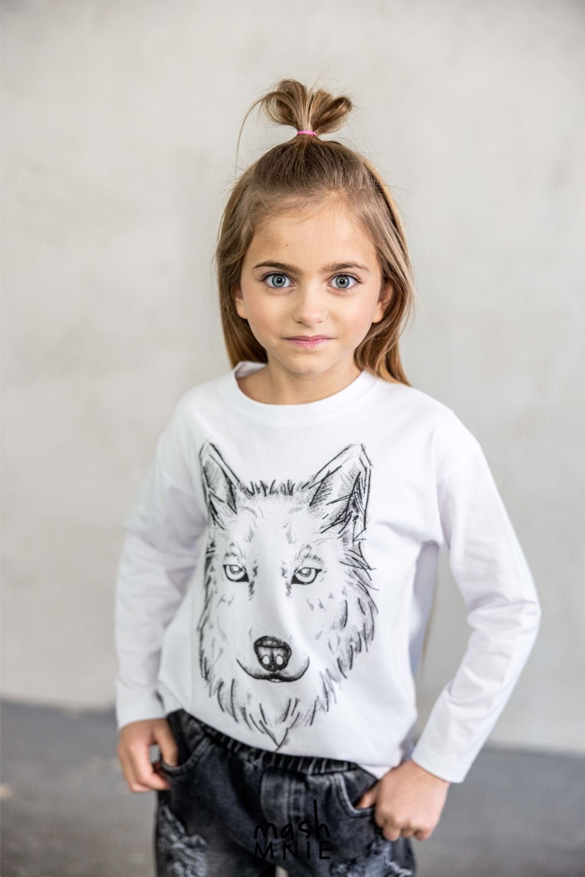Biała bluzka z wilkiem powstała w Polsce przez markę Mash MNIE z kolekcji THE WALK OF THE WOLF z komfortowej w noszeniu, gładkiej dzianiny.
