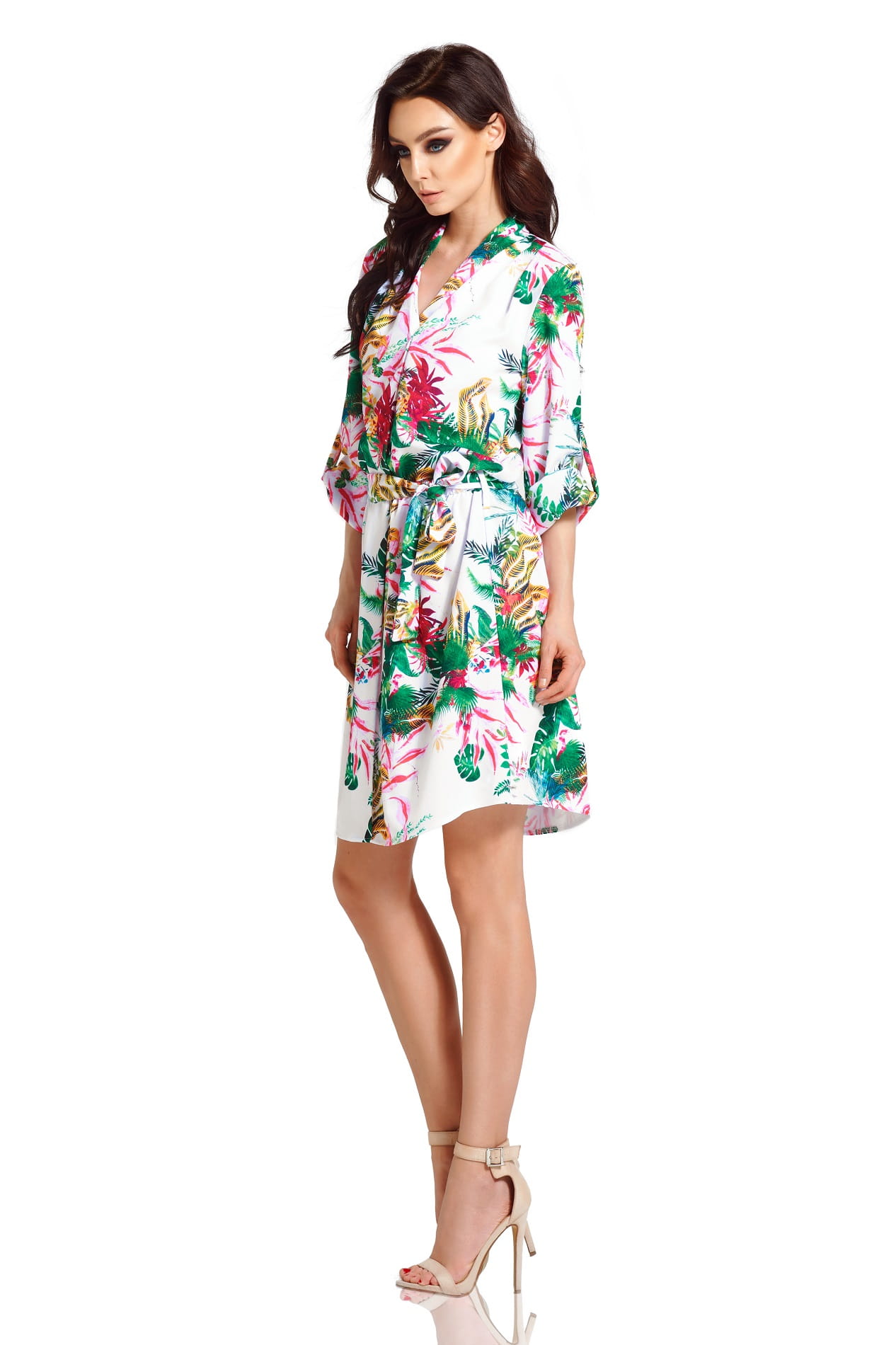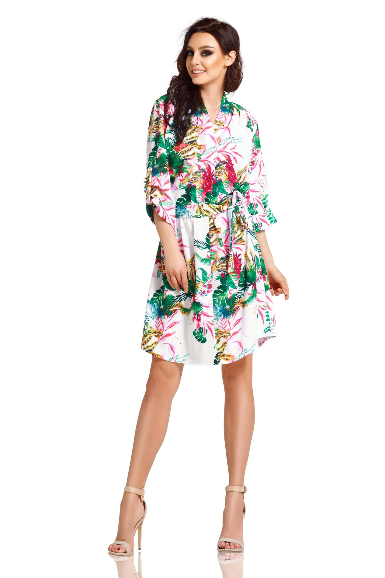 Biała sukienka w kolorowe liście posiada: