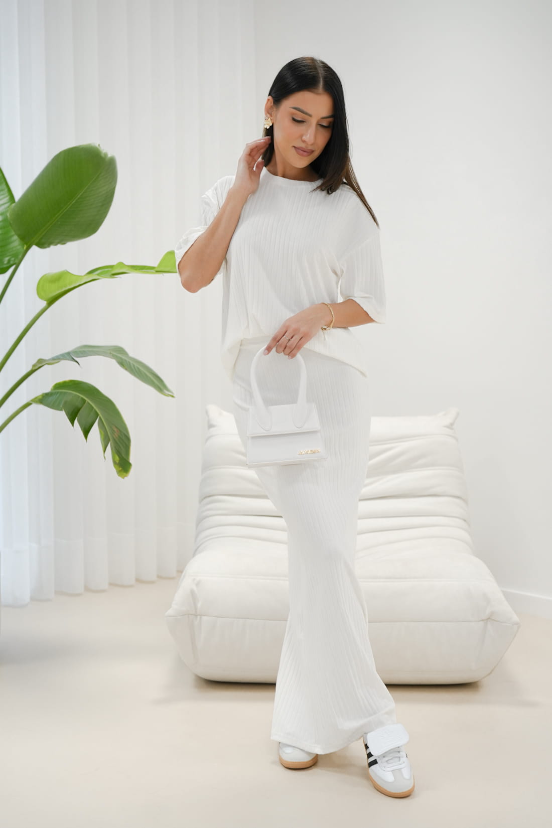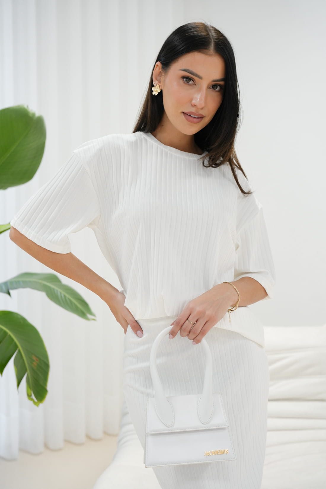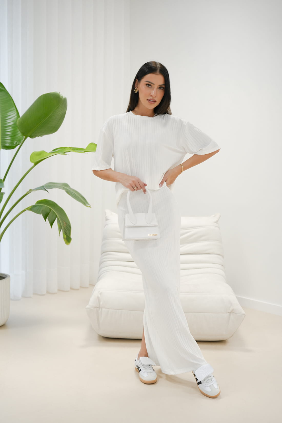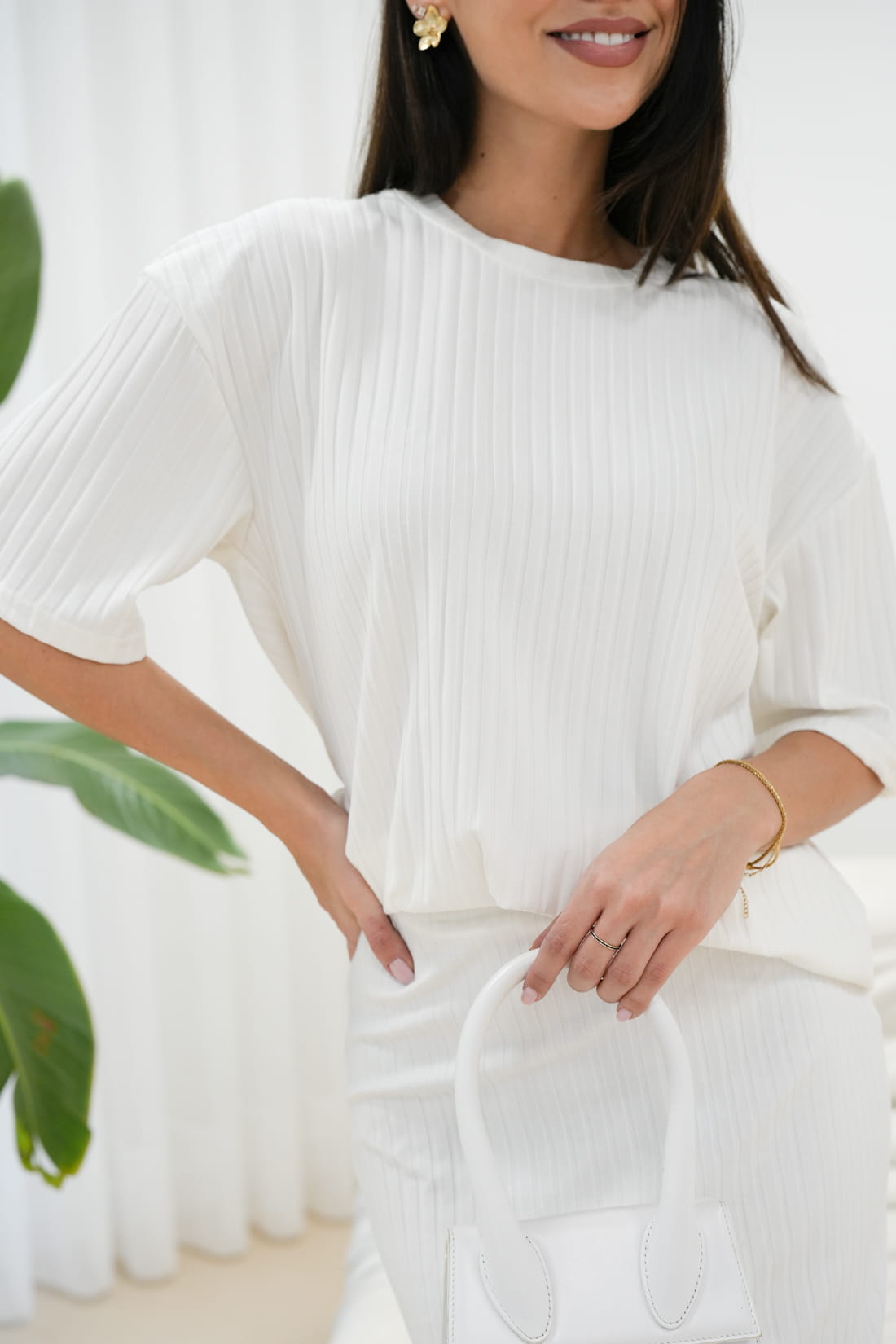Ten biały komplet powstał z wysokiej jakości materiału o strukturze prążkowanej, co sprawi, że będziesz czuć się komfortowo i prezentować zjawiskowo...