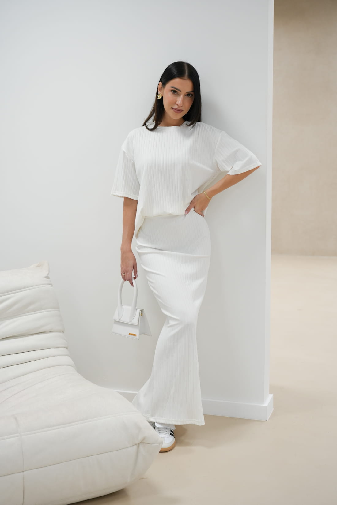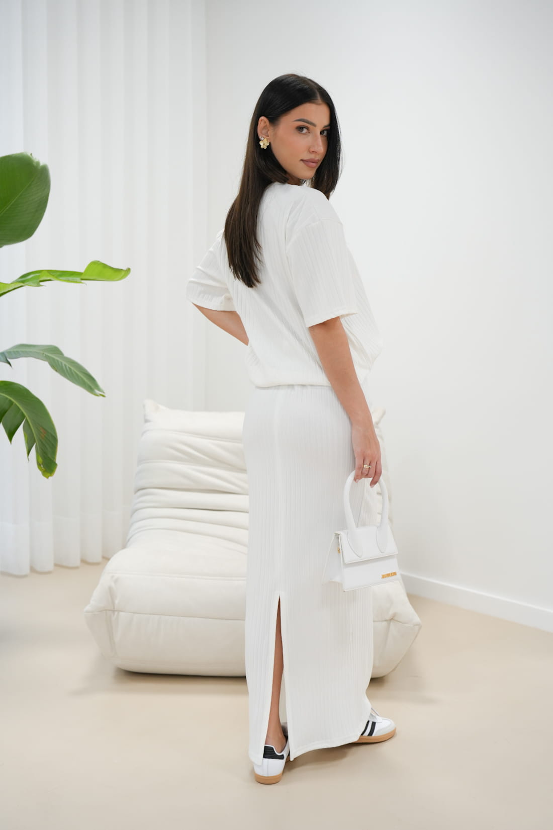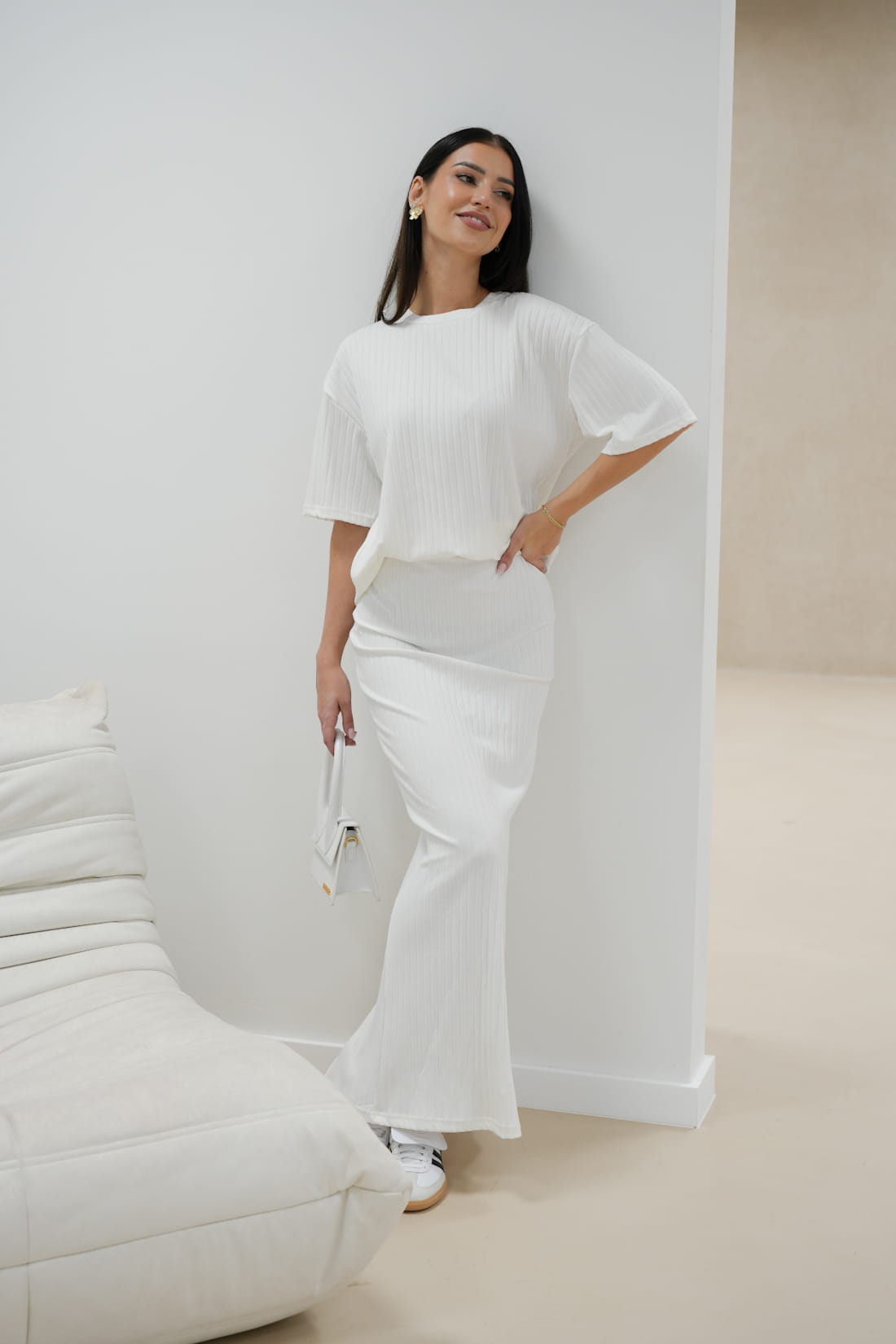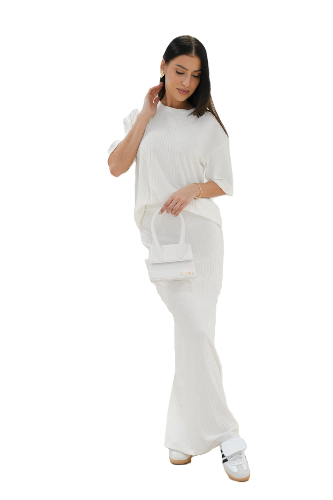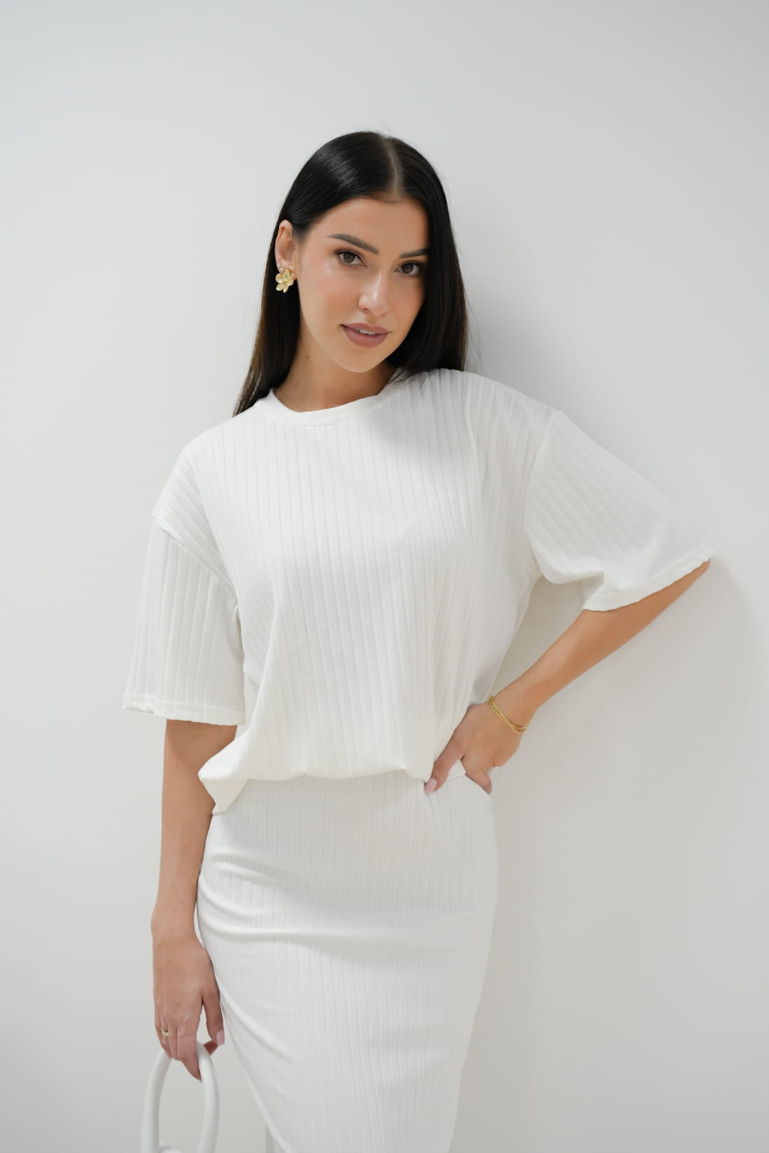 Ten biały komplet powstał z wysokiej jakości materiału o strukturze prążkowanej, co sprawi, że będziesz czuć się komfortowo i prezentować zjawiskowo...