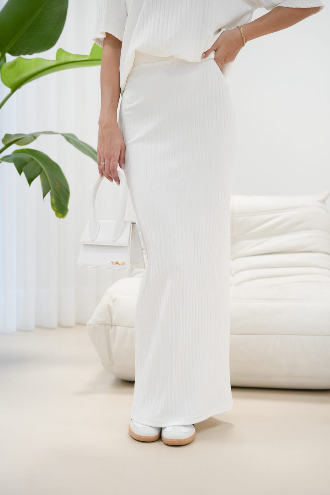Biała spódnica maxi charakteryzuje się prostym krojem, który subtelnie podkreśla sylwetkę. Posiada elastyczną gumkę w pasie, co sprawia, że idealnie dopasowuje się do sylwetki, a dodatkowe rozcięcie z tyłu dodaje jej lekkości i sprawia, że jest bardzo wygodna w noszeniu.