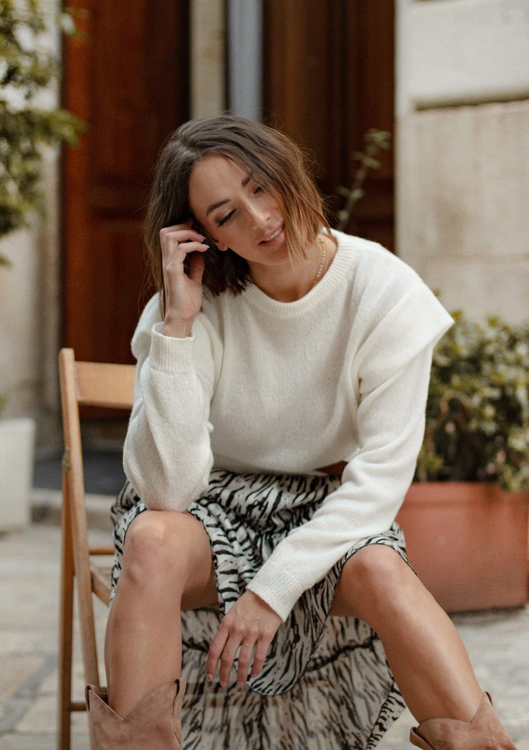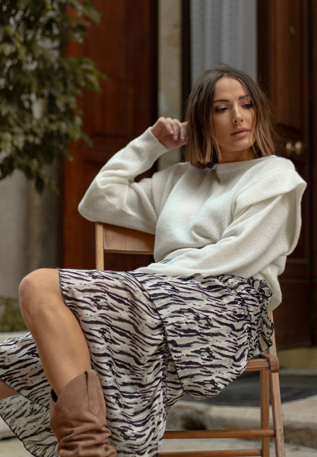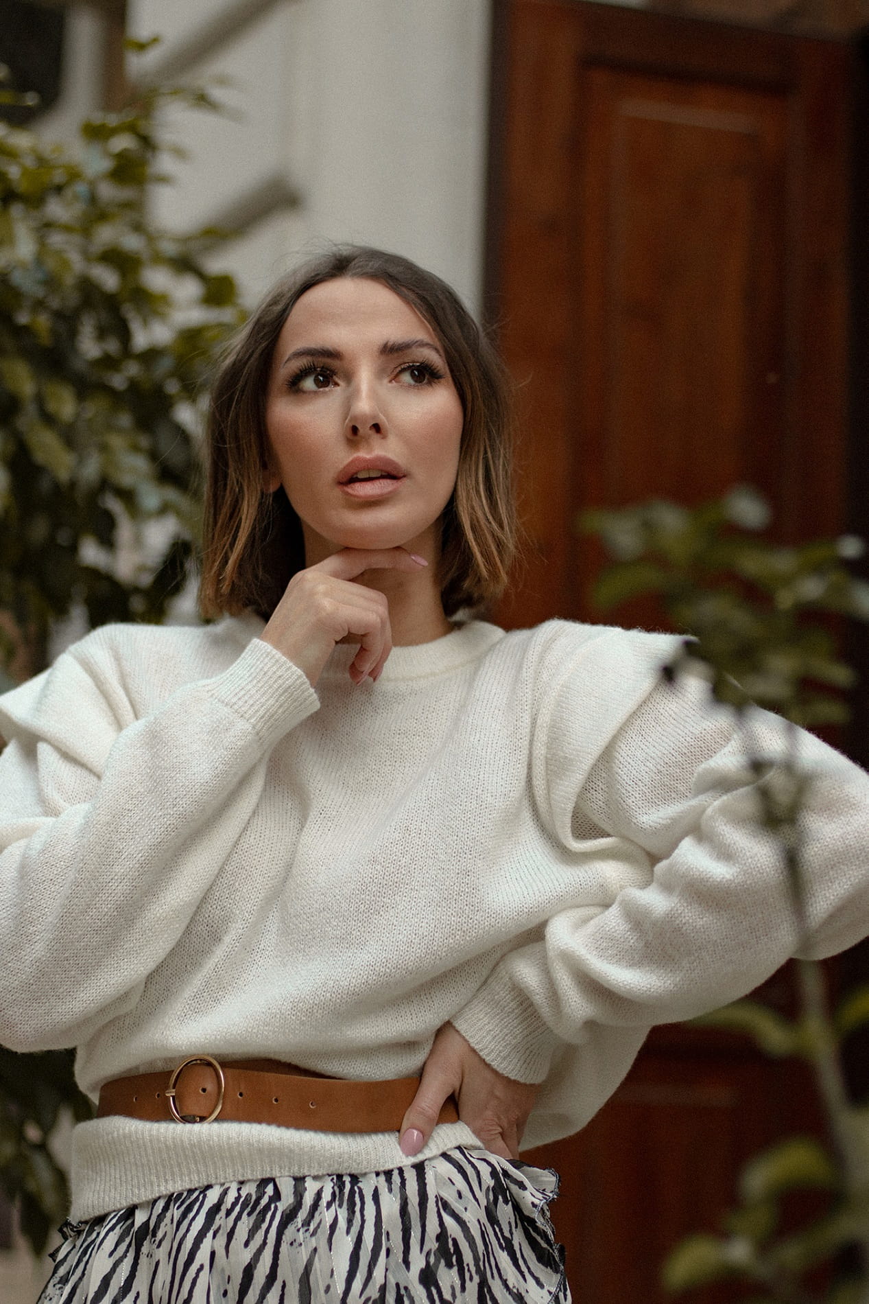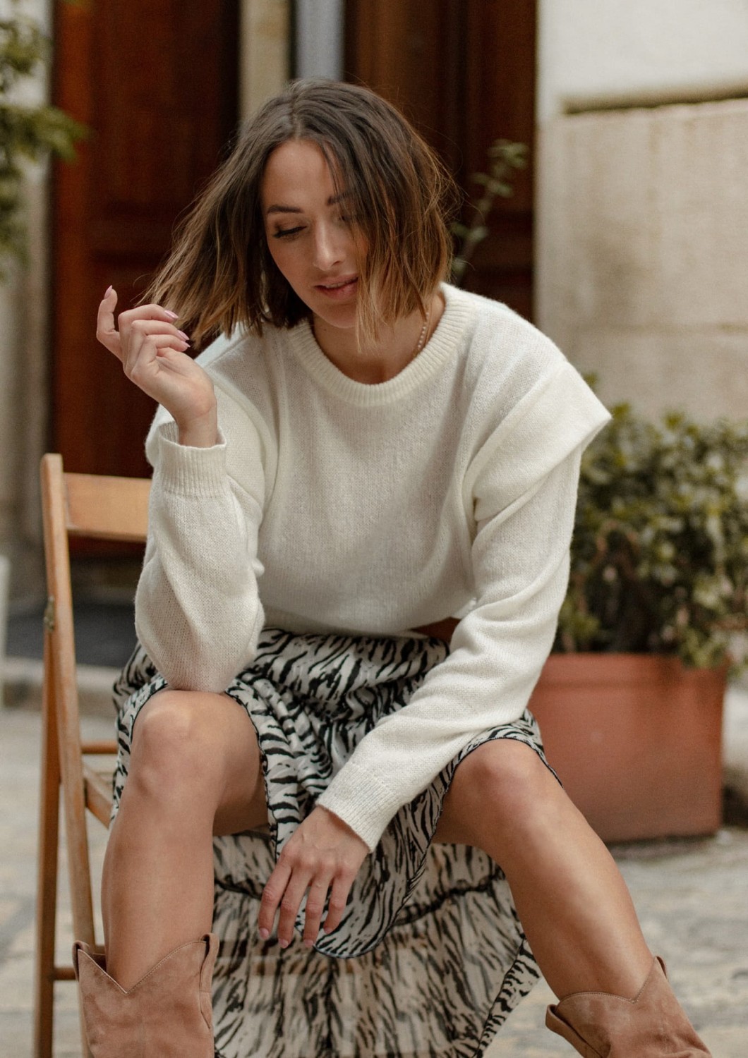Biały sweter z plisą nada charakteru każdej stylizacji.