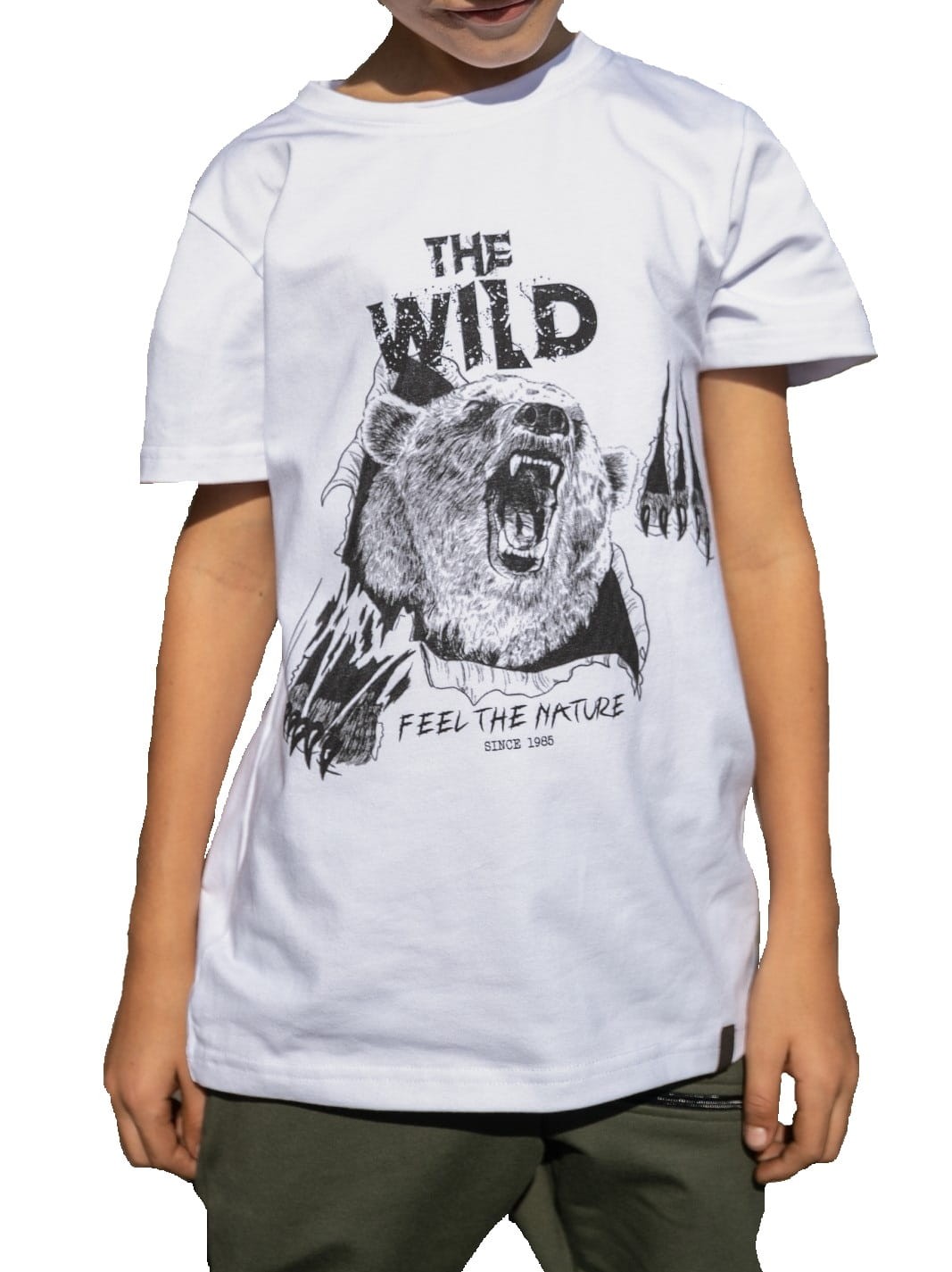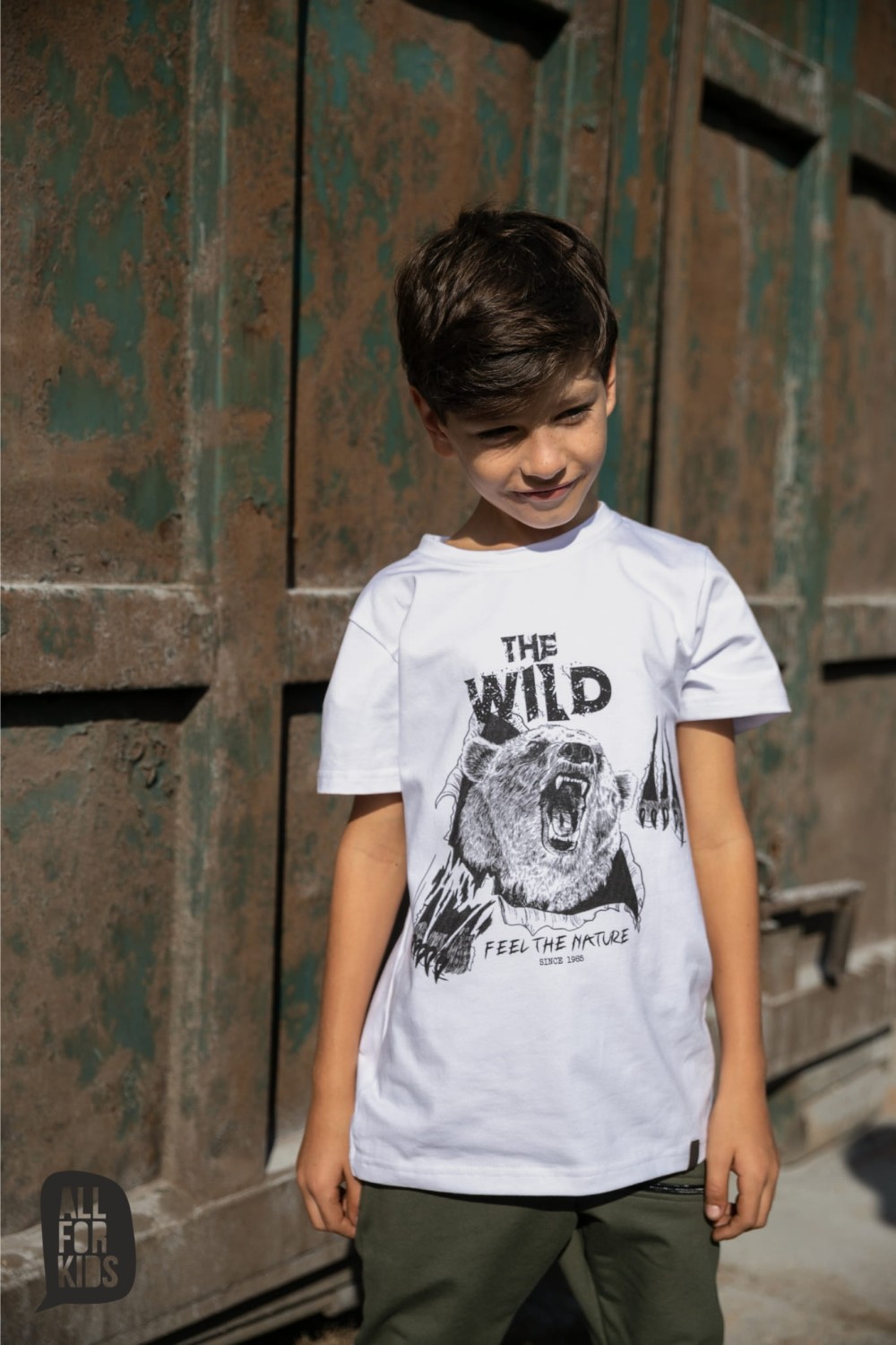 Biały t-shirt z grafiką the wild od polskiej marki ALL FOR KIDS. Modny t-shirt dziecięcy uszyty z wysokiej jakości, gładkiej i komfortowej w noszeniu bawełny z dodatkiem elastanu.