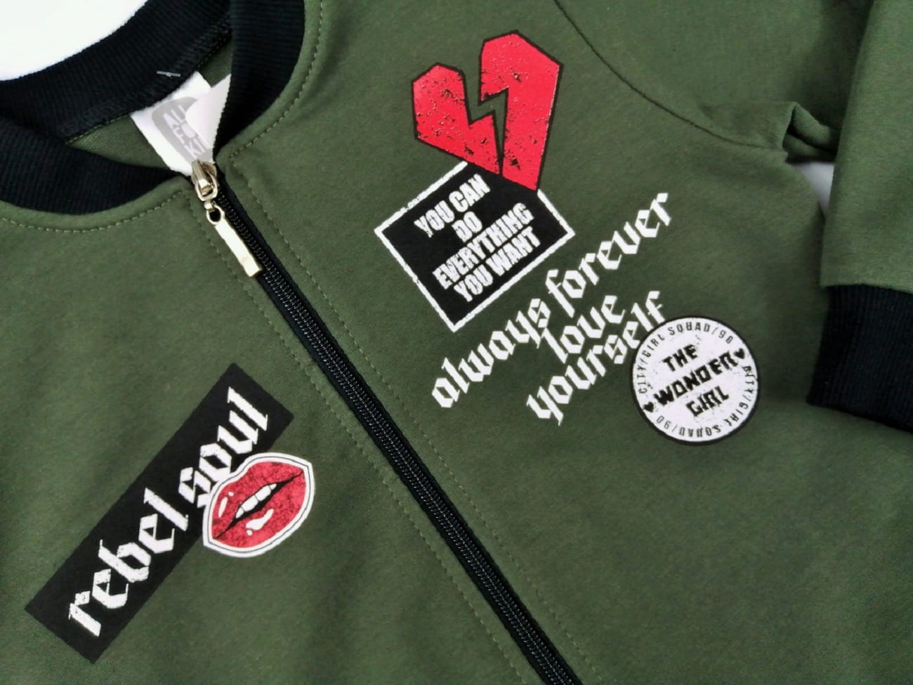 Dresowa bluza khaki posiada boczne kieszenie, zamek, naszywkę z logo marki. Dół, rękawy oraz dekolt wykończone czarnym ściągaczem, w celu komfortu noszenia. Wisienką na torcie są stylowe napisy oraz modny nadruk ust i serca.