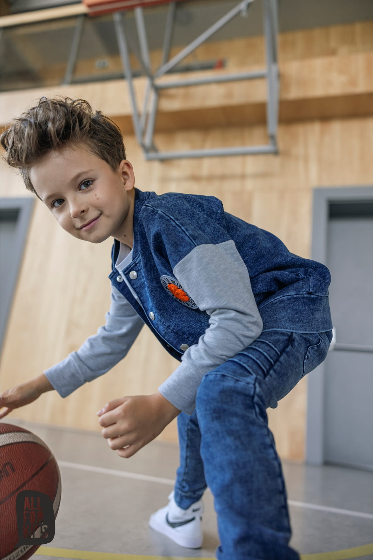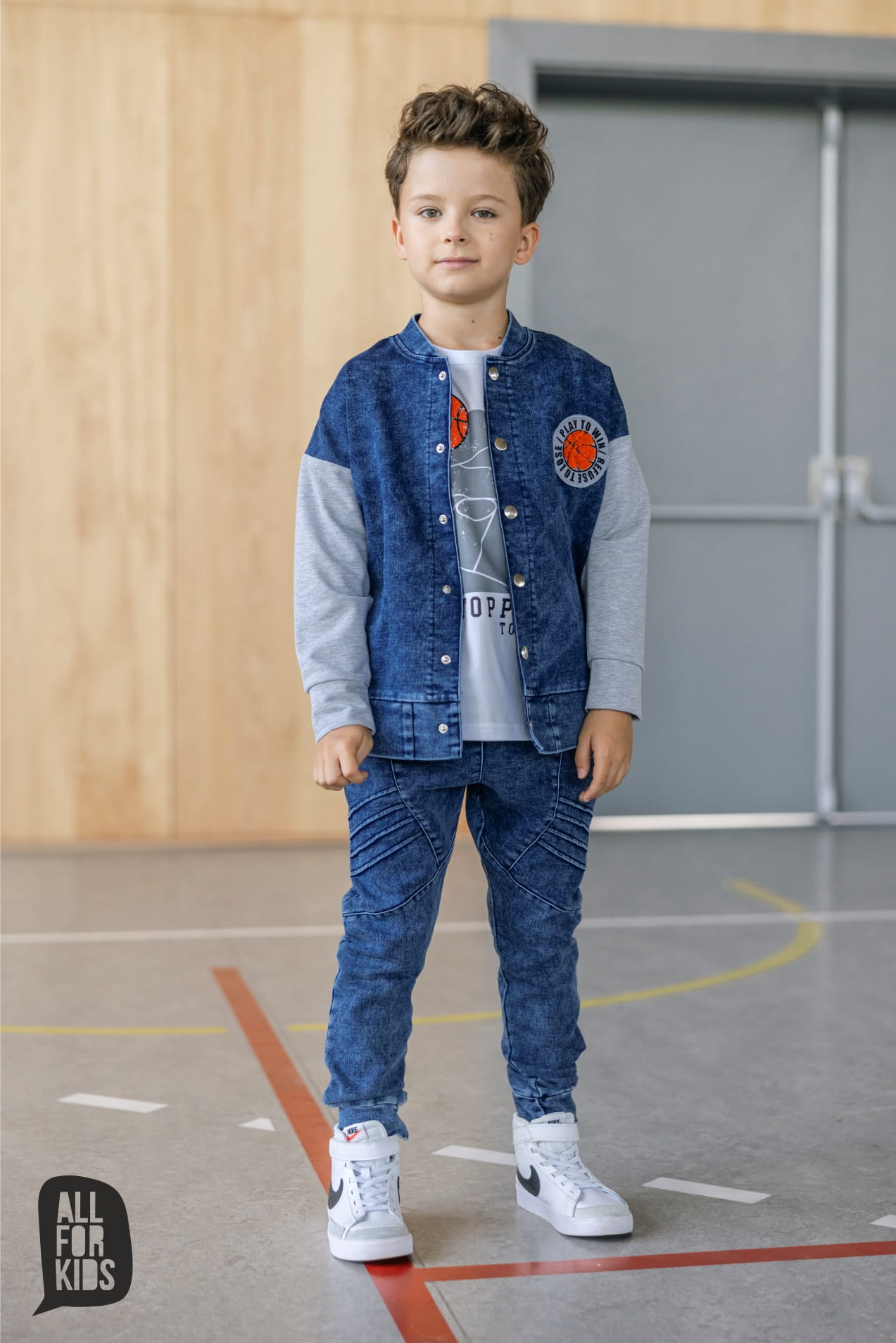 Jeansowa bluza bomberka powstała w Polsce przez markę All For Kids z połączenia dzianiny jeansowej i dresowej, przez co jest miękka i komfortowa w noszeniu.