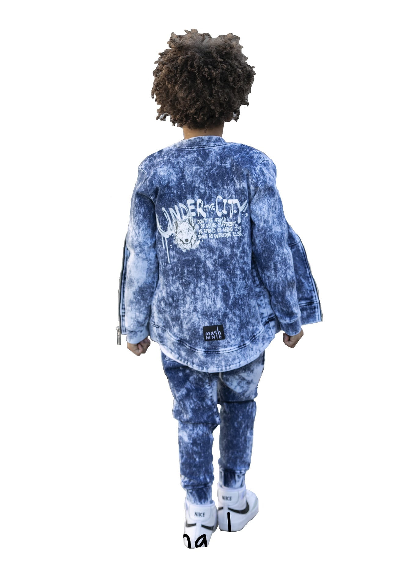 Jeansowa bluza z wilkiem od polskiej marki Mash MNIE z kolekcji UNDER THE CITY. Rozsuwana bluza dziecięca wykonana z komfortowej w noszeniu dzianiny dresowej, dzięki czemu jest miękka i komfortowa w noszeniu.
