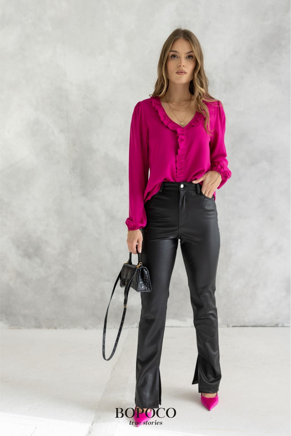 Czarna bluzka z dekoltem V i falbanką powstała w Polsce przez markę Bopoco true stories z wysokiej jakości, komfortowej w noszeniu wiskozy.