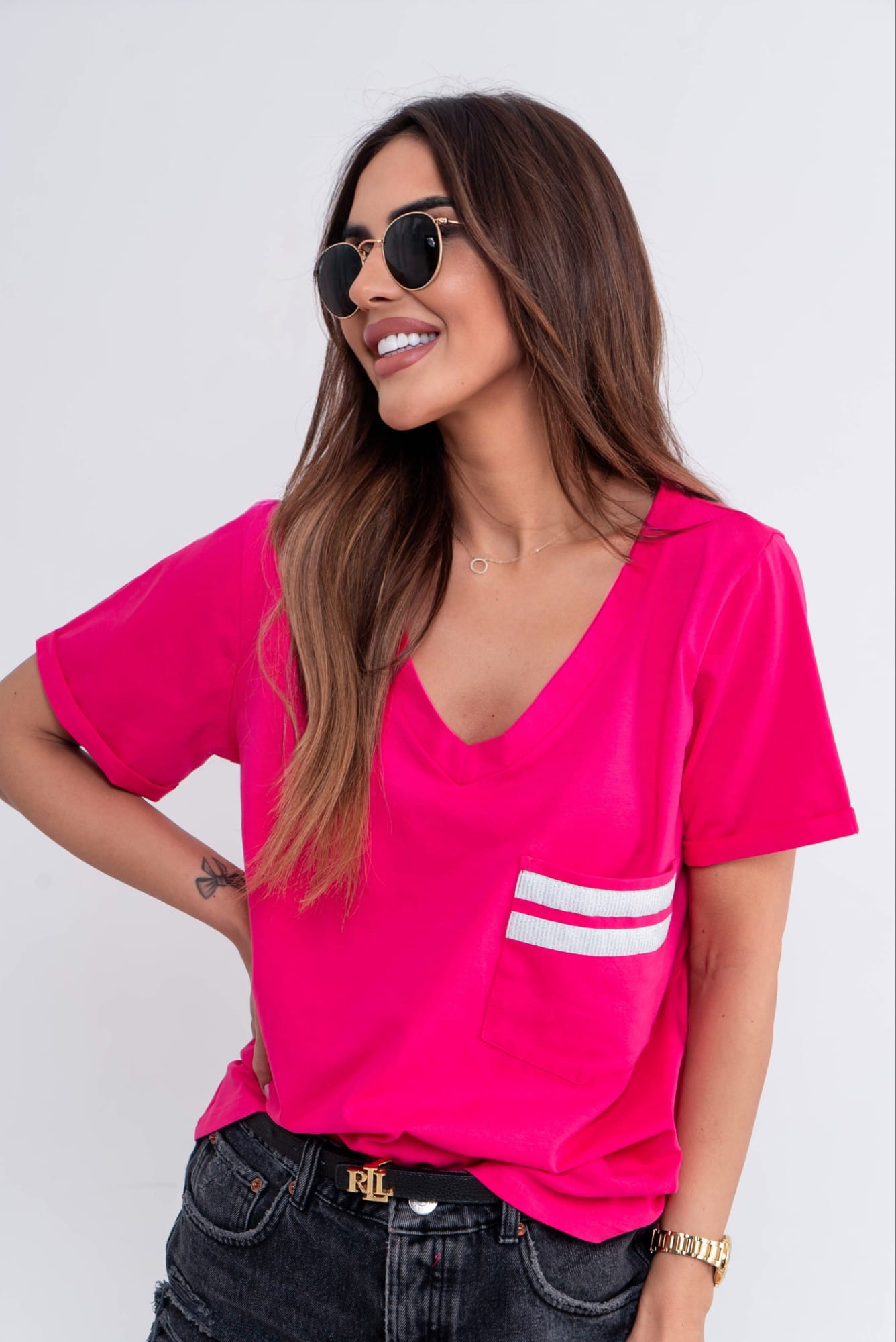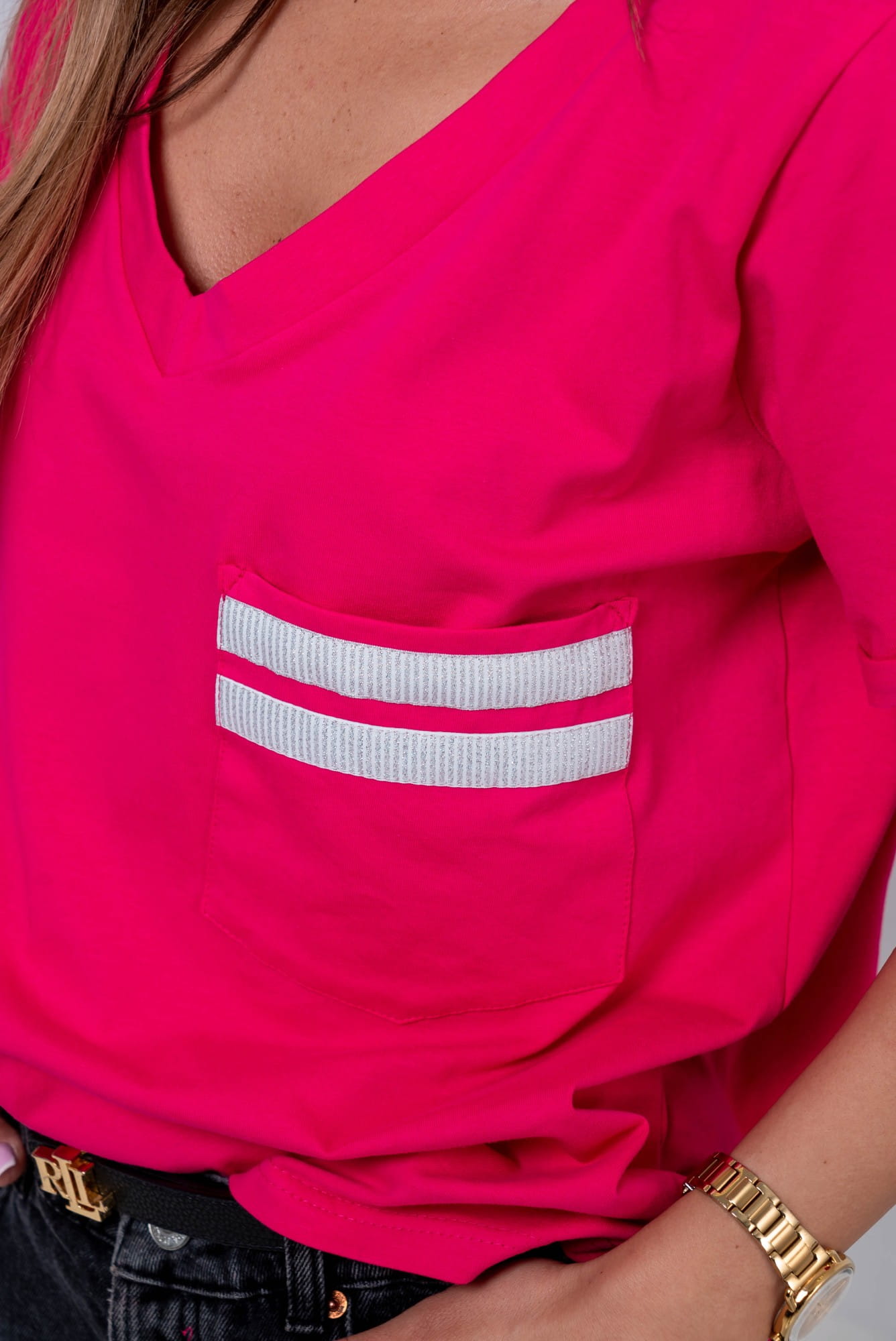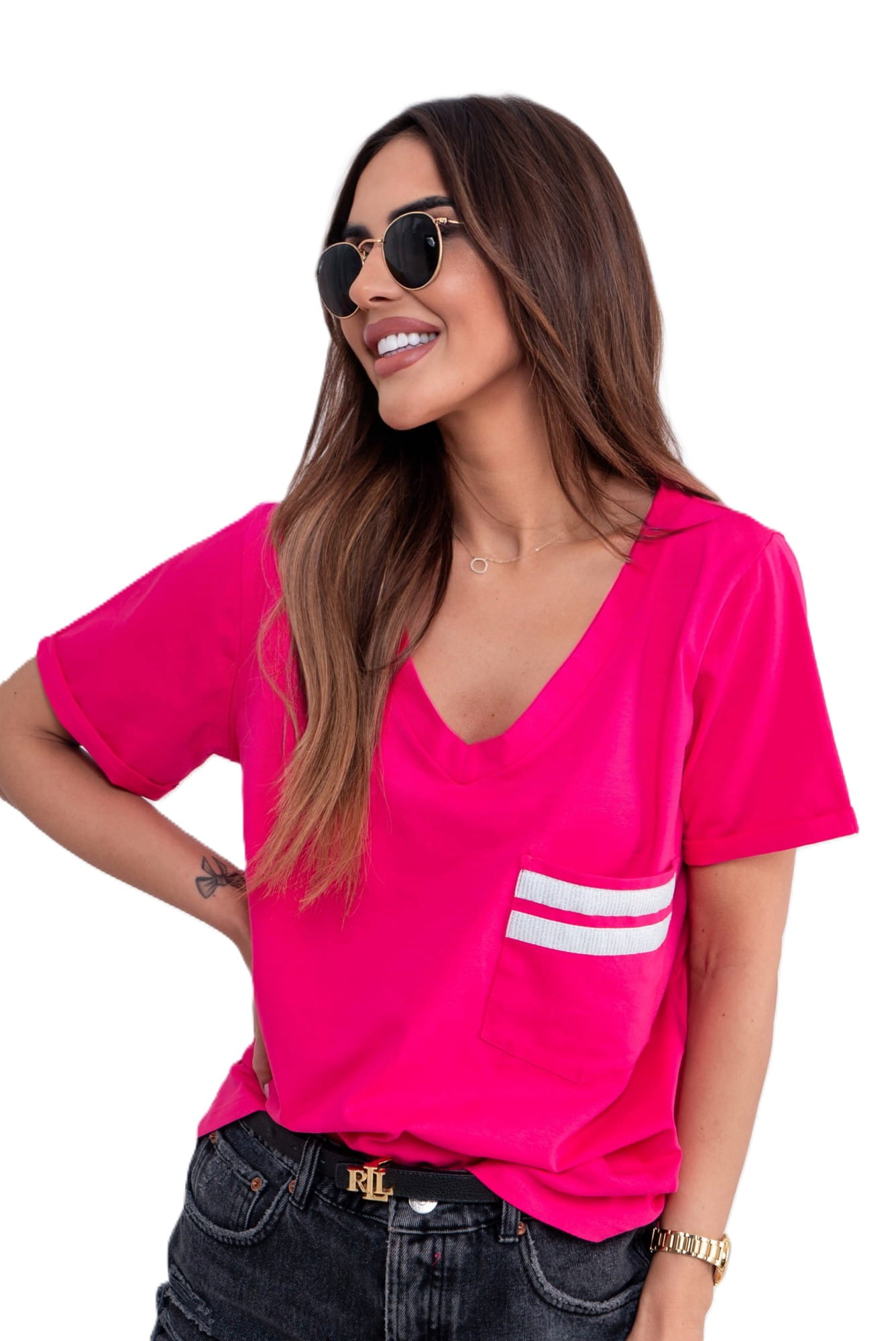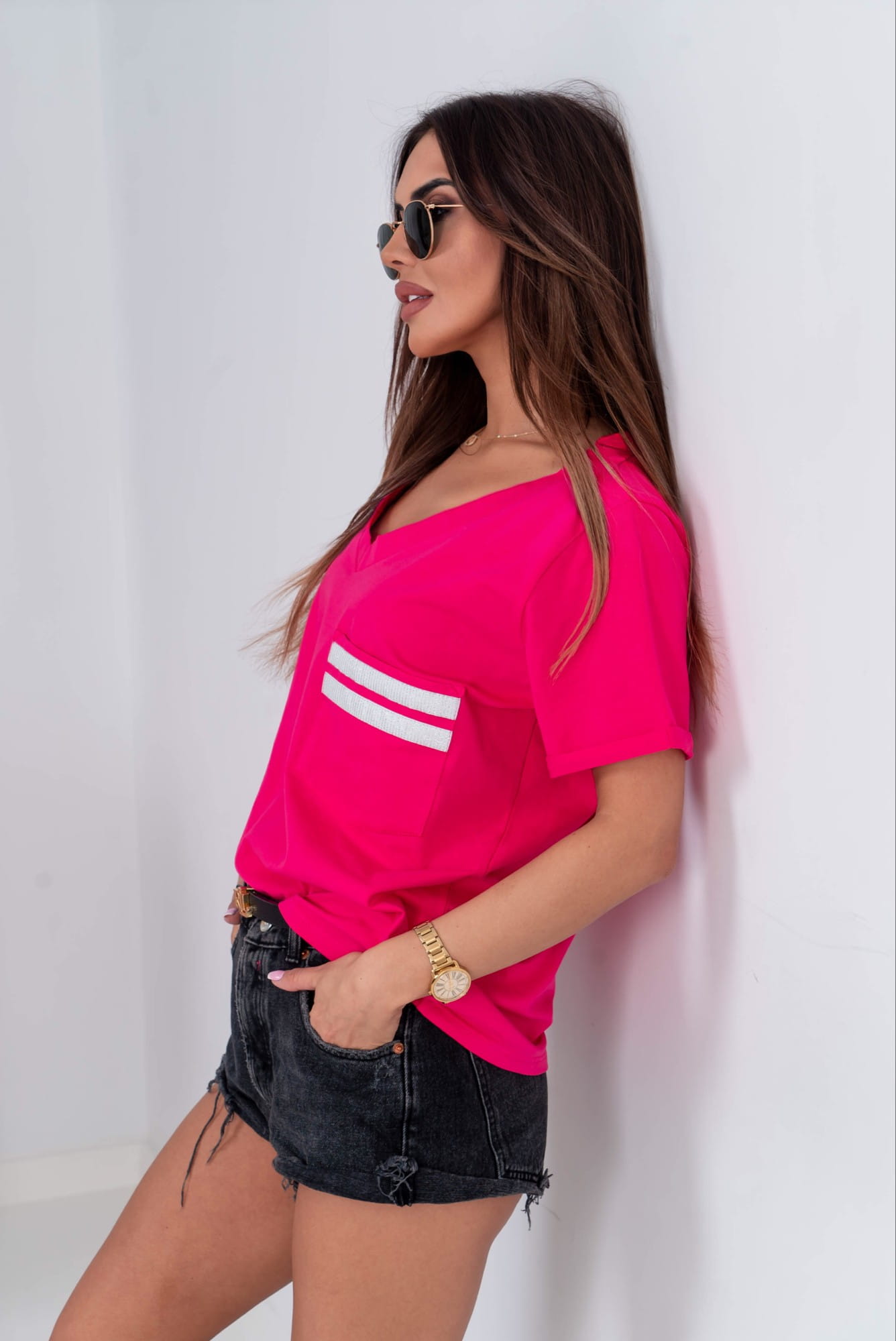 Bluzka damska z dekoltem V kieszonka fuksja TMC Moda