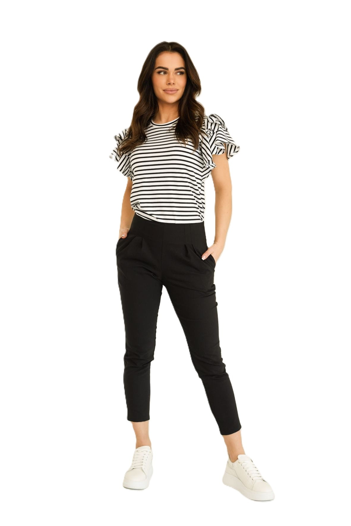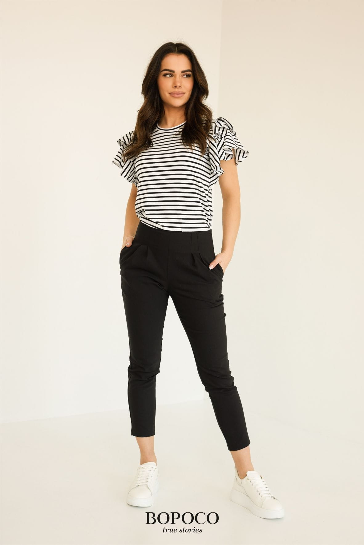 Bluzka damska z falbankami przy rękawie paski biało-czarne Bopoco