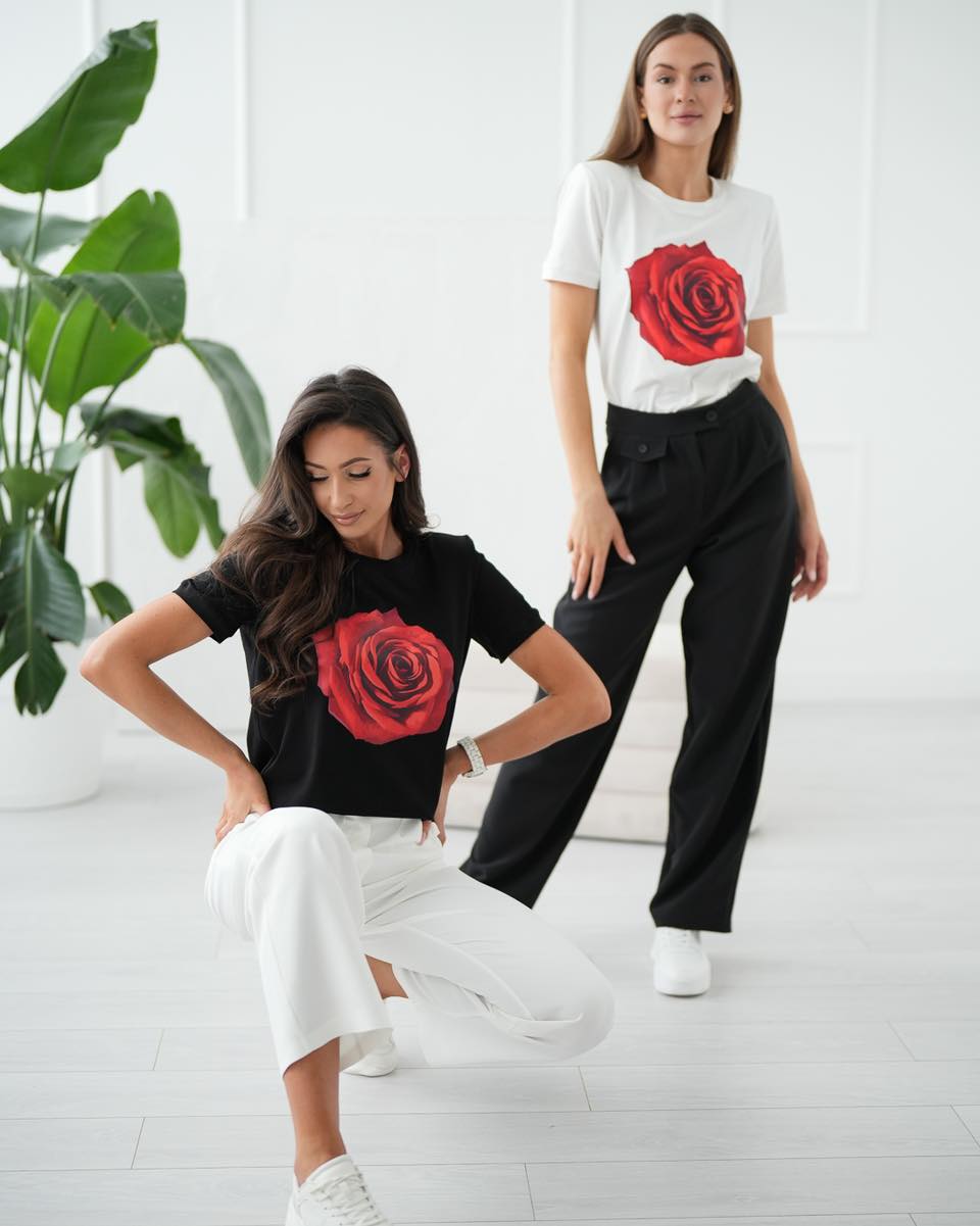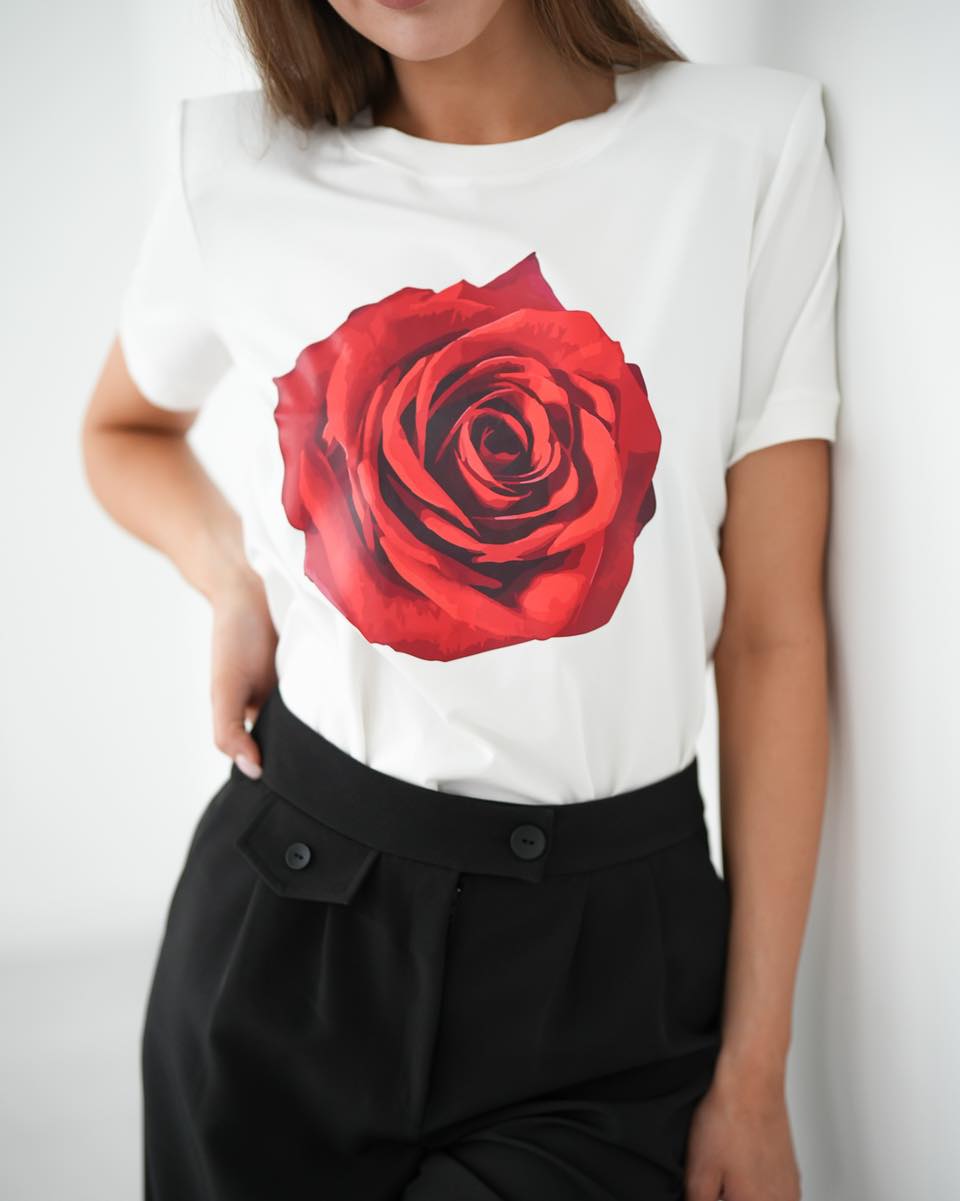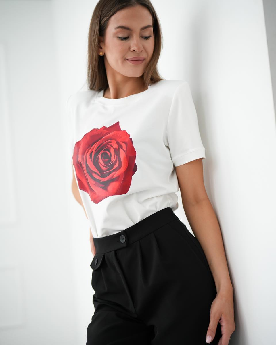 Biała bluzka z różą to elegancki i stylowy element w każdej kobiecej garderobie. Wykonana z dzianiny bawełnianej, co zapewnia wygodę i komfort w noszeniu.