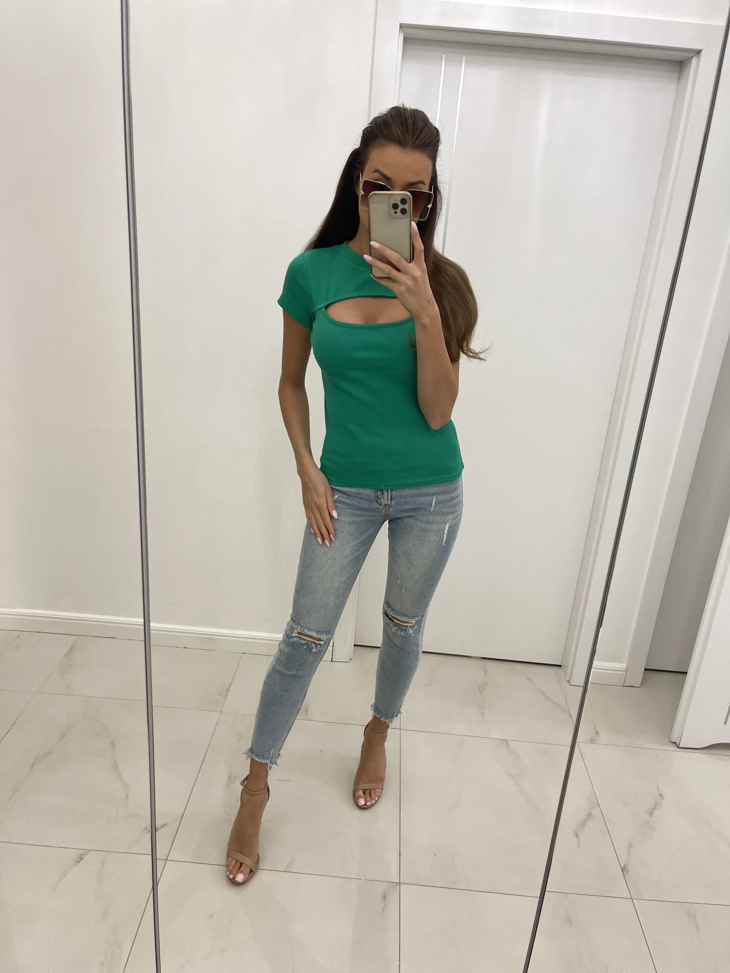 Zielona bluzka prążek świetnie srawdzi się do wielu różnych stylizacji.