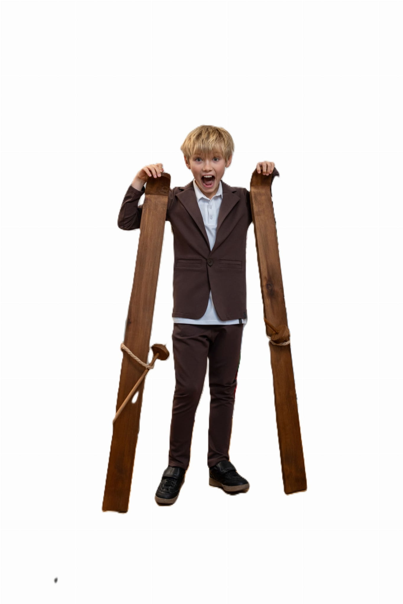 Brązowa marynarka dla fanów sportowej elegancji. Modna marynarka chłopięca powstała w Polsce przez markę All For Kids z komfortowej w noszeniu dzianiny dresowej.