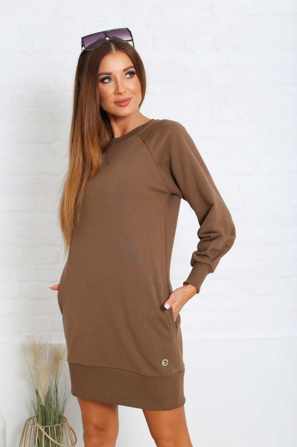 Brązowa sukienka dresowa dla kobiet lubiących styl i wygodę. Modna sukienka damska uszyta została w Polsce przez markę TMC Moda z komfortowej w noszeniu, grubszej dzianiny dresowej.