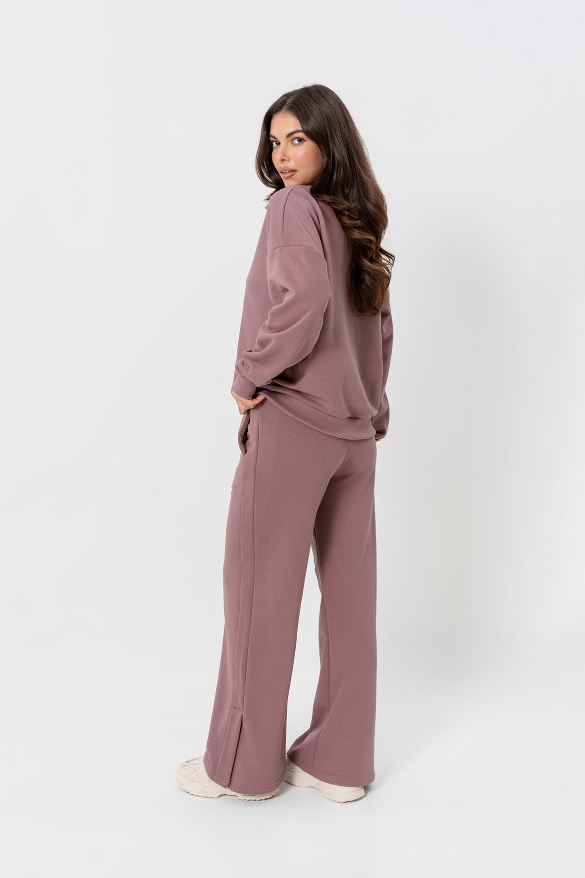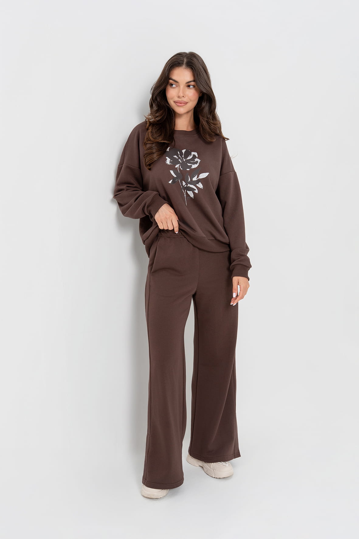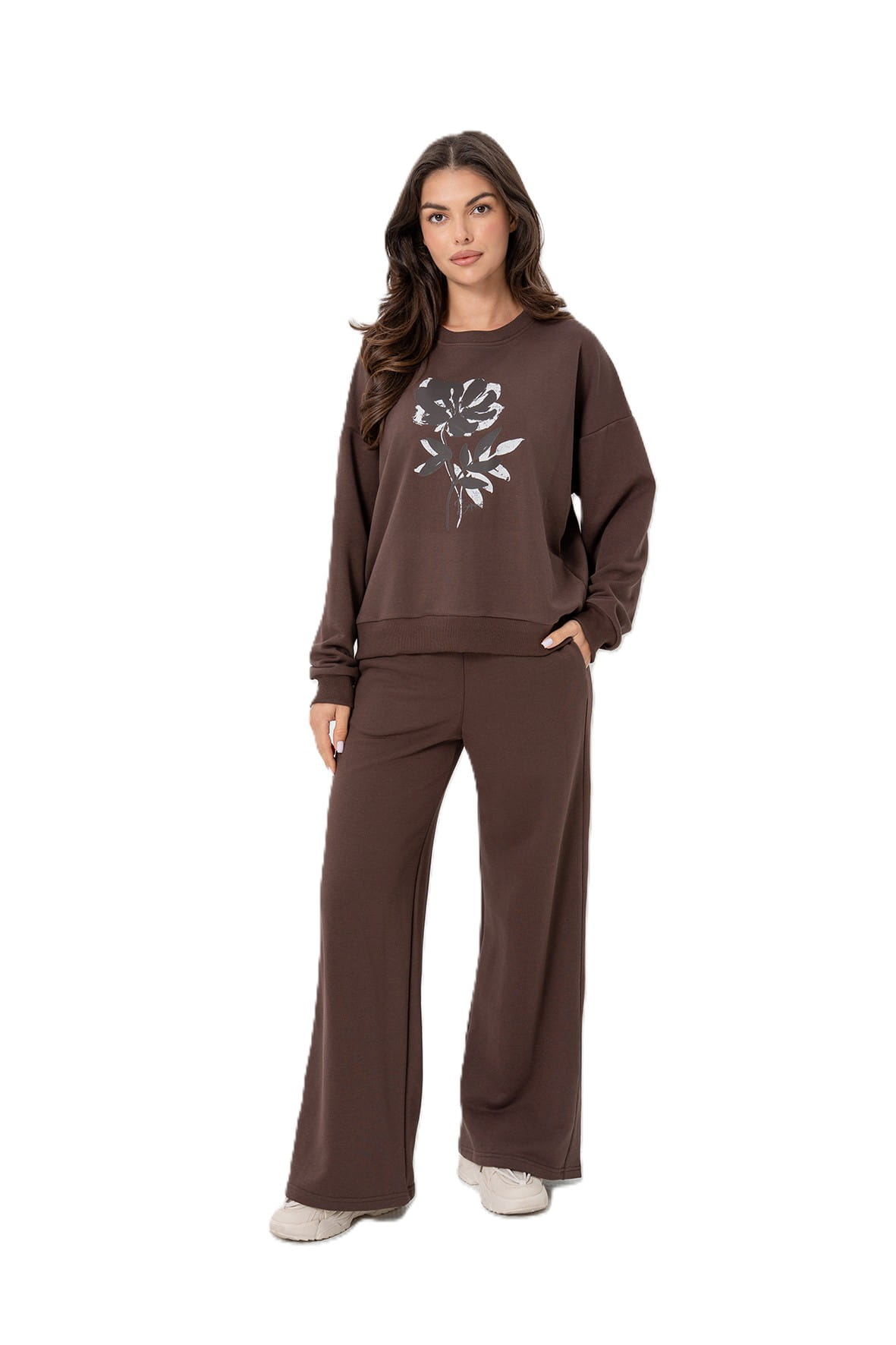 Ten czekoladowy komplet dresowy składa się z szerokich spodni z rozcięciem i bluzy z nadrukiem, które idealnie sprawdzą się zarówno w codziennych stylizacjach, jak i podczas relaksu w domowym zaciszu.