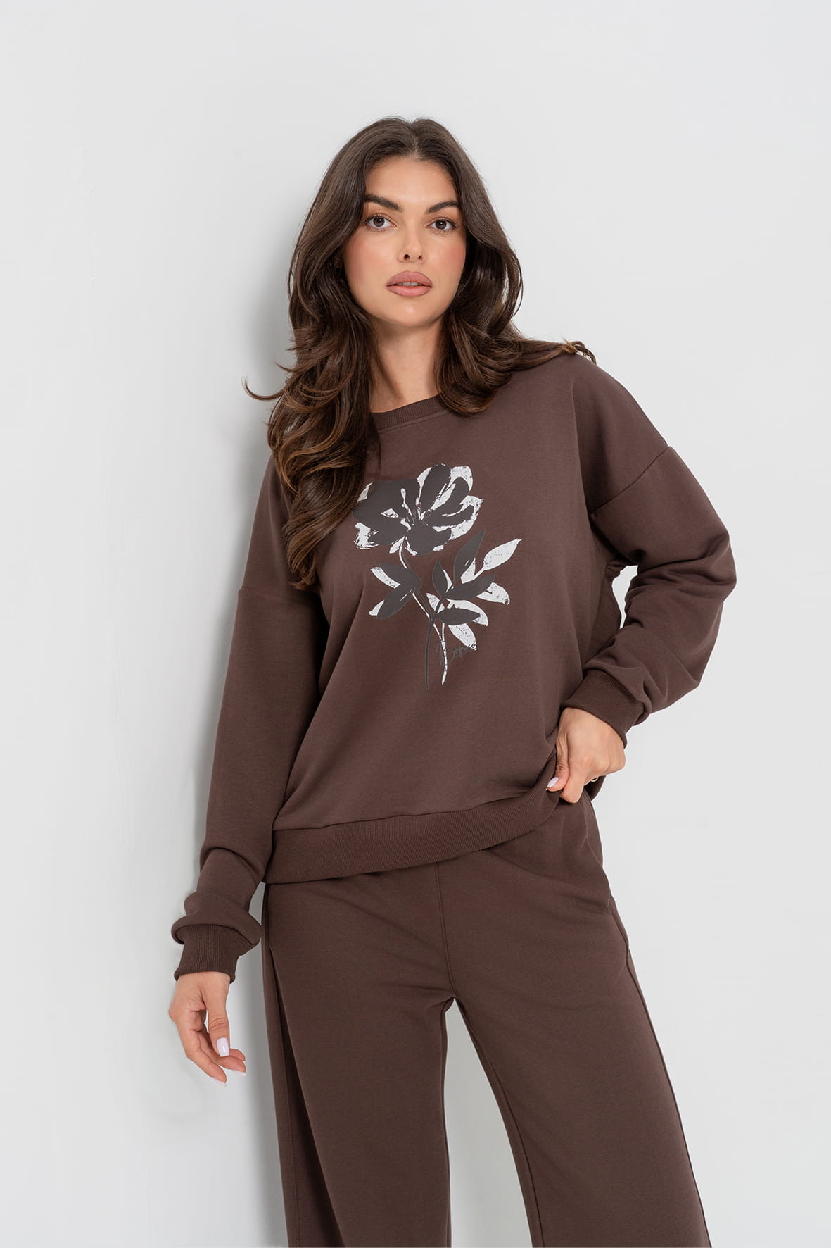 Brązowa bluza z nadrukiem kwiatka, to kwintesencja stylu i wygody. Zakończona ściągaczami zapewnia maksymalny komfort noszenia, ponadto świetnie sprawdza się do innych stylizacji.