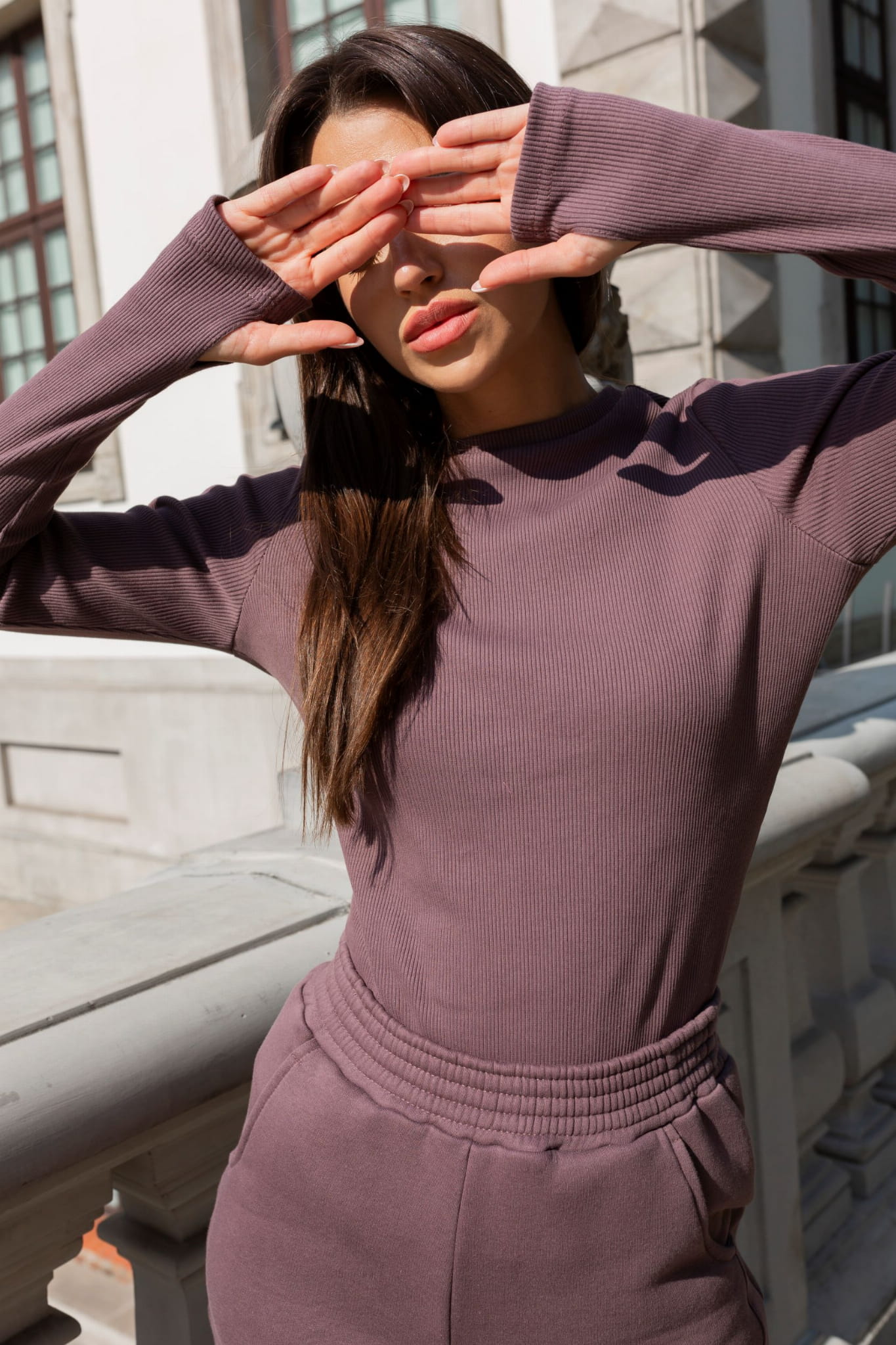 Brązowa bluzka prążek posiada dopasowany fason oraz długi rękaw z otworem na kciuk, co dodaje jej unikalnego charakteru.