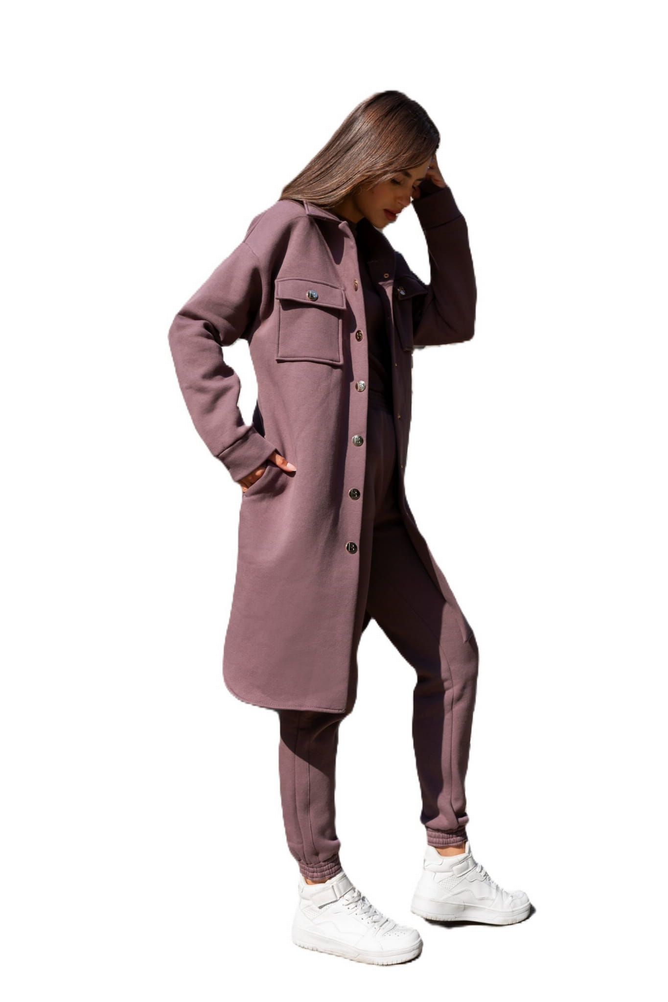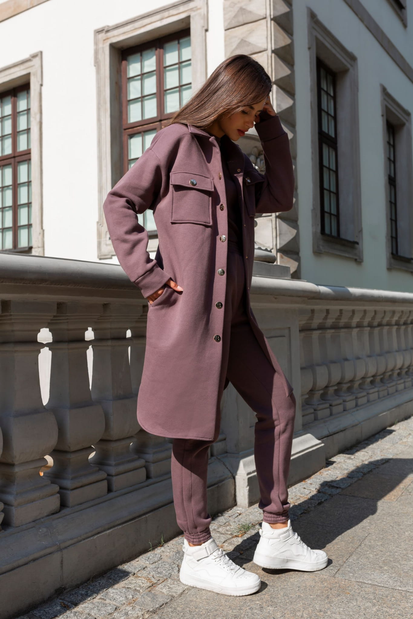 Spodnie i katana wykonane są z wysokiej jakości bawełny, ocieplonej od spodu delikatnym meszkiem, co zapewnia komfort i ciepło w chłodniejsze dni. Bluzka, uszyta z prążkowanej bawełny, idealnie podkreśla sylwetkę, a otwór na kciuk dodaje nowoczesnego charakteru i funkcjonalności.
