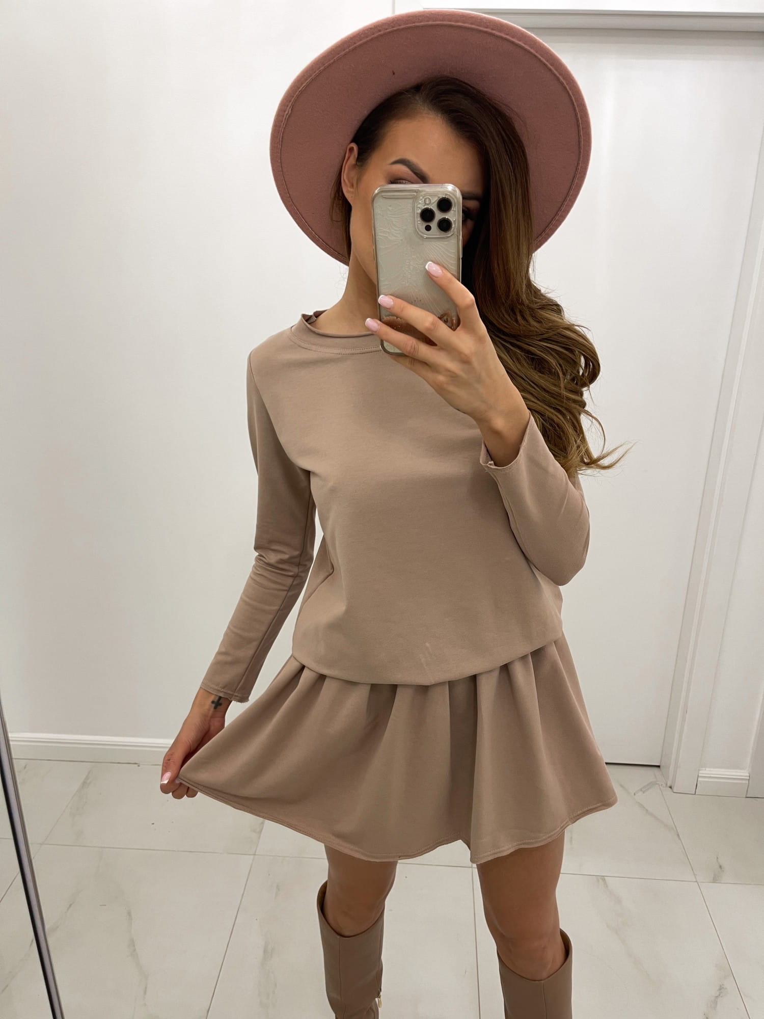 Modna sukienka z falbaną i długim rękawem powstała w Polsce przez markę Top Moda Collection z komfortowej w noszeni dzianiny dresowej.
