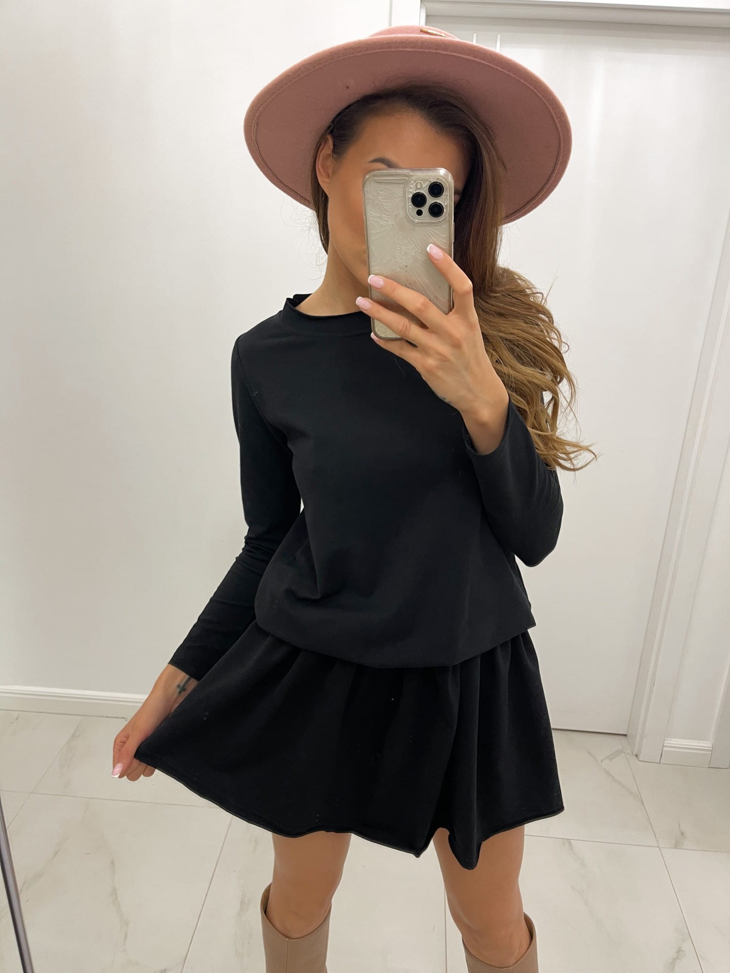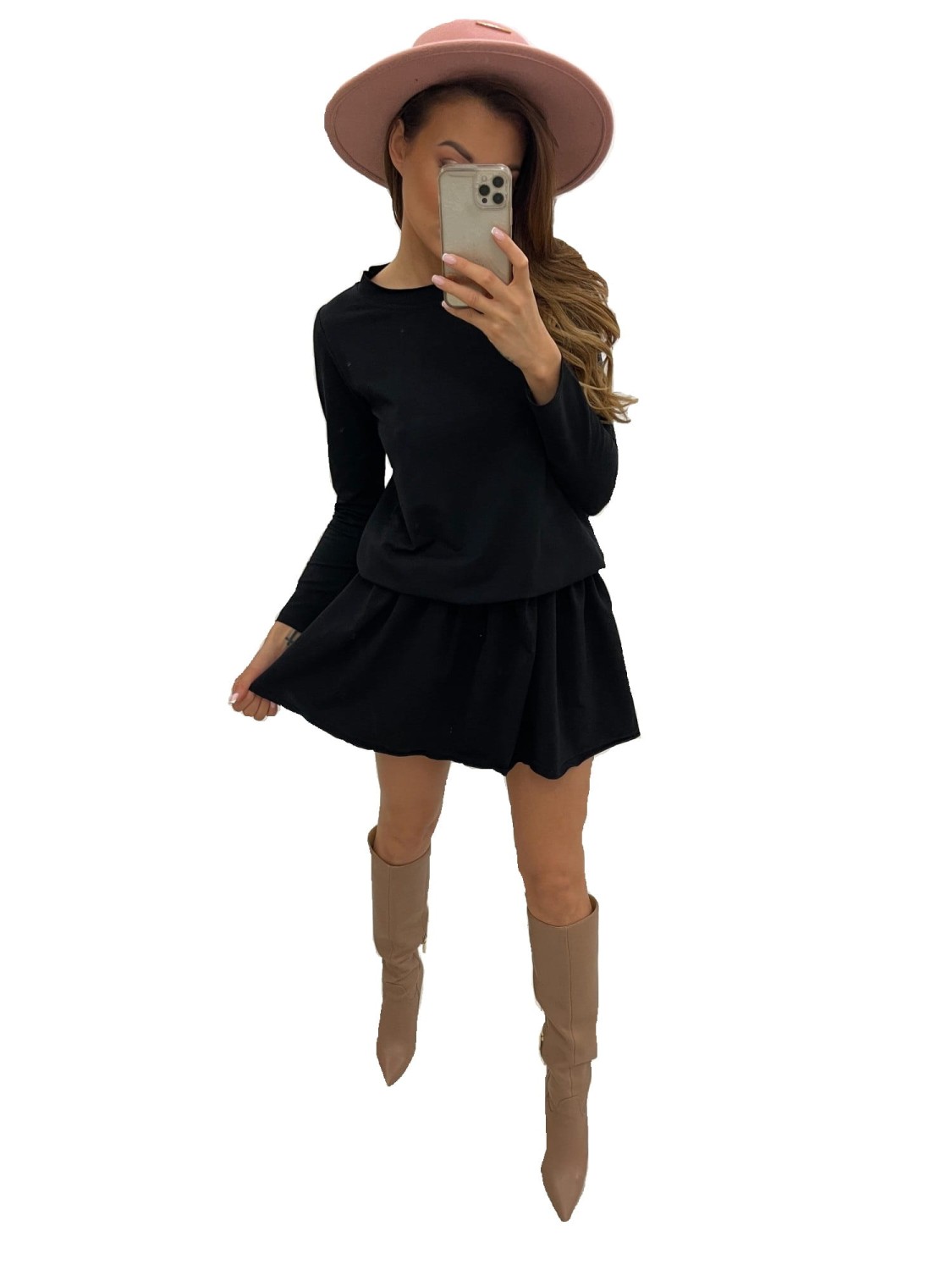 Modna sukienka z falbaną i długim rękawem powstała w Polsce przez markę Top Moda Collection z komfortowej w noszeni dzianiny dresowej.