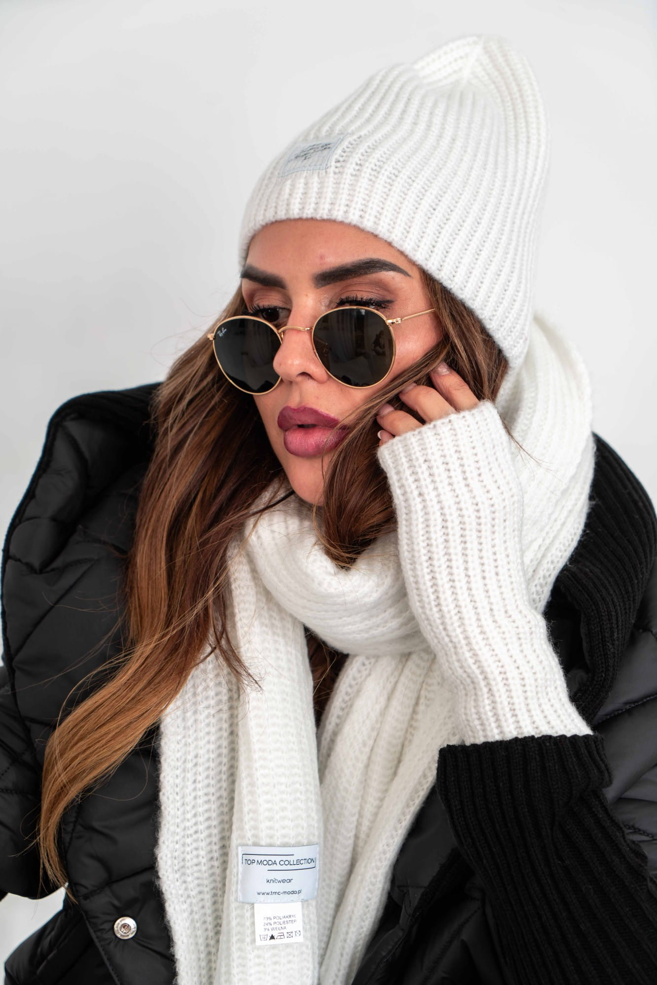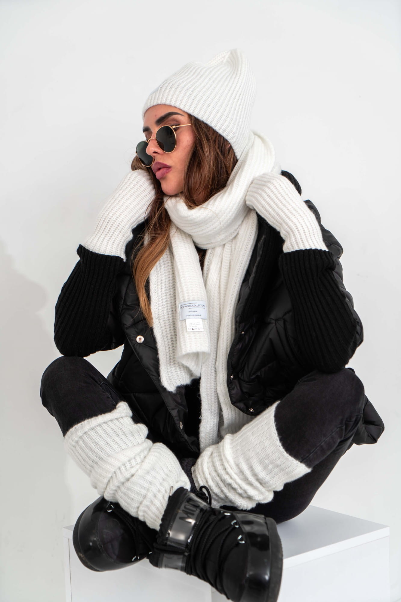 Czapka szalik rękawiczki ocieplacze komplet damski biały Tmc Moda