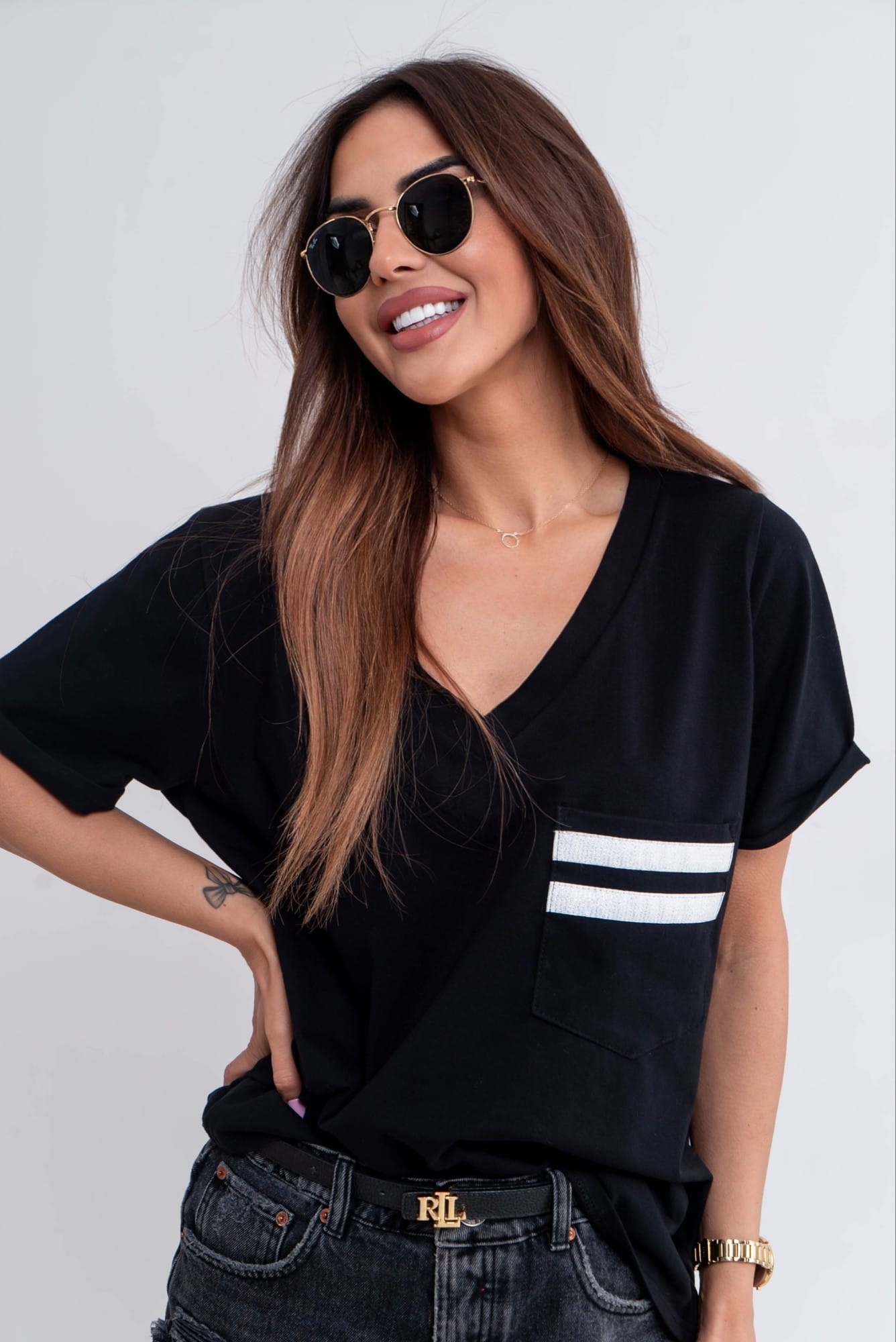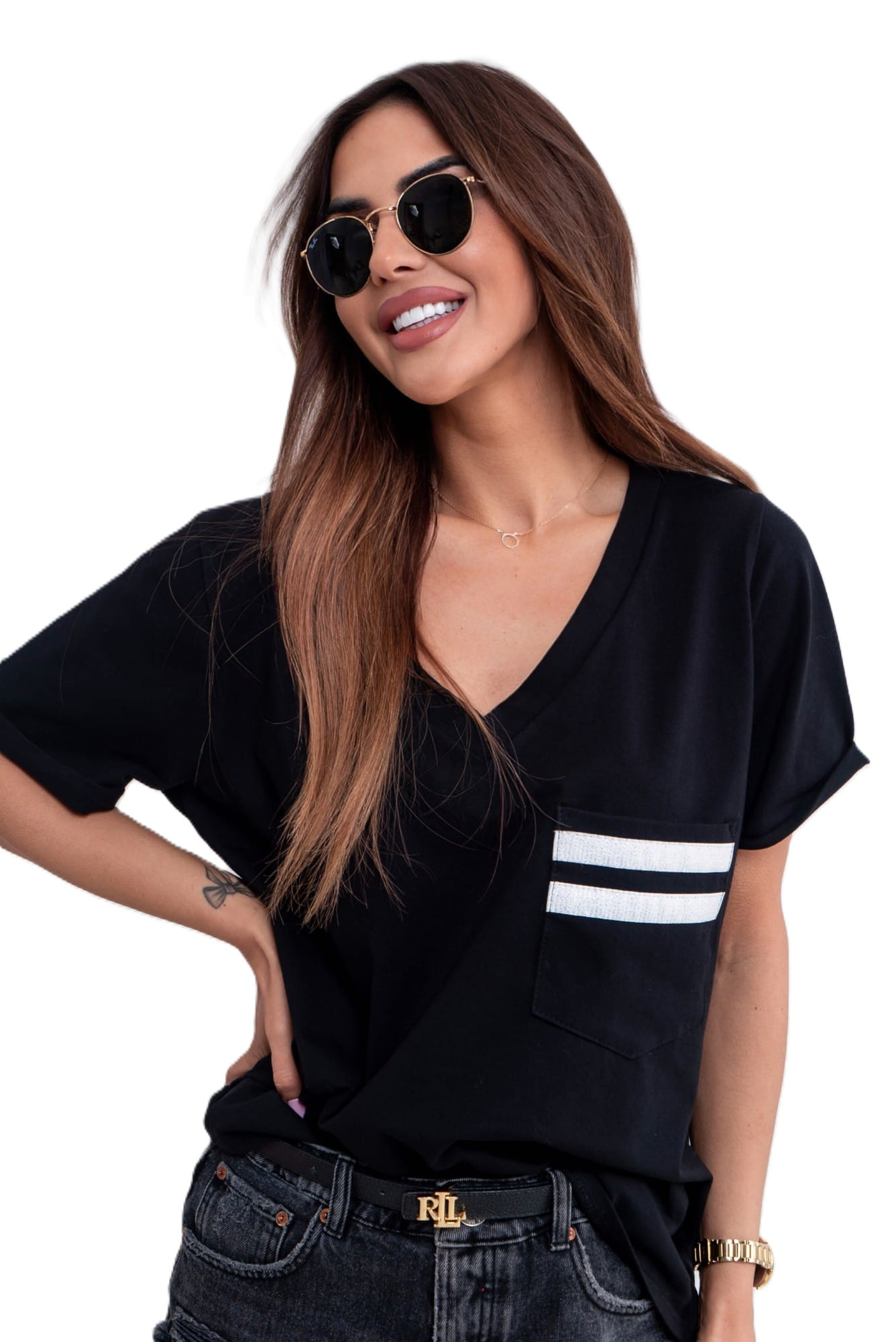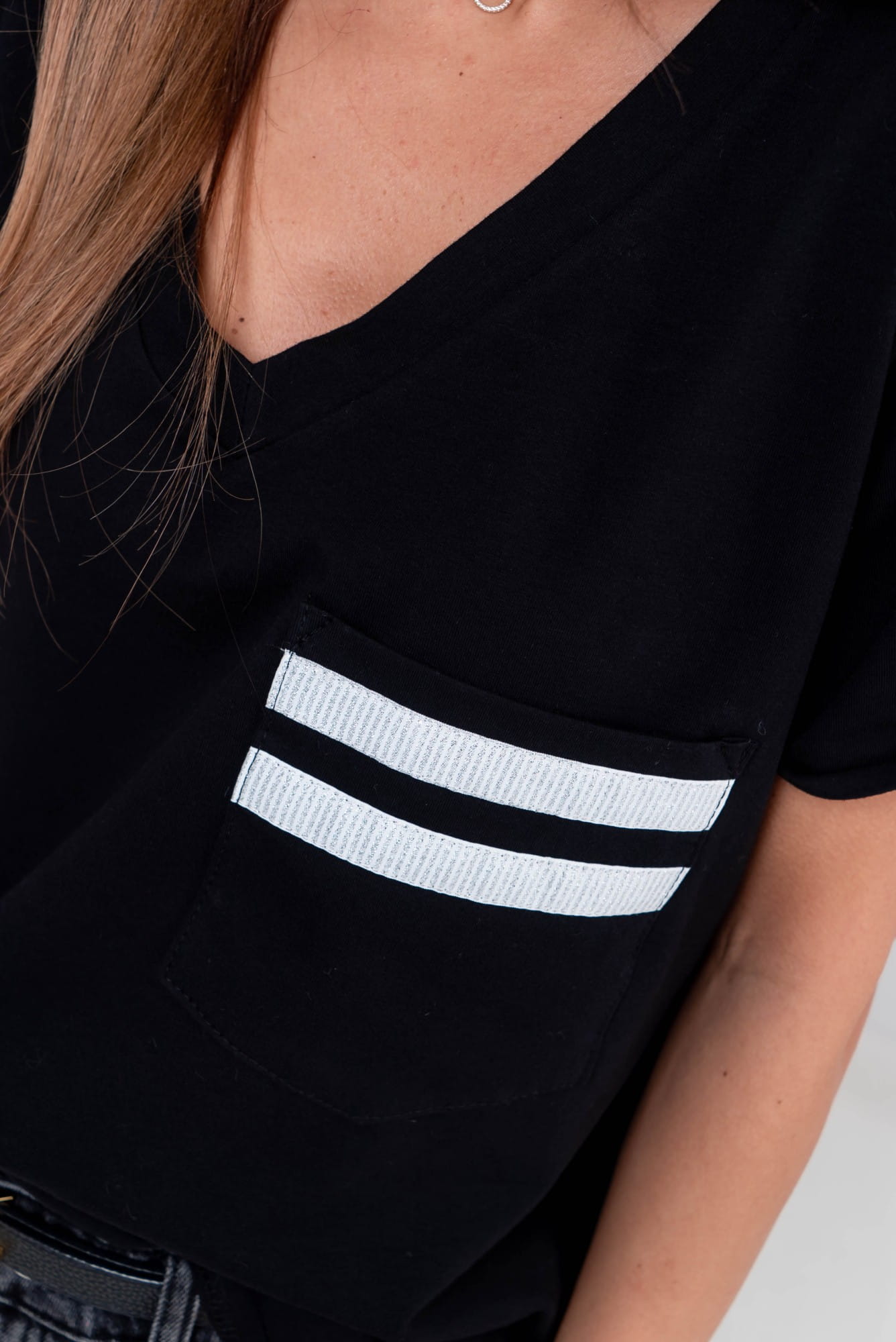 Czarna bluzka V-neck z ozdobną kieszonką powstała w Polsce przez markę Top Moda Collection z komfortowej w noszeniu gładkiej dzianiny.