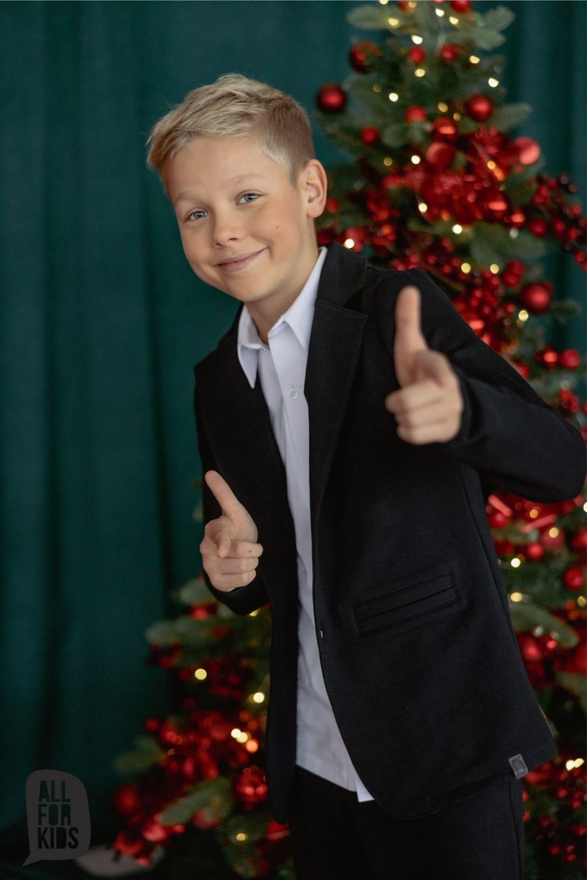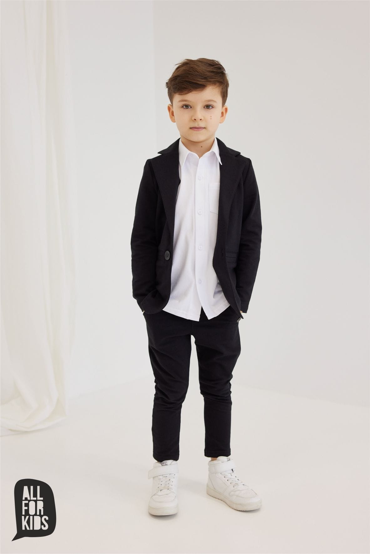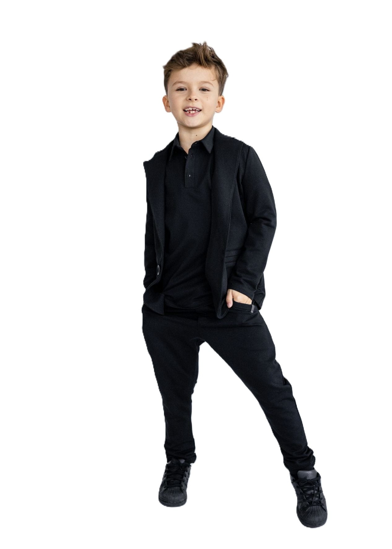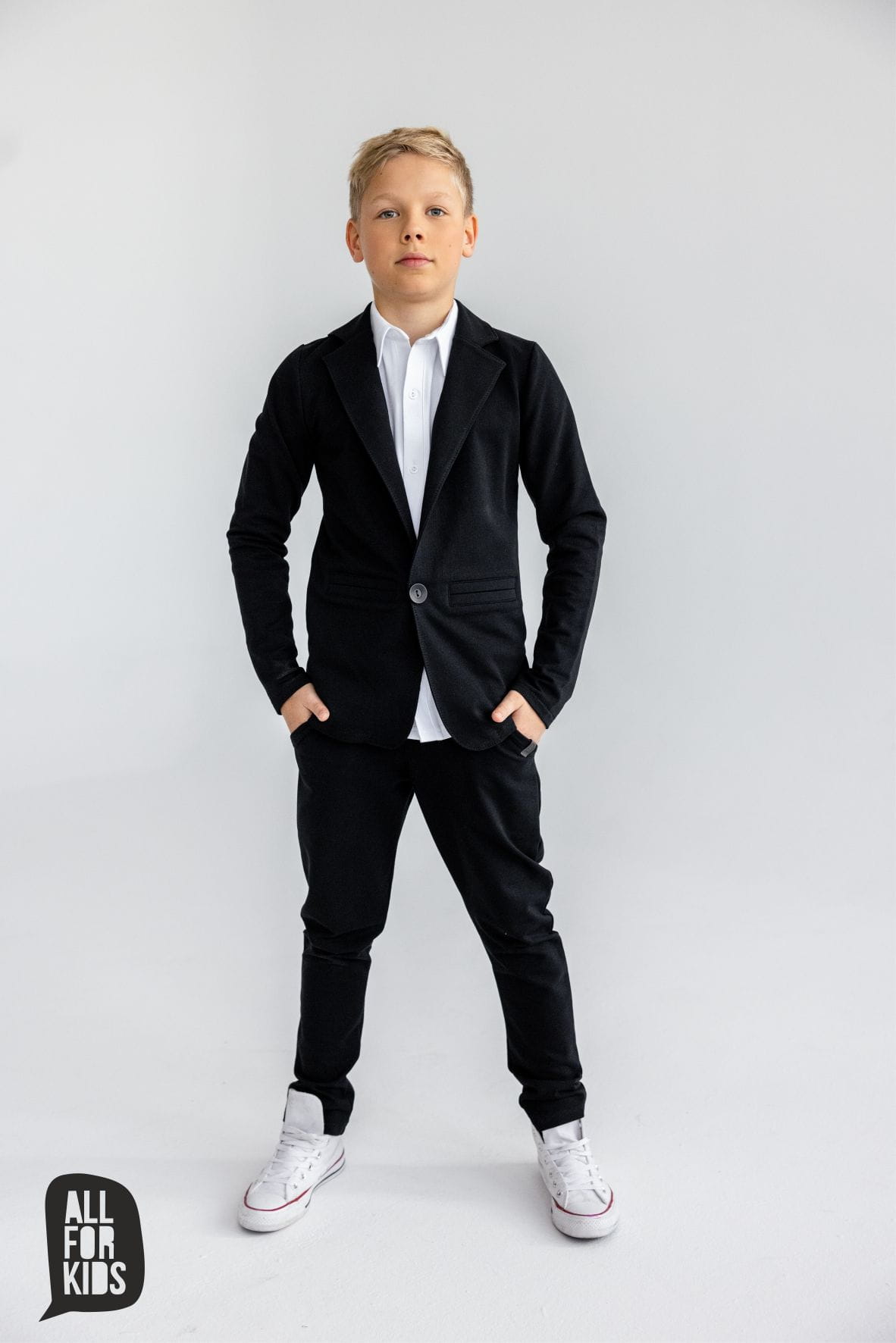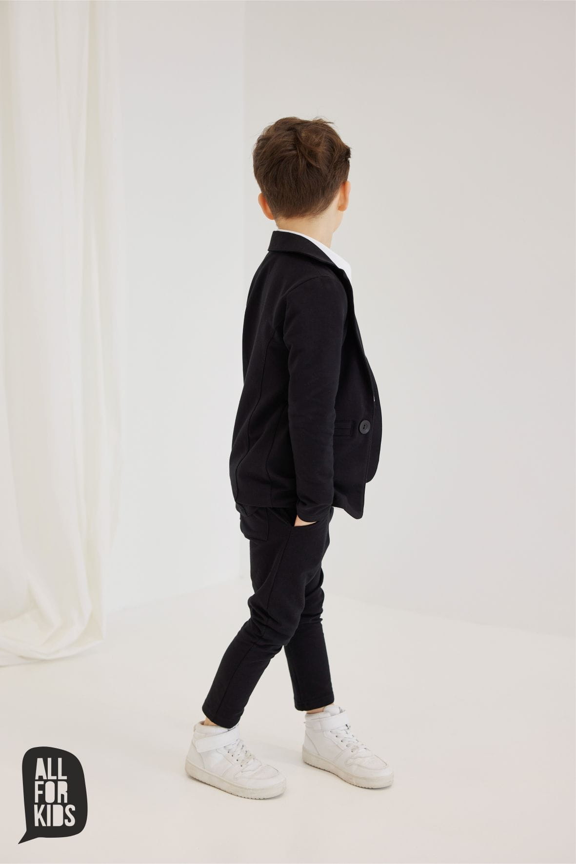 Czarna marynarka dla fanów sportowej elegancji. Modna marynarka chłopięca powstała w Polsce przez markę All For Kids z dzianiny dresowej, przez co jest przyjemna w kontakcie ze skórą i komfortowa w noszeniu.