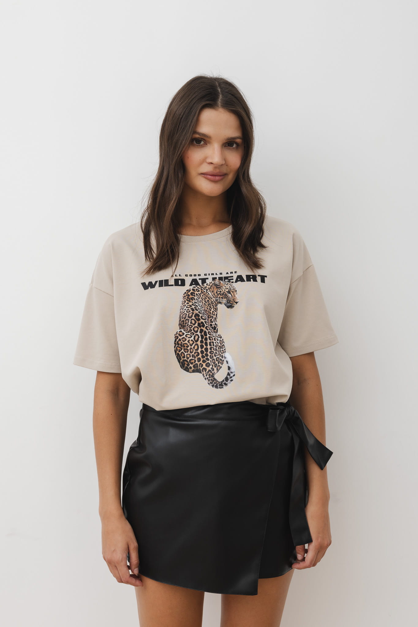 Z przodu t-shirtu znajduje się napis „ALL GOOD GIRLS ARE WILD AT HEART”, który podkreśla Twoją osobowość i pewność siebie. Dodatkowo, grafika geparda nadaje całości niepowtarzalnego charakteru, przyciągając wzrok i dodając odrobinę dzikości do każdej stylizacji.