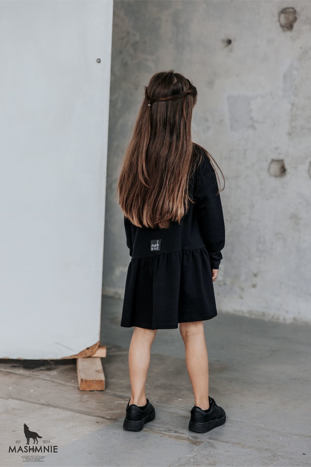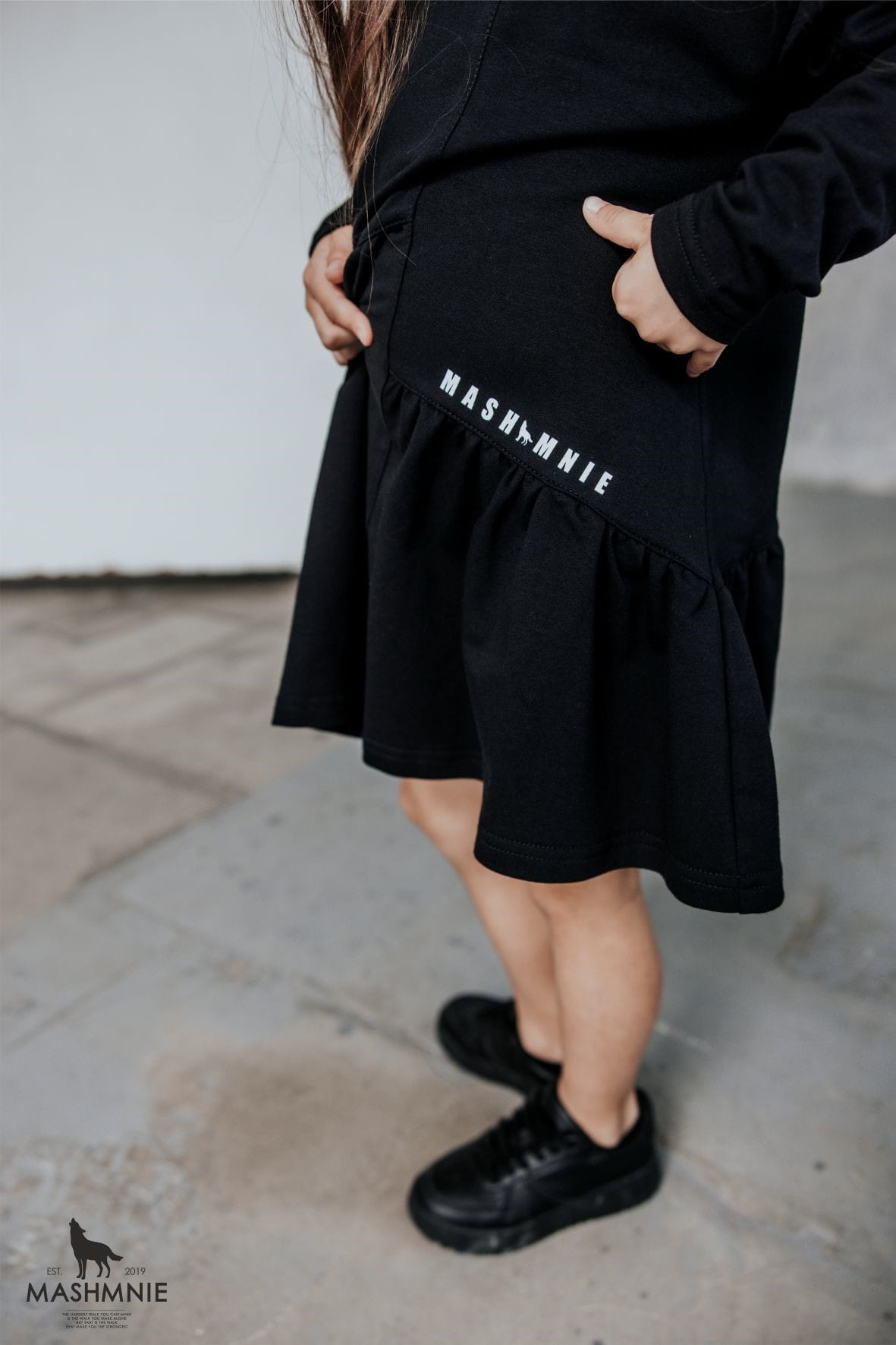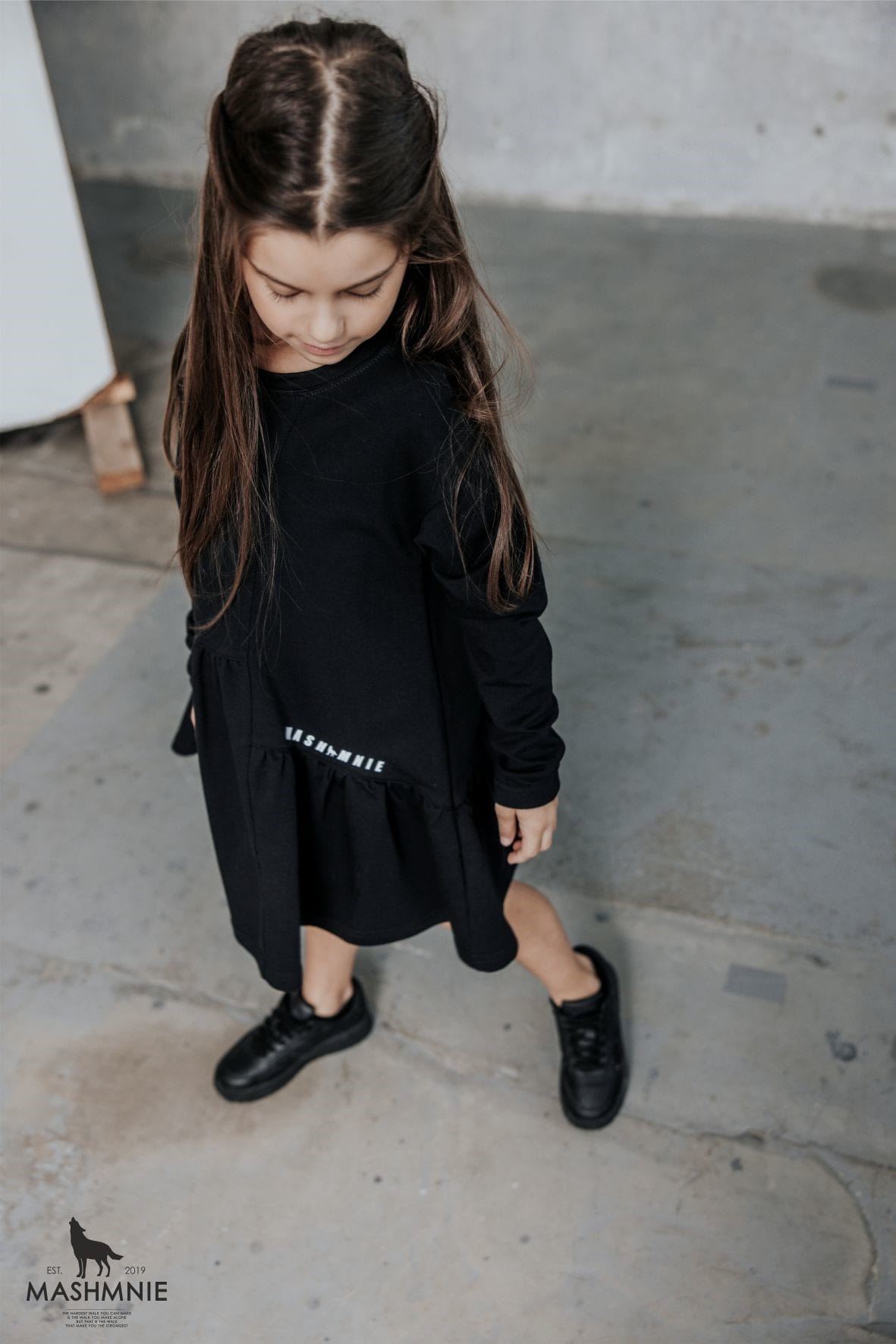 Czarna sukienka z falbanką od polskiej marki MashMnie z kolekcji WOLF NATURE to stylowy element dziewczęcej garderoby.