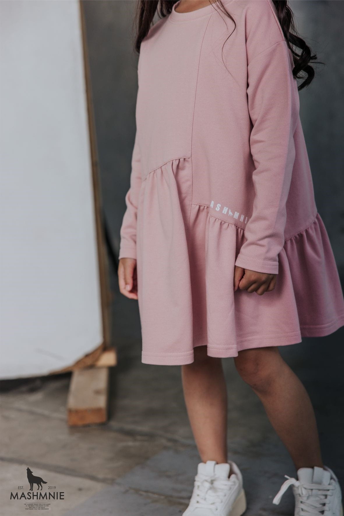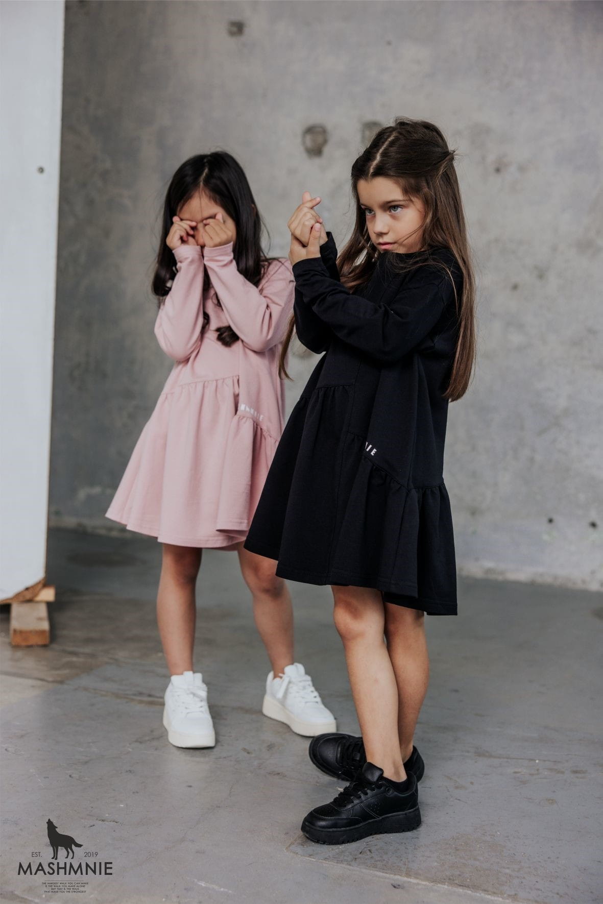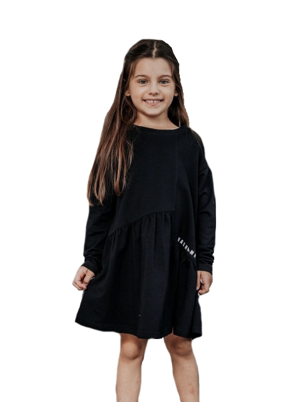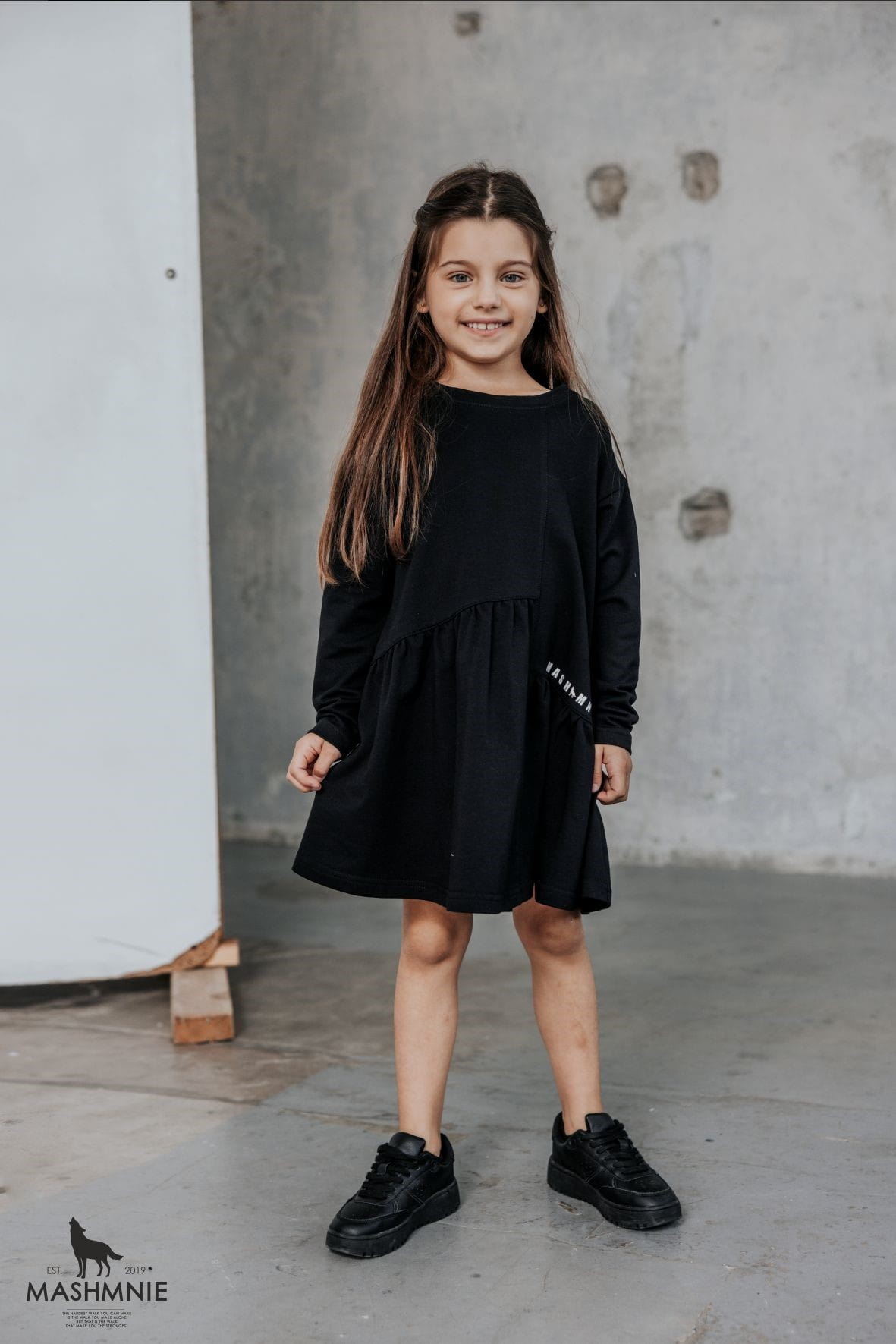Czarna sukienka z falbanką od polskiej marki MashMnie z kolekcji WOLF NATURE to stylowy element dziewczęcej garderoby.