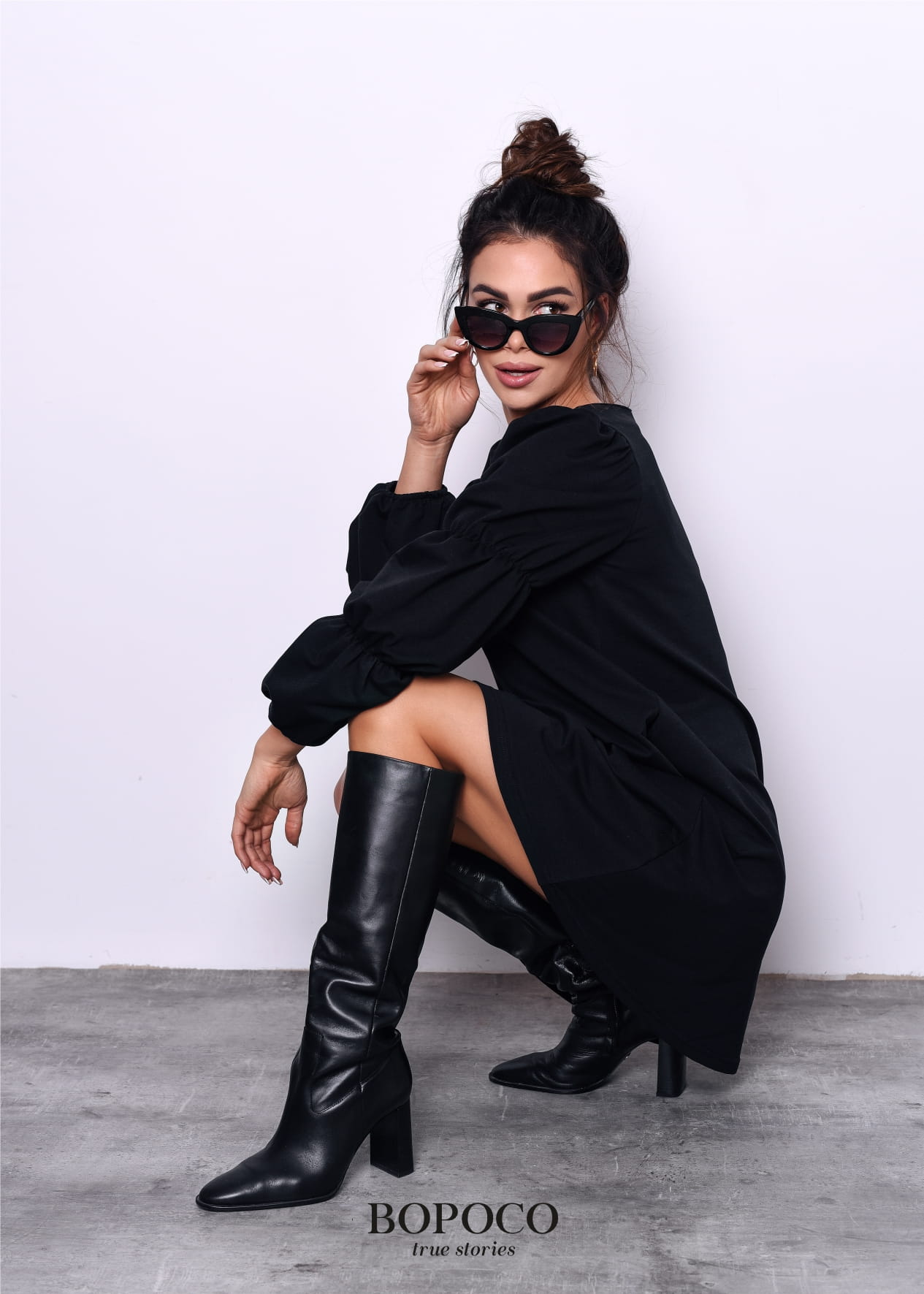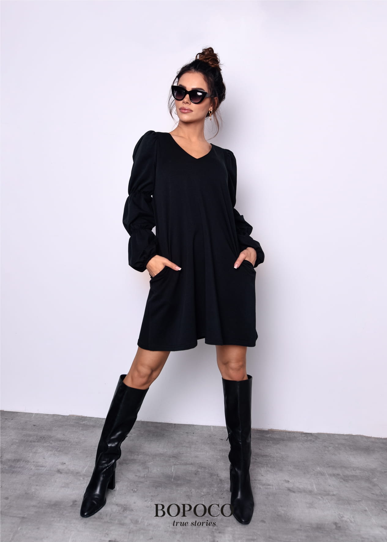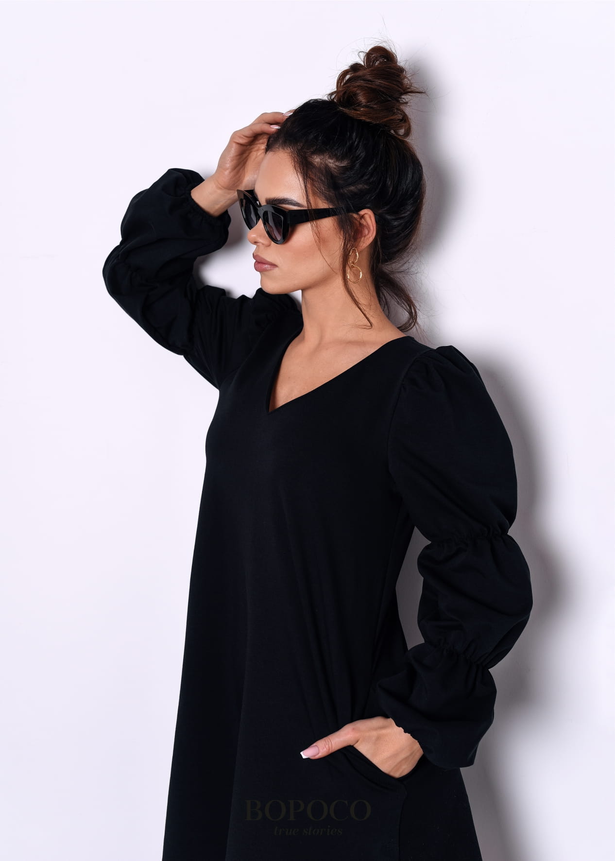 Czarna sukienka z ozdobnymi rękawami powstała w Polsce przez markę BOPOCO true stories z komfortowej w noszeniu dzianiny dresowej (delikatna pętelka od spodu).