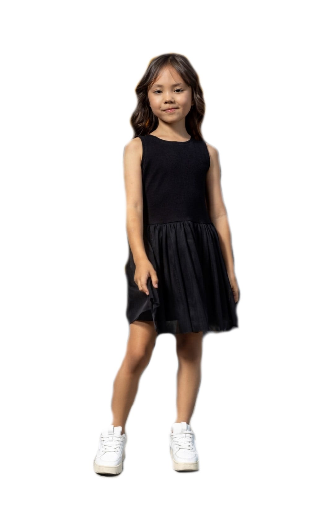 Modna sukienka dla dziewczynki wykonana jest z miękkiej bawełny dresowej, co zapewnia komfort noszenia i swobodę ruchów. Sukienka ma rękawy na grubych ramiączkach, co dodaje jej nowoczesnego charakteru i sprawia, że wygląda stylowo.