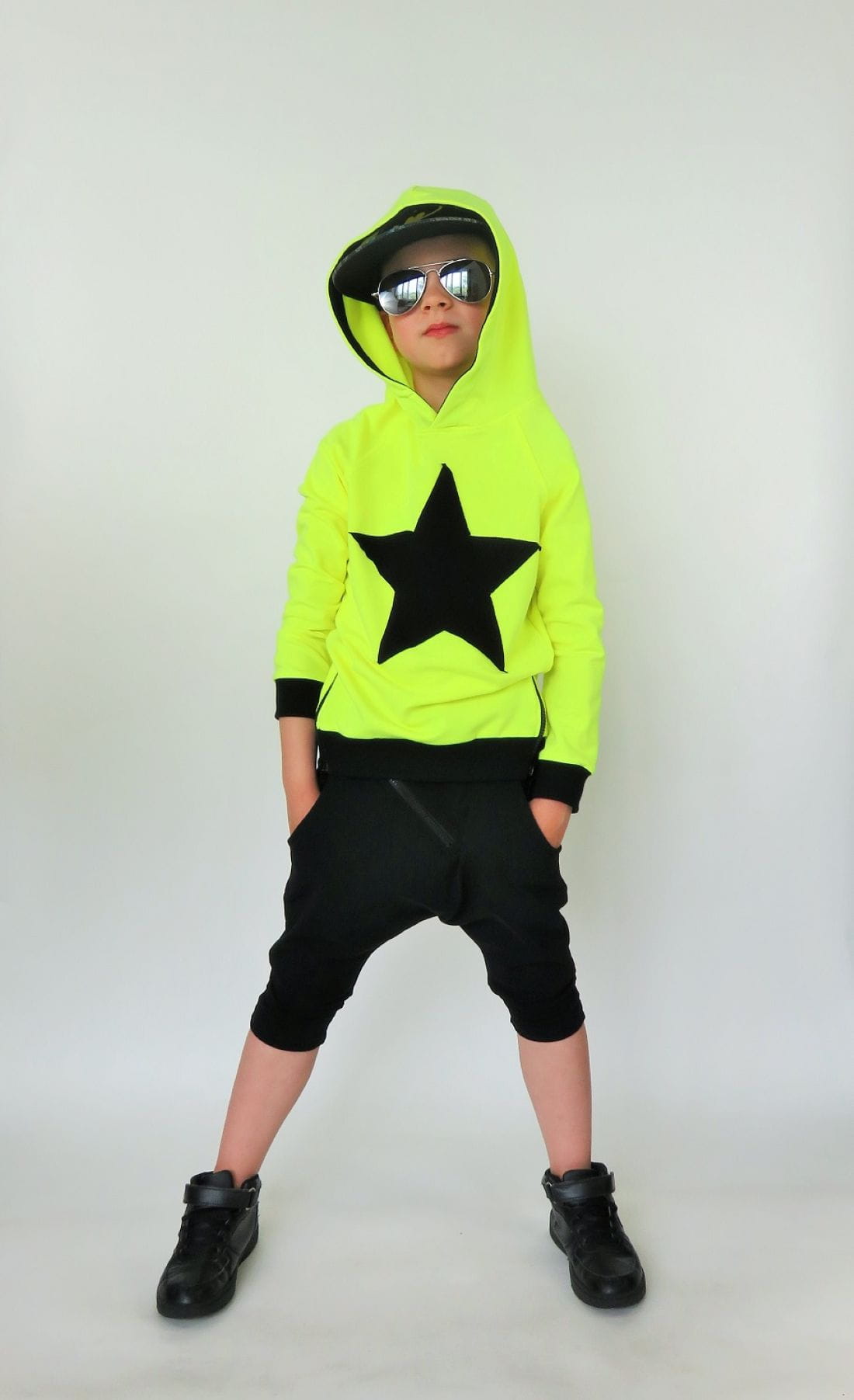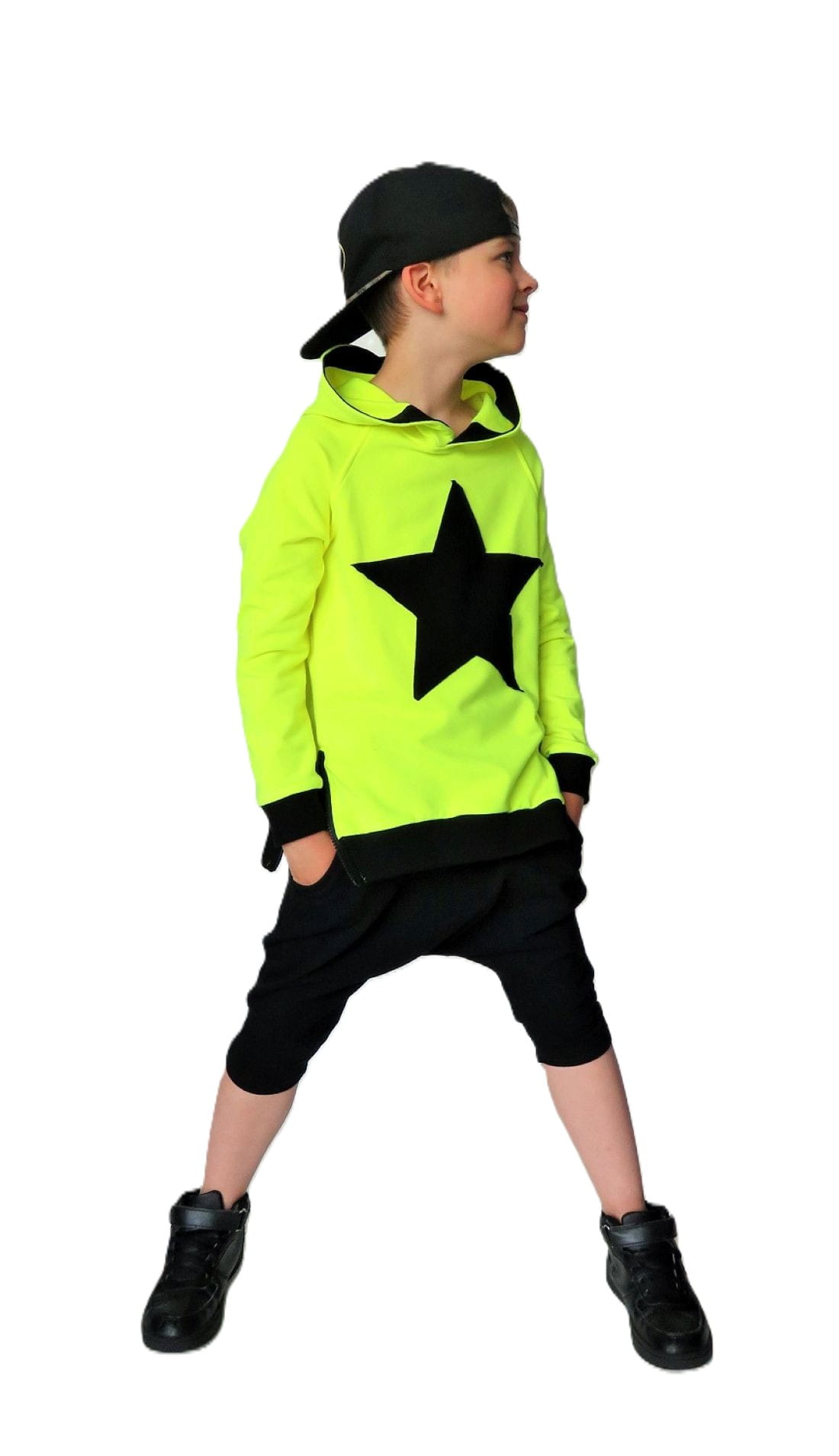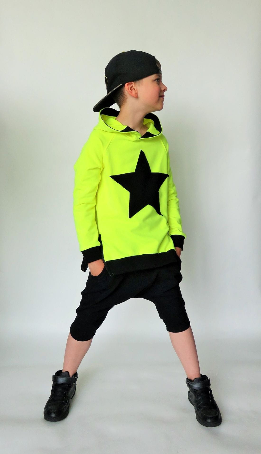 Czarne spodenki baggy typu rybaczki. Modne spodenki dziecięce uszyte w Polsce z komfortowej w noszeniu bawełny (delikatna pętelka od spodu).