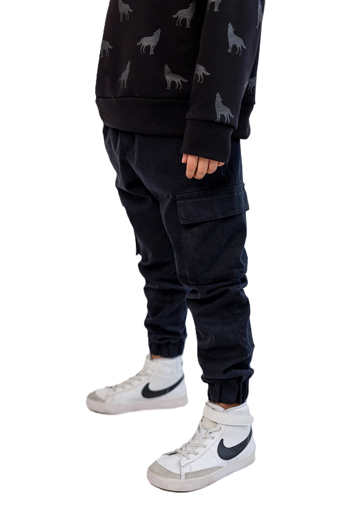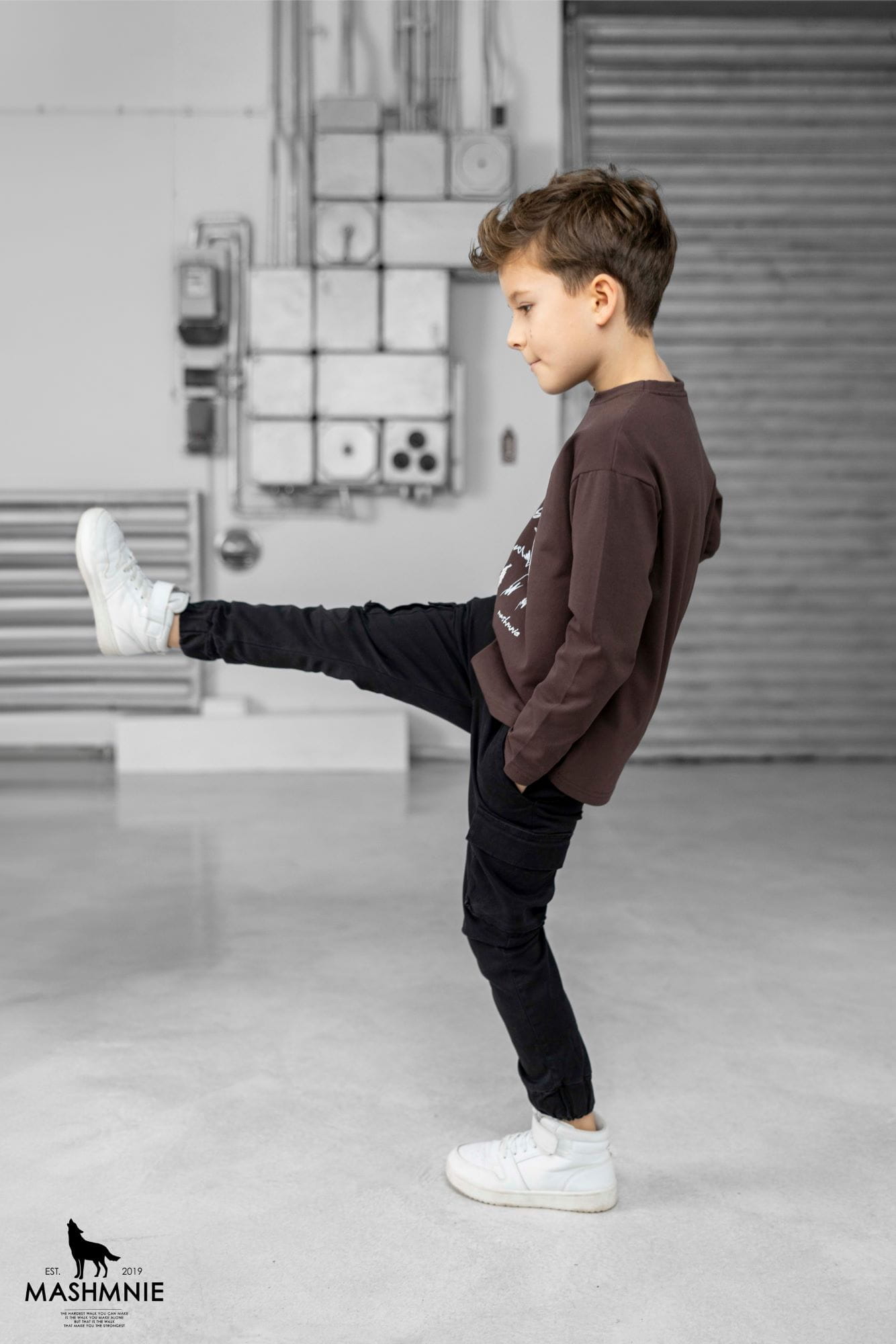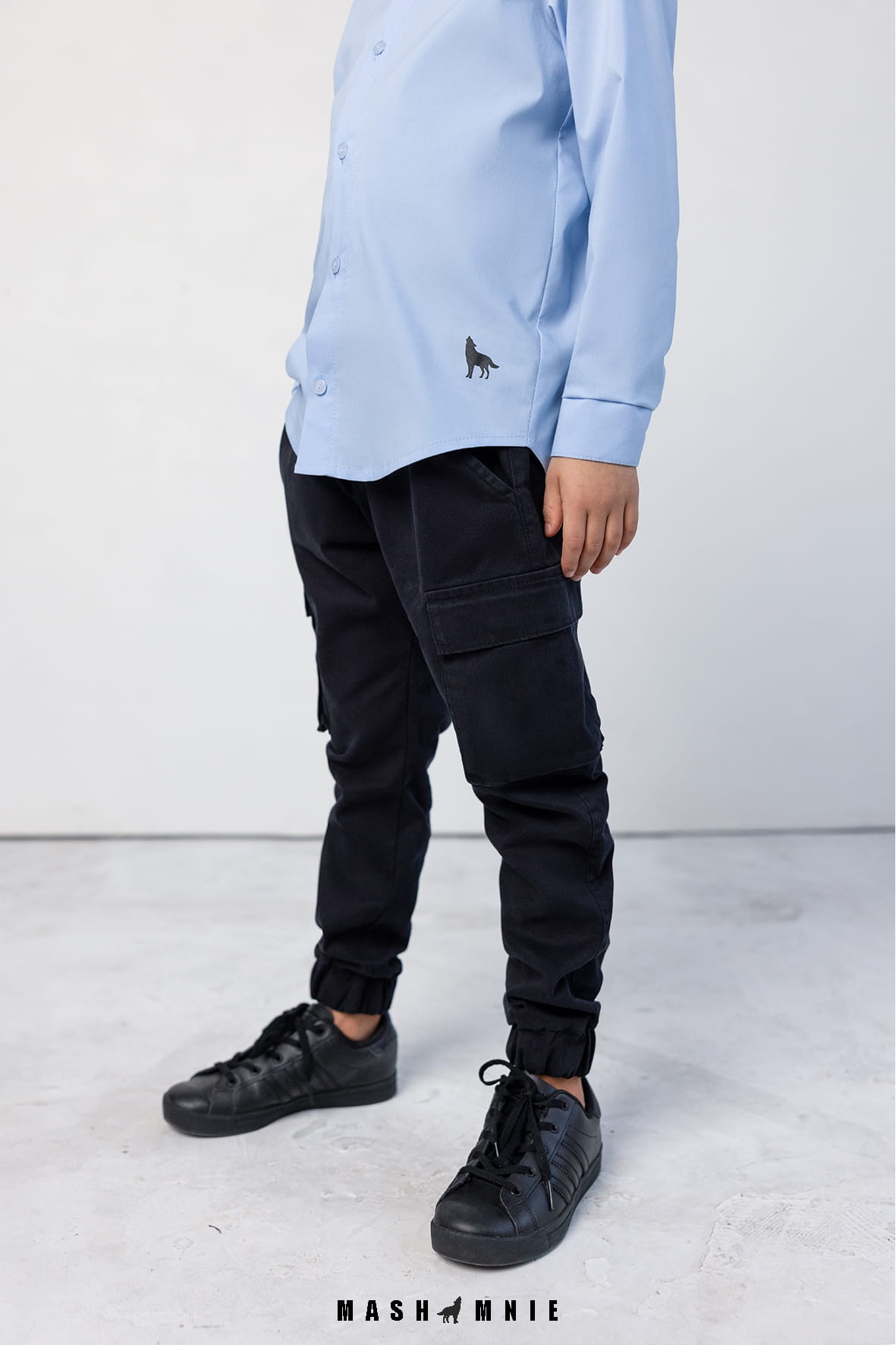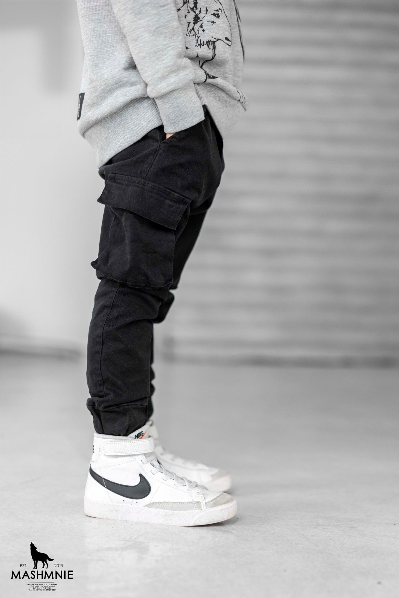 Czarne spodnie bojówki to modny i stylowy element dziecięcej garderoby. Powstały przez polską markę Mash MNIE z komfortowej w noszeniu tkaniny.