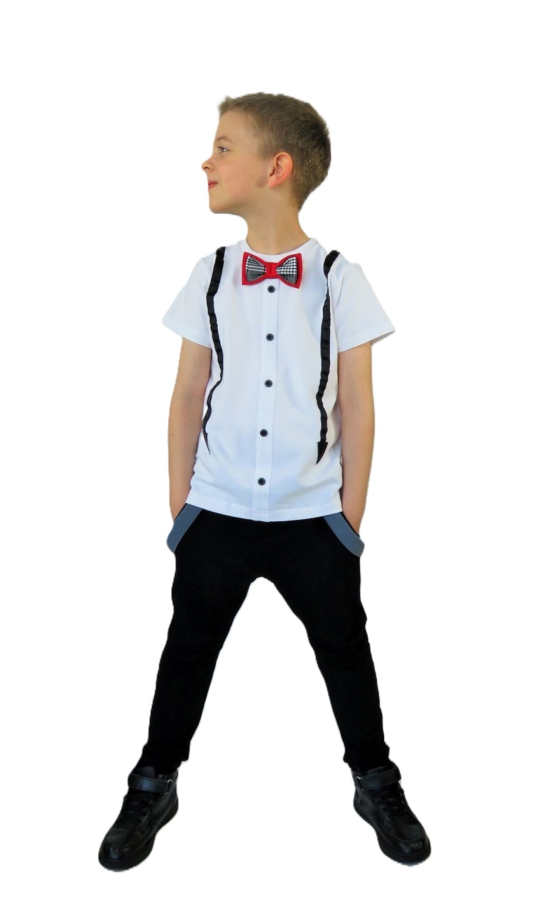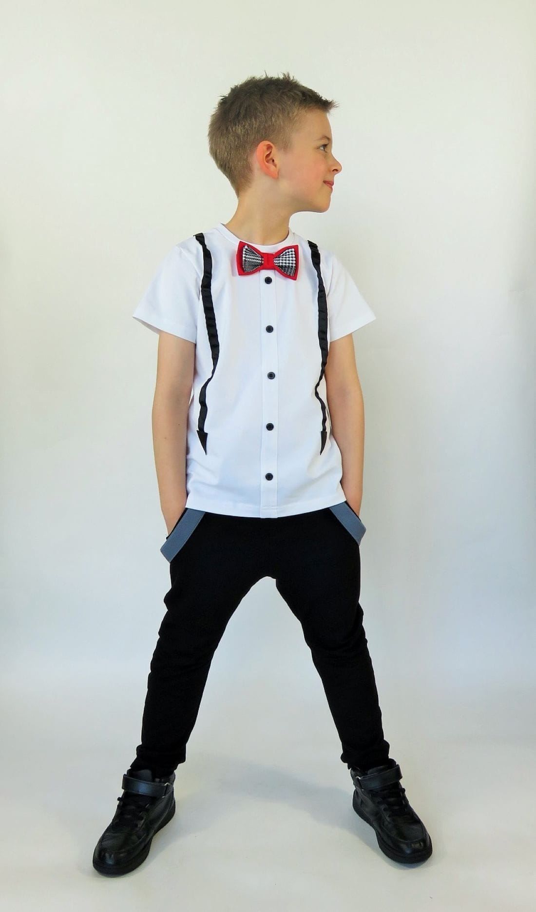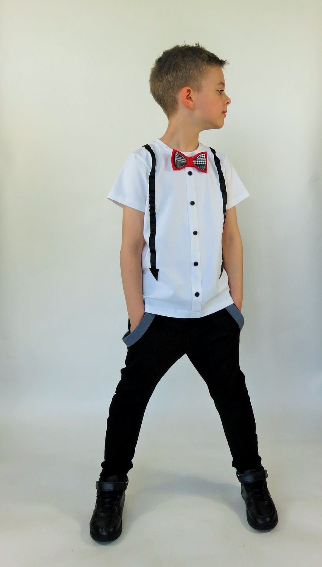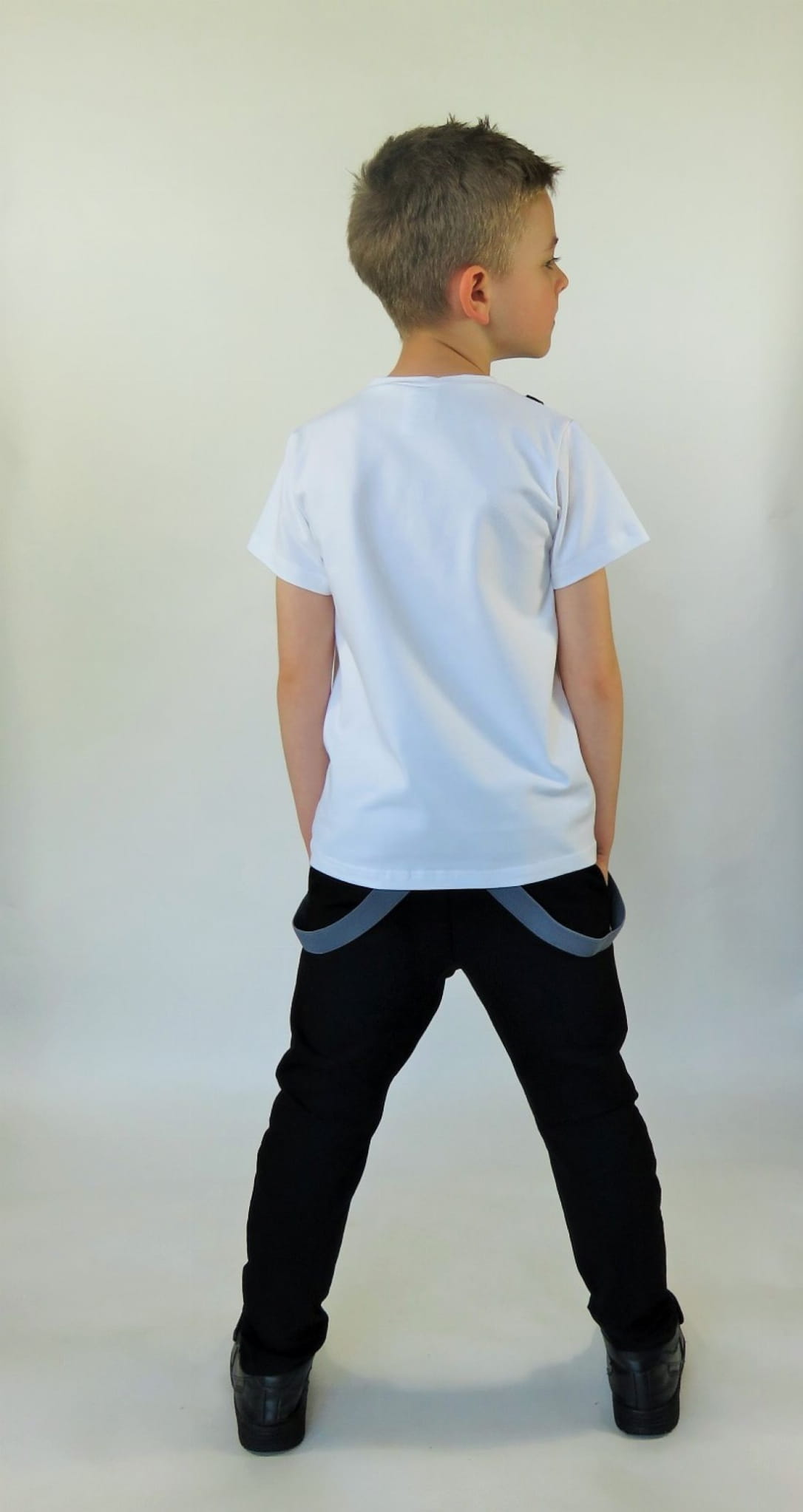 Czarne spodnie z szelkami dla fanów sportowej elegancji. Modne spodnie dziecięce wykonane z komfortowej w noszeniu dzianiny dresowej (delikatna pętelka od spodu).