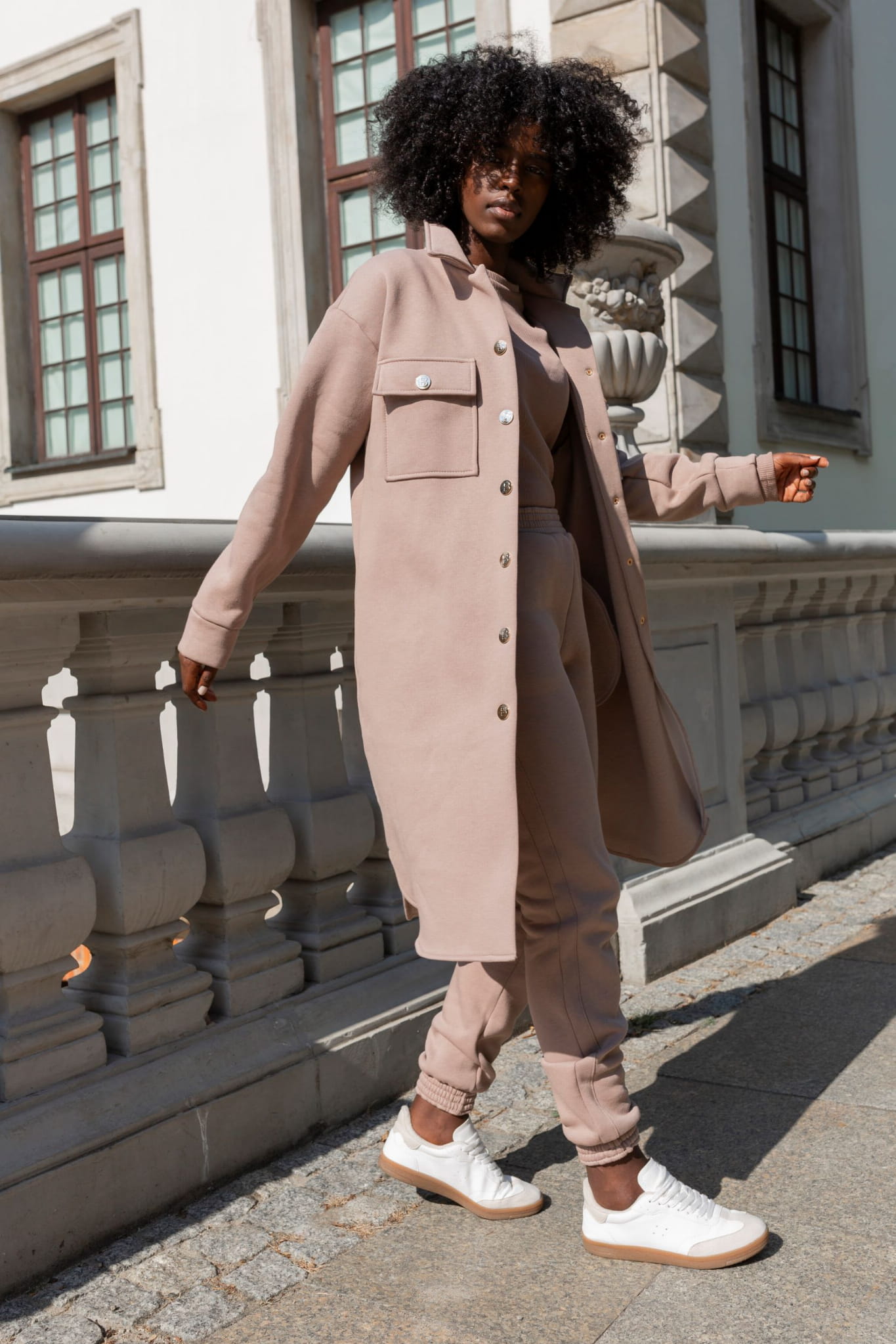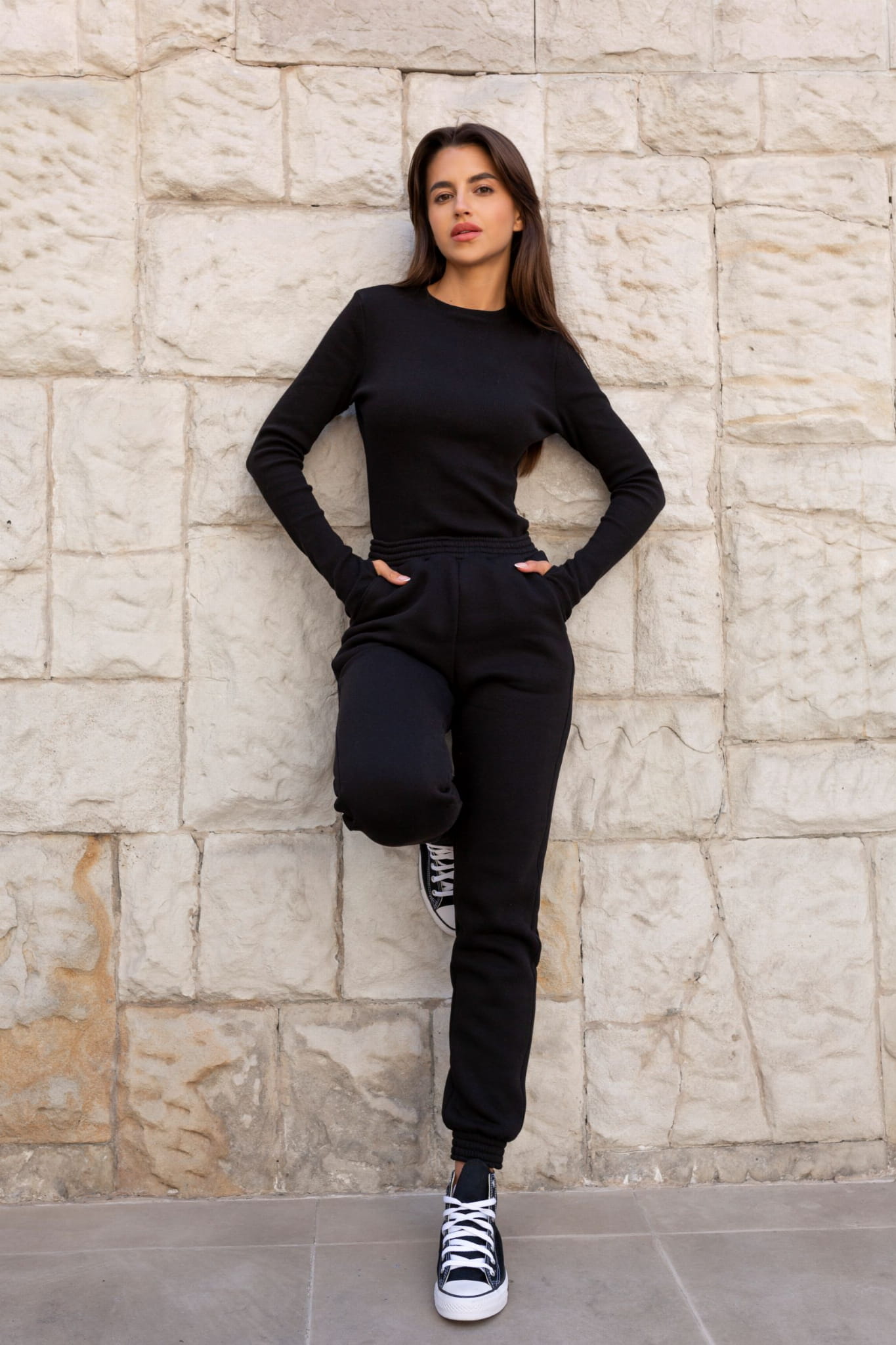 Spodnie i katana wykonane są z wysokiej jakości bawełny, ocieplonej od spodu delikatnym meszkiem, co zapewnia komfort i ciepło w chłodniejsze dni. Bluzka, uszyta z prążkowanej bawełny, idealnie podkreśla sylwetkę, a otwór na kciuk dodaje nowoczesnego charakteru i funkcjonalności.
