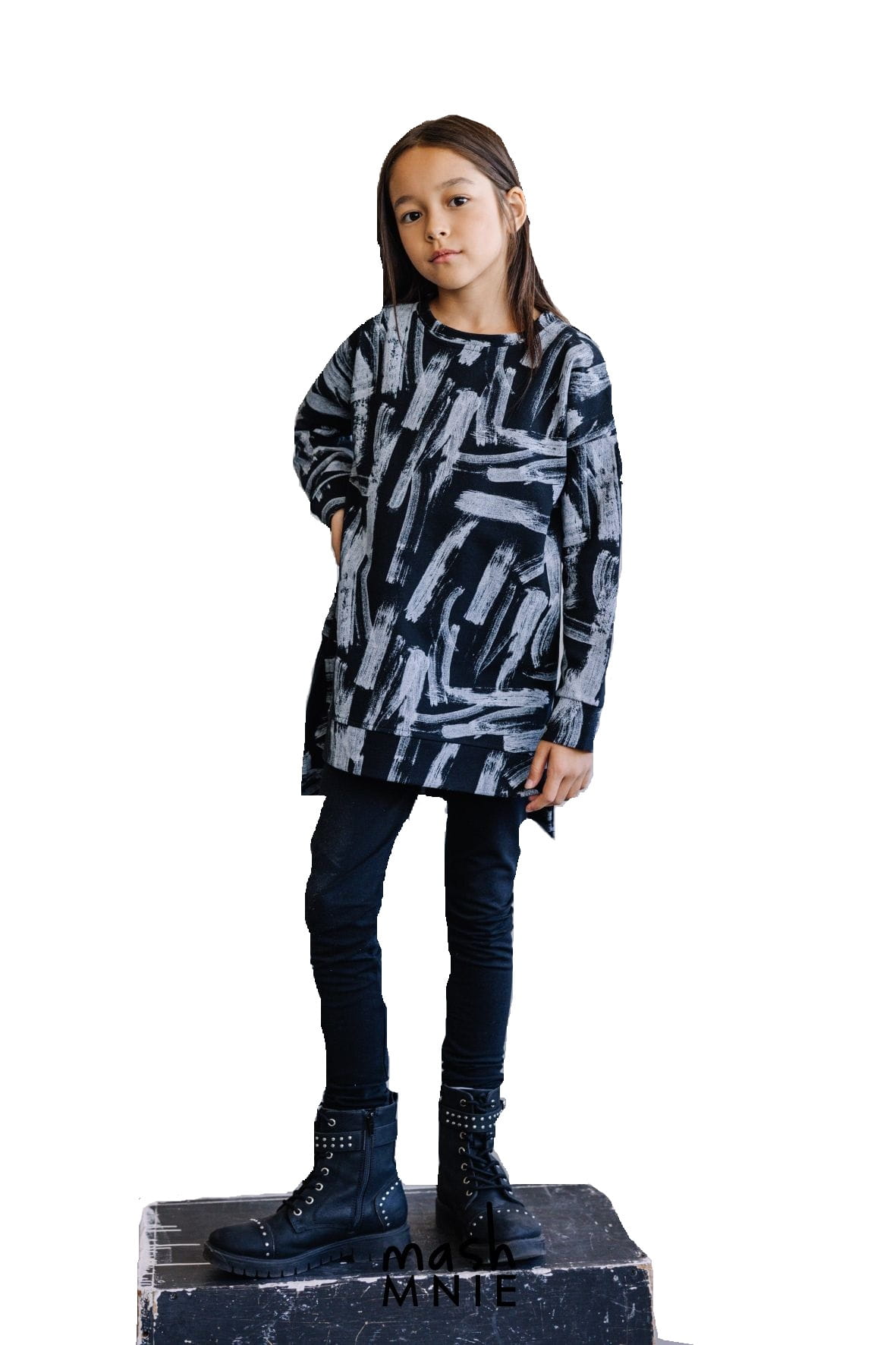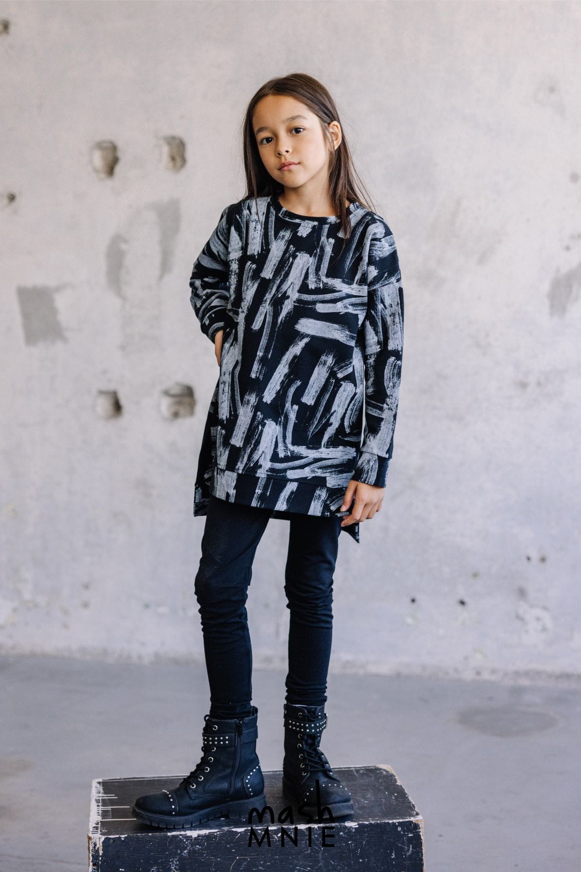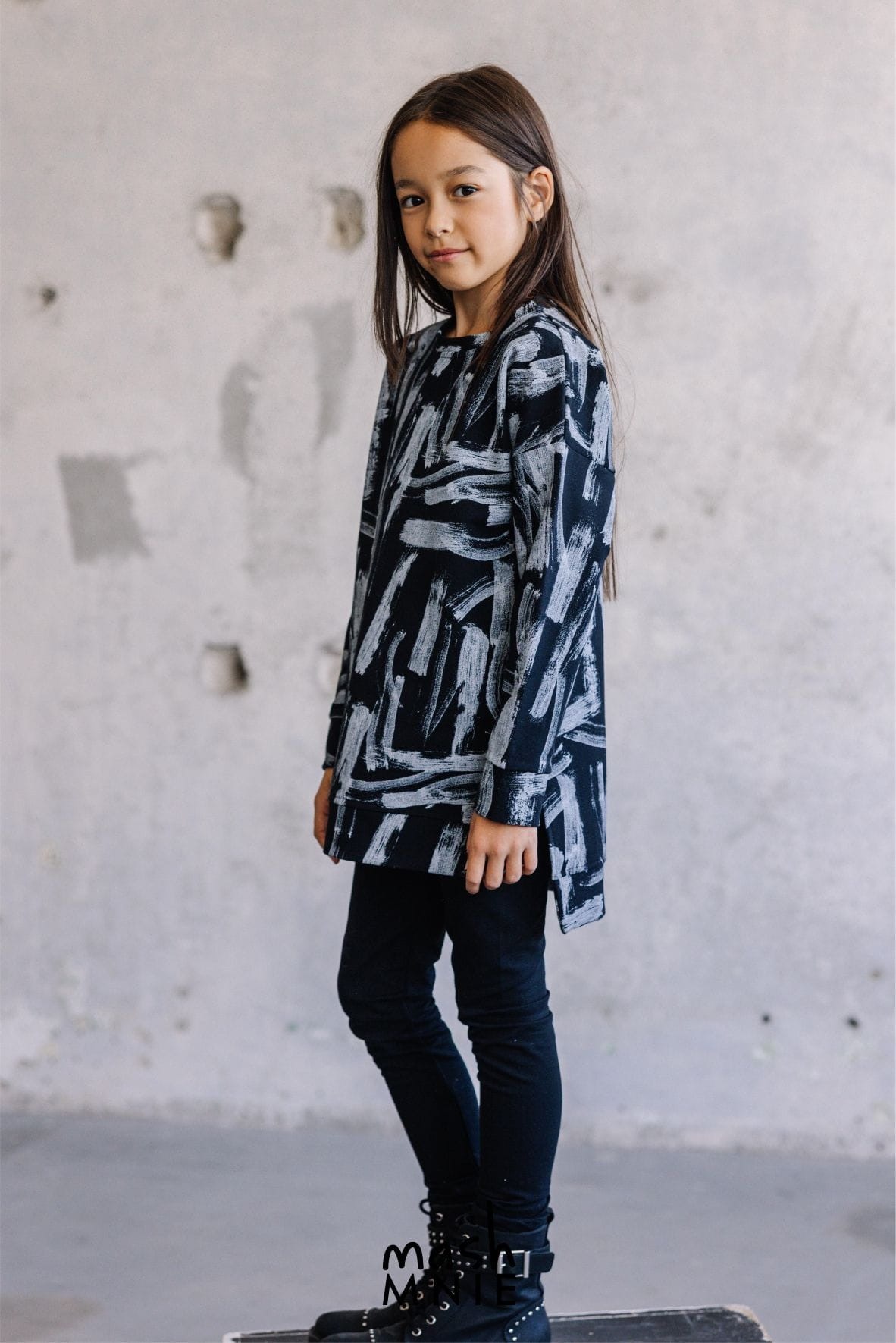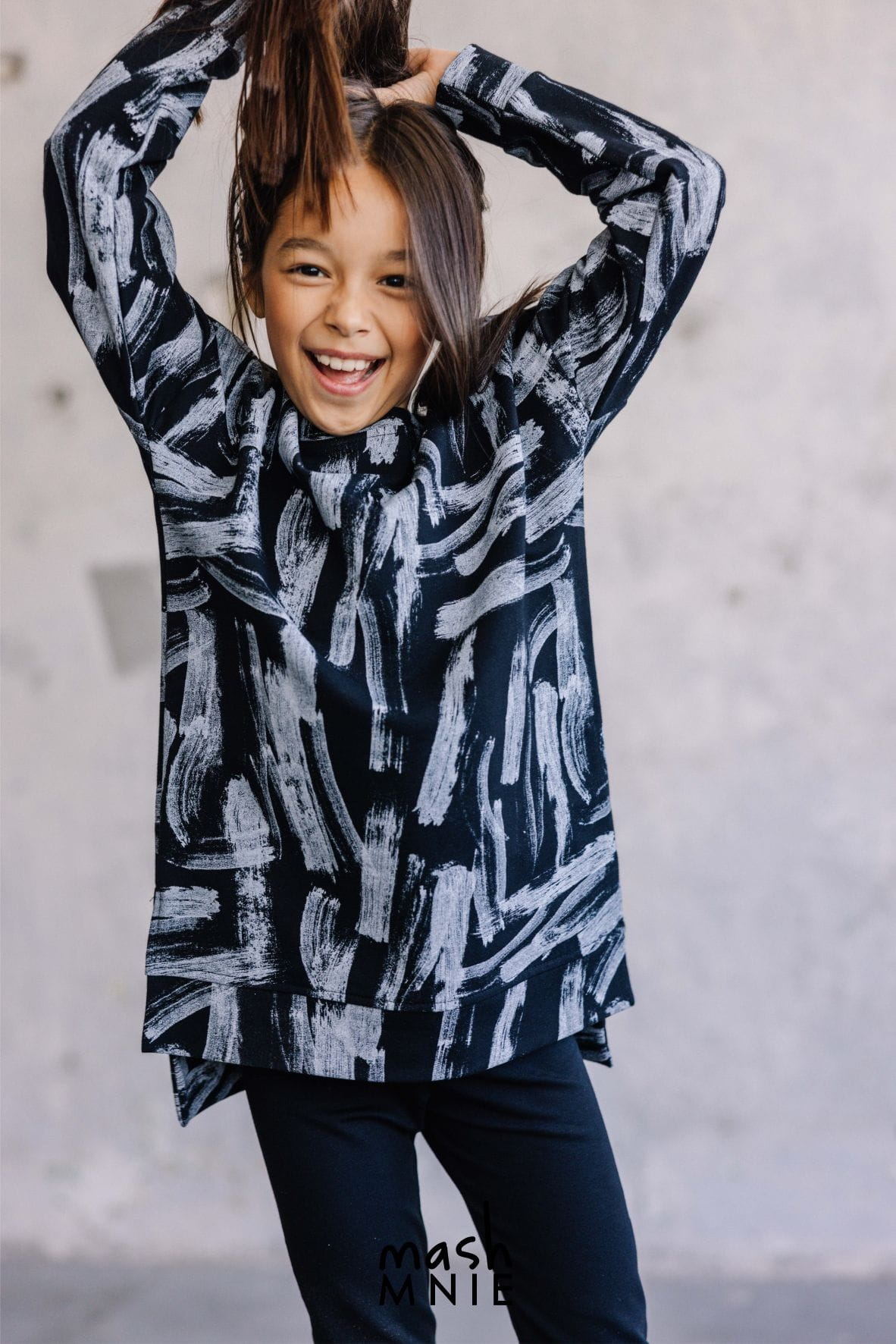 Długa bluza dresowa dla dziewczynek lubiących styl i wygodę. Czarna bluza z grafiką powstała w Polsce przez markę Mash MNIE z wysokiej jakości, komfortowej w noszenie dzianiny dresowej.
