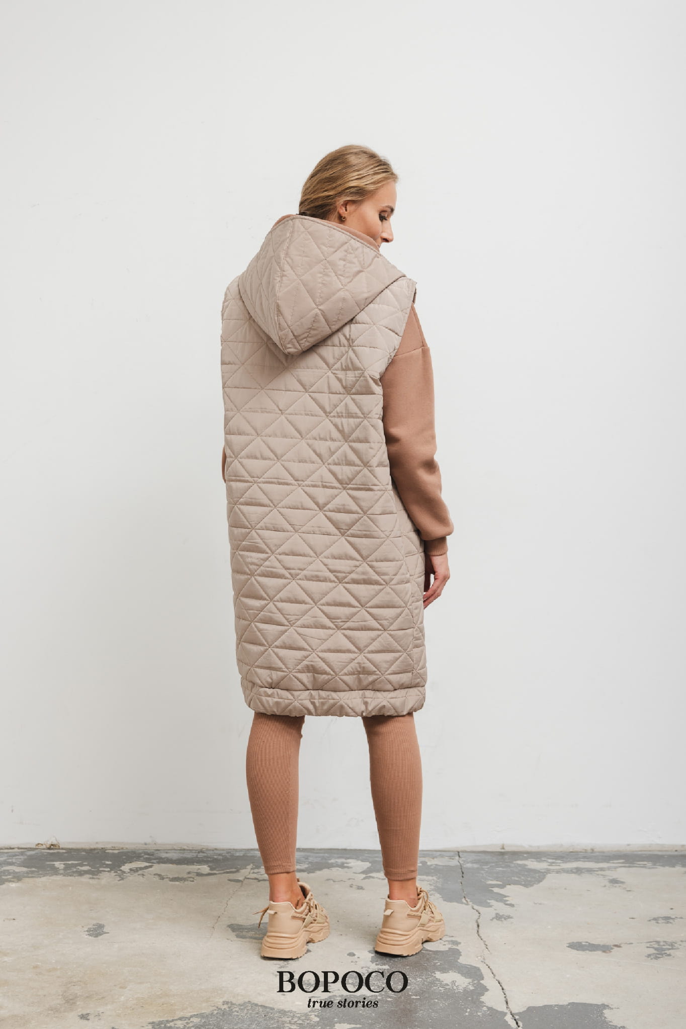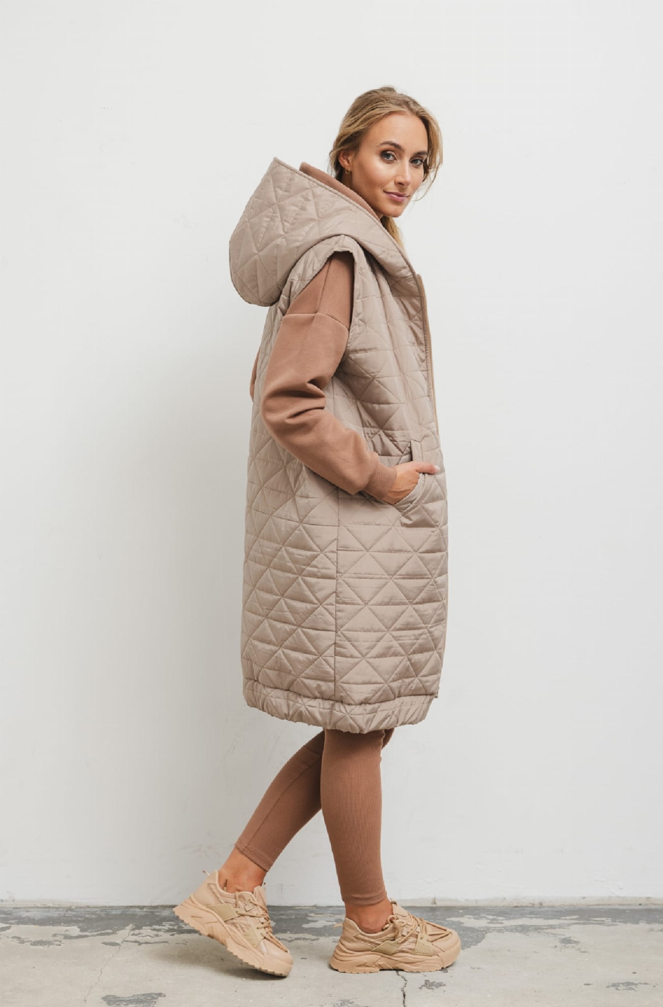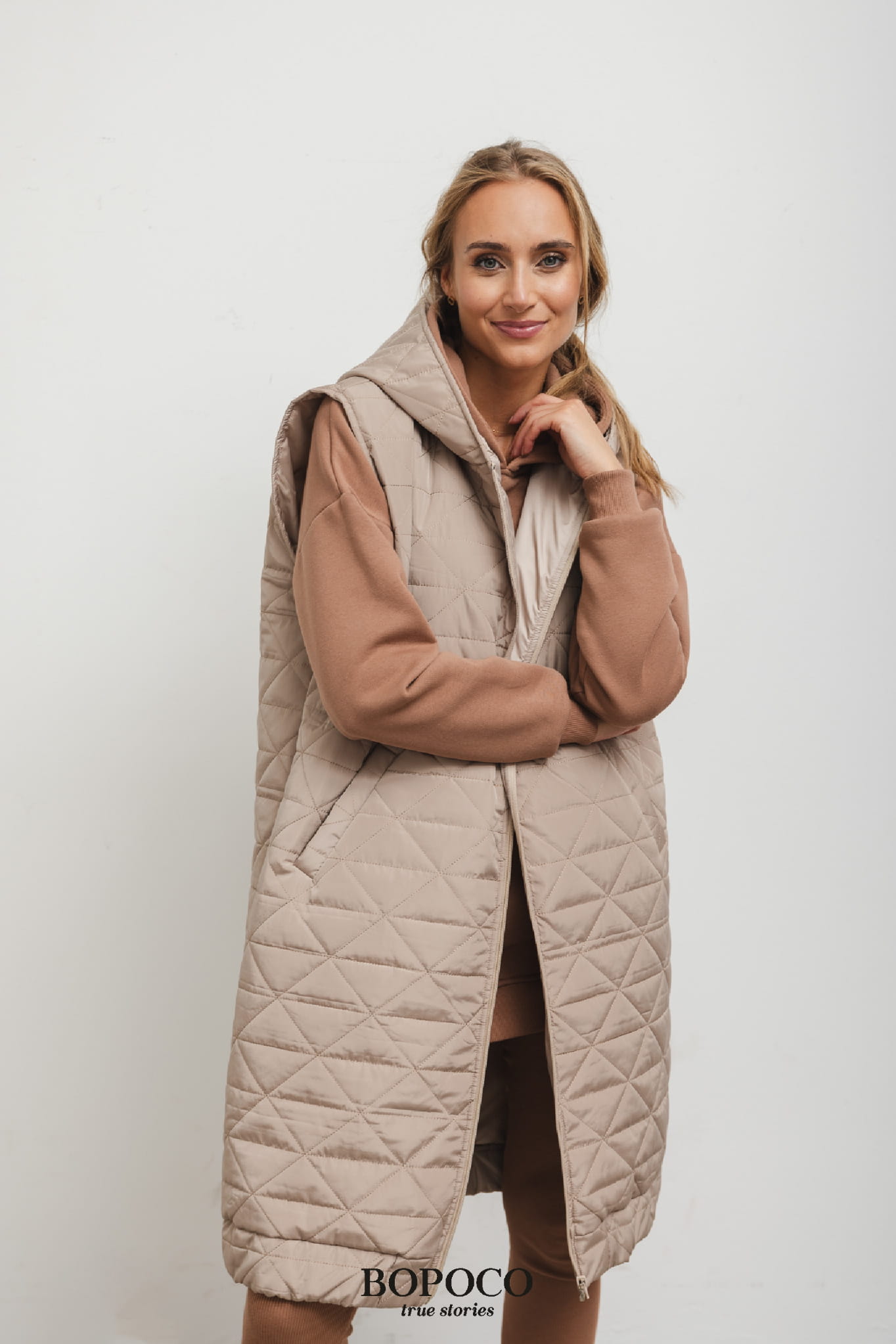Długa kamizelka z kapturem pikowana beżowa Bopoco