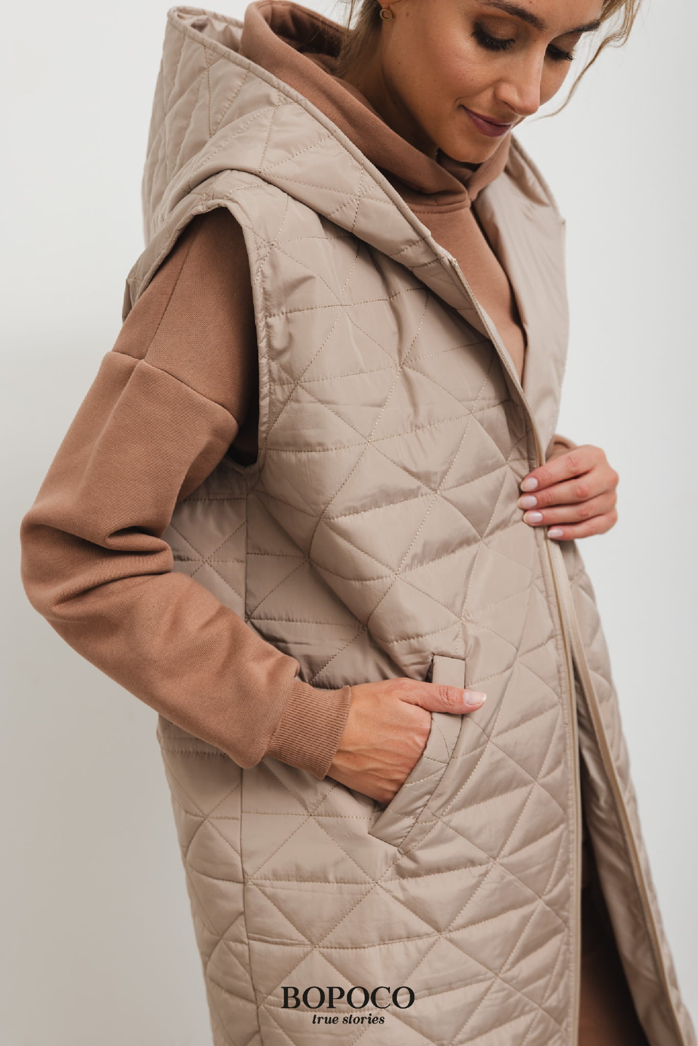 Beżowa kamizelka pikowana dla kobiet lubiących styl i wygodę. Długa kamizelka z kapturem wykonana w Polsce przez markę BOPOCO z wysokiej jakości materiałów.