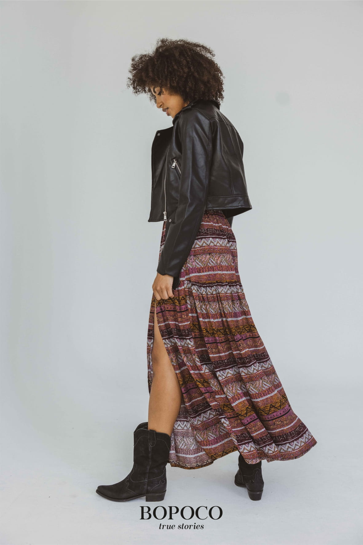 Długa spódnica z rozcięciem w różowy wzór powstała w Polsce przez marki BOPOCO true stories z wysokiej jakości, komfortowej w noszeniu wiskozy.