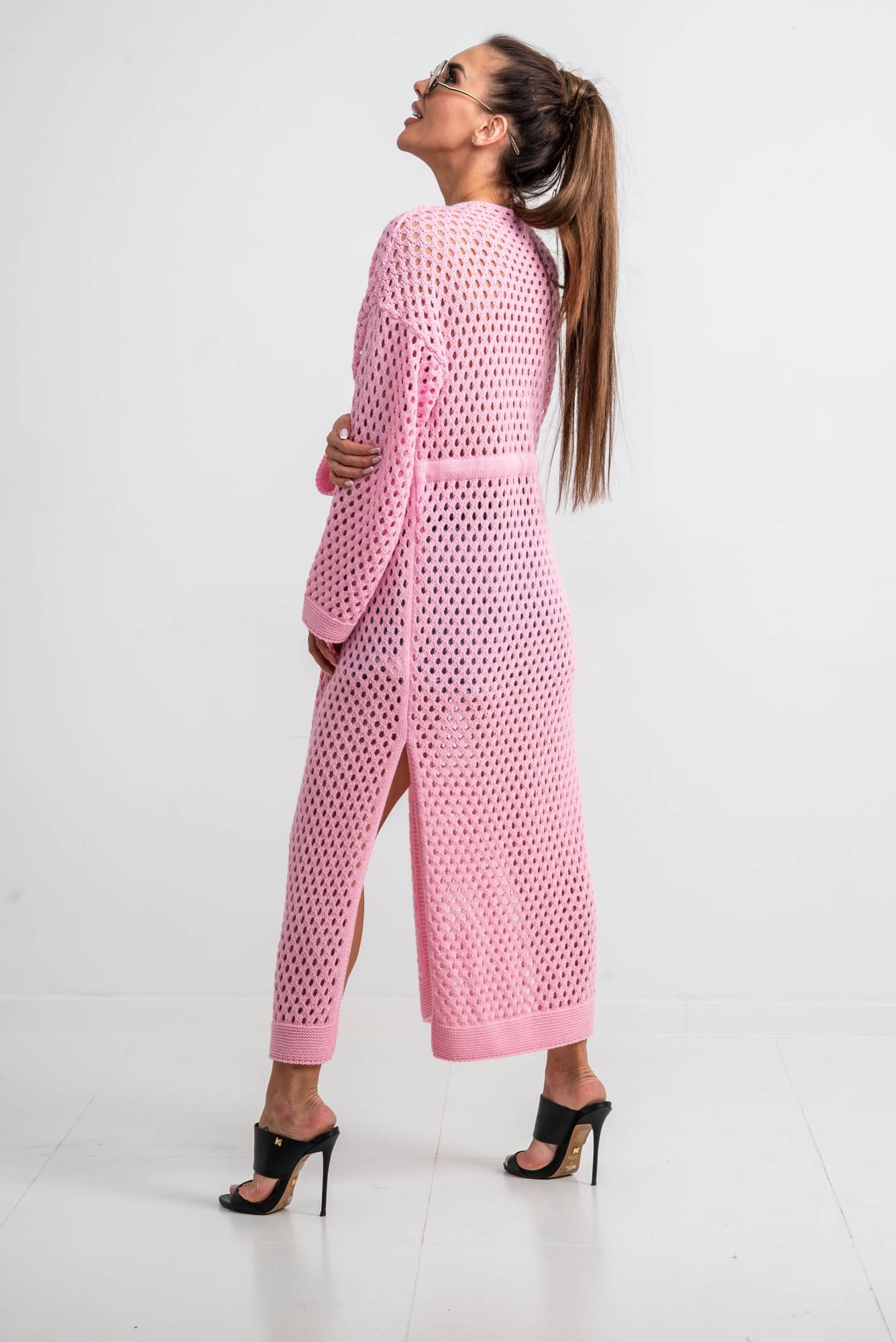 Długi kardigan ażurowy narzutka różowy TMC Moda