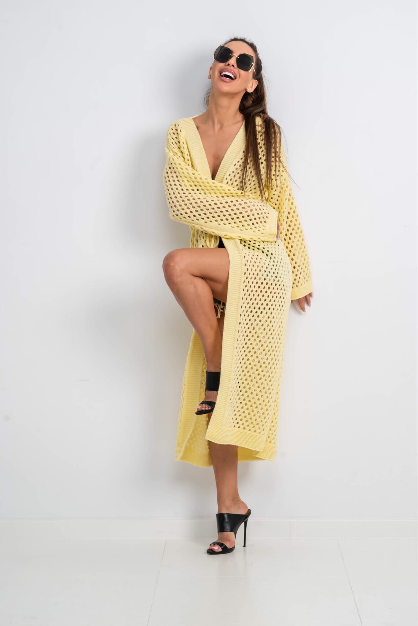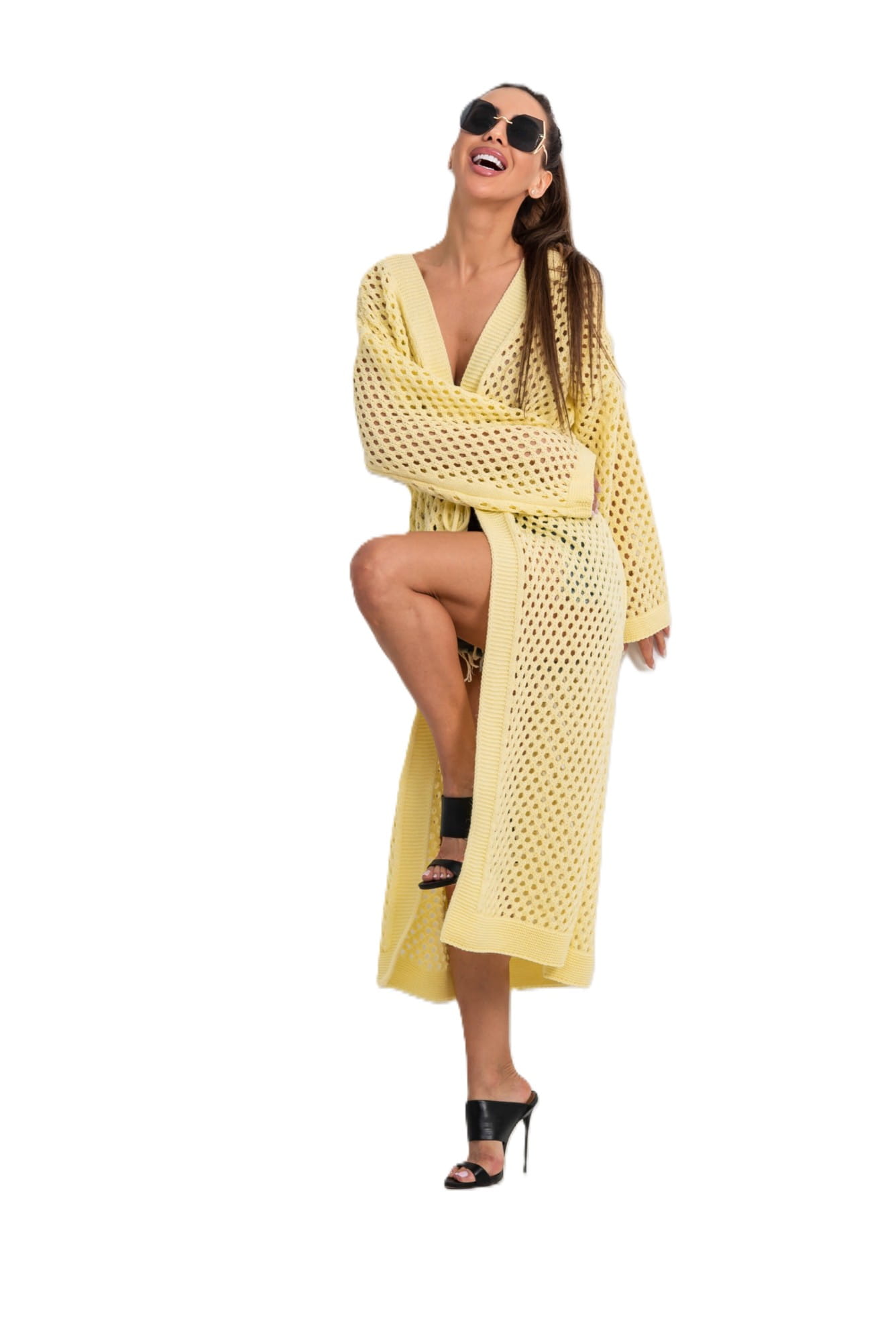 Długi kardigan ażurowy narzutka żółty TMC Moda