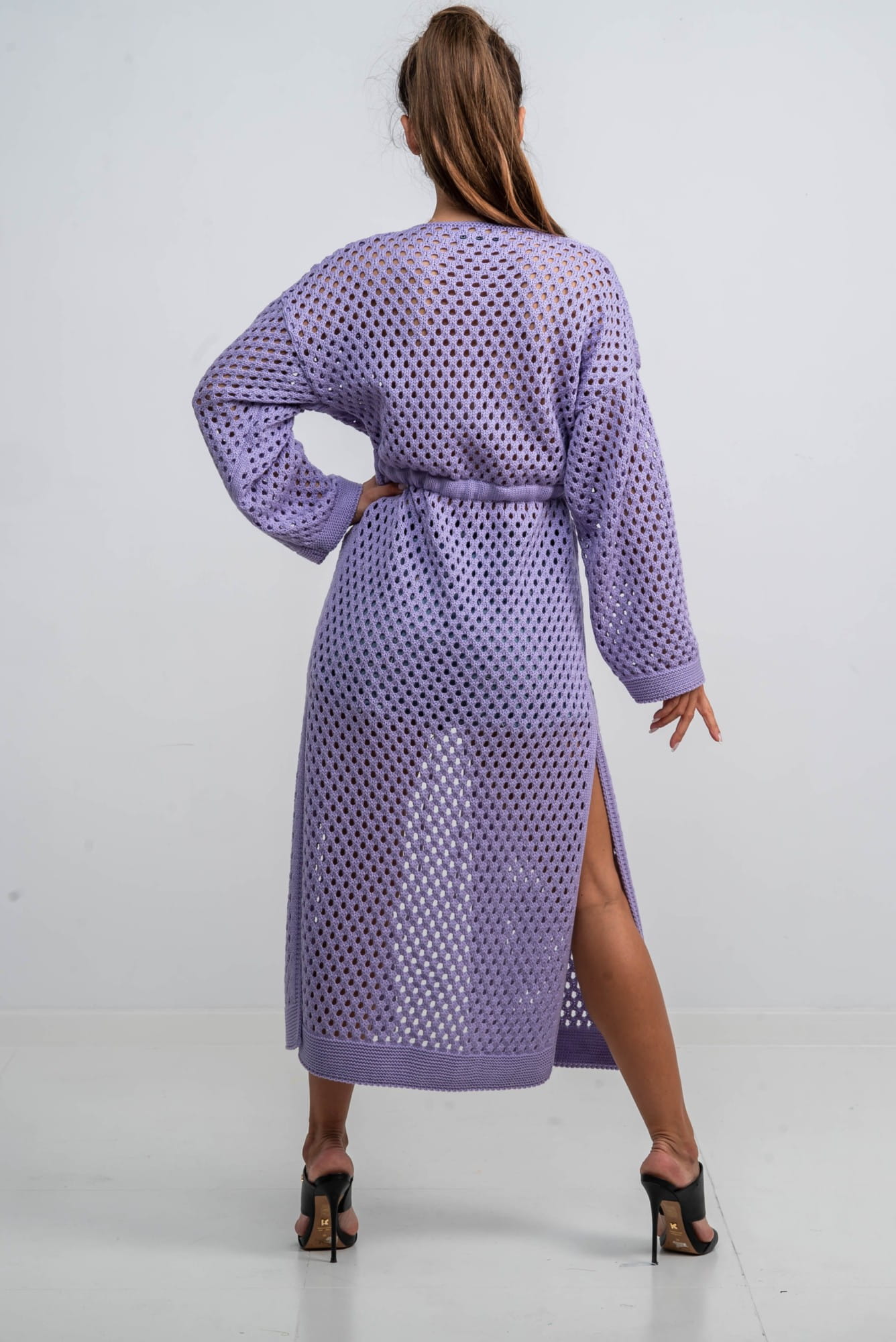 Długi sweter z dziurkami świetnie sprawdzi się jako narzutka do wielu różnych stylizacji.