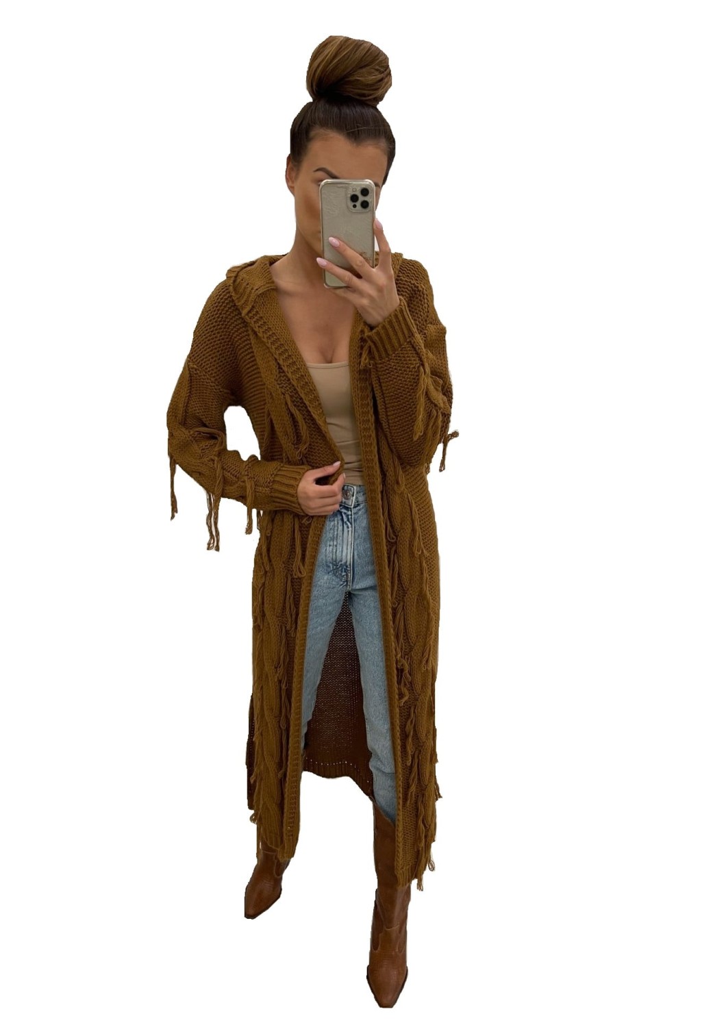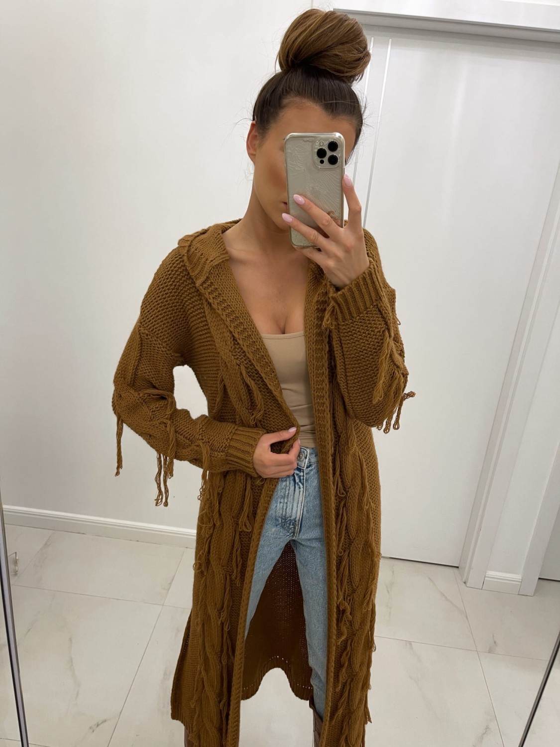 Kamelowy kardigan long to model, który przyciąga spojrzenia.